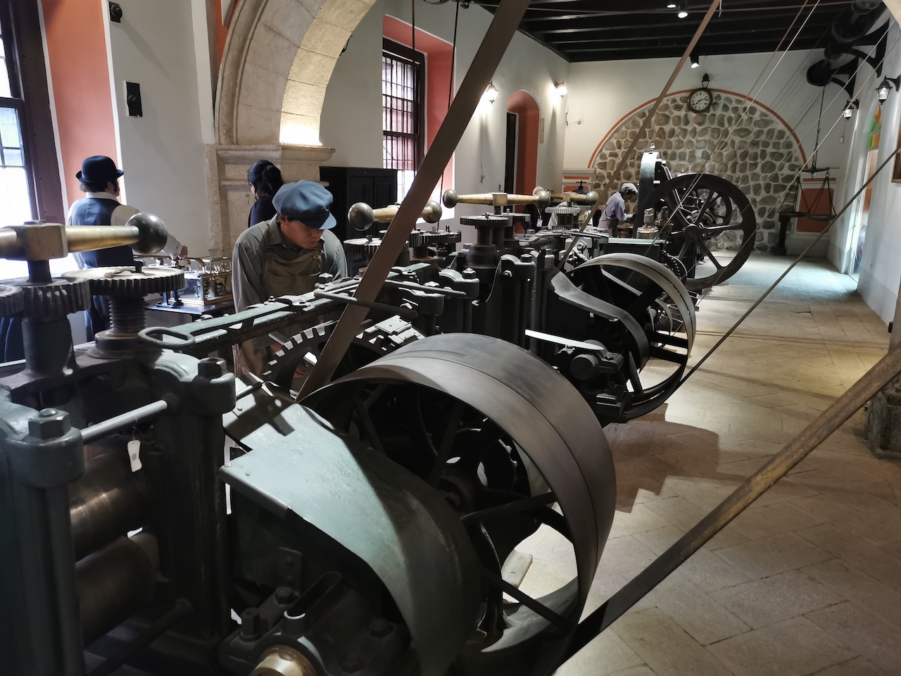 Nous continuons notre visite pour découvrir la partie industrielle du bâtiment. Les premières pièces de monnaie frappées étaient de formes peu précises (un rond un peu ondulé). Afin d’améliorer la forme, les pièces sont passées d’une composition de 80% d’argent à 75% d’argent, ce qui les a rendues plus solides et plus rondes.