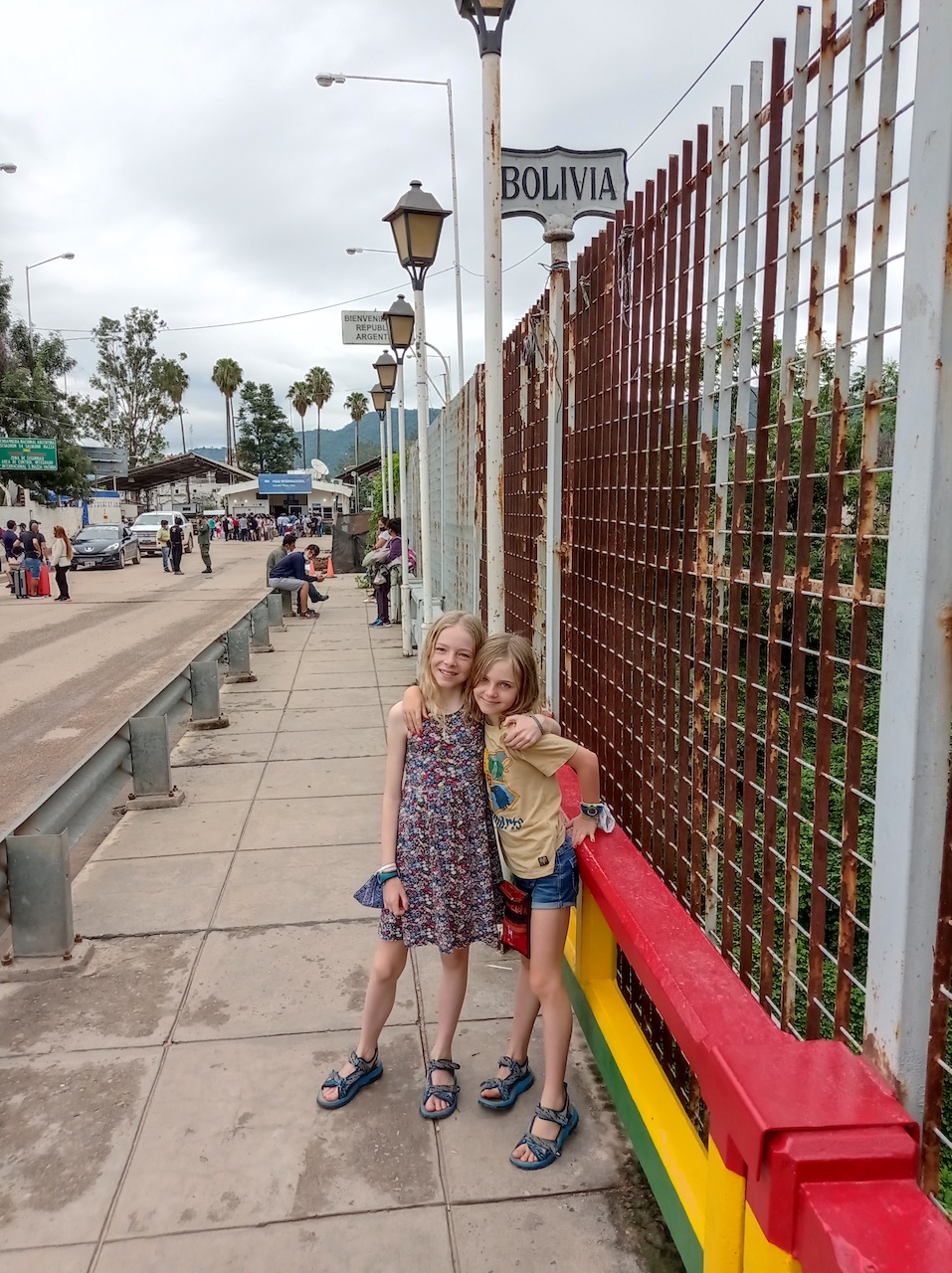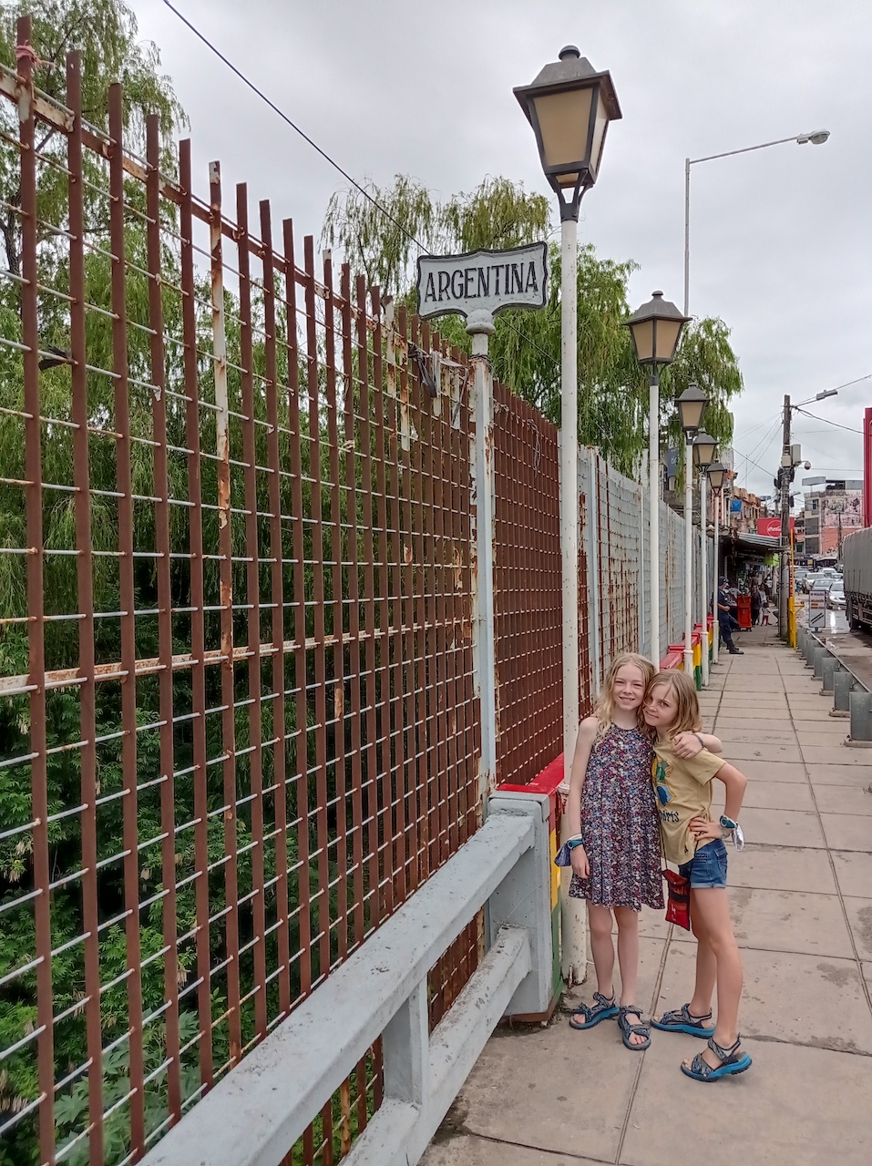 Nous nous sommes bien préparés au passage grâce aux conseils de personnes rencontrées en Bolivie ou sur les groupes Facebook des voyageurs en Bolivie/Argentine ainsi qu’avec les recherches faites sur les sites des gouvernements bolivien et argentin. Ces recherches sont toujours fastidieuses car chaque pays a ses exigences qui, en plus, changent constamment! C’est donc avec confiance que nous pensons avoir tous les justificatifs en version imprimée: copie des certificats de vaccination, copie des résultats des tests PCR des filles effectués le jour précédent, copie des attestations d’assurance pour la couverture COVID, copie des déclarations d’immigration. Mais malgré notre dossier très fourni, nous nous rendons compte, après discussion avec nos voisins et avec le militaire (argentin 🤔 ) qui surveille la queue, qu’en contradiction avec ce qui est écrit sur le site officiel bolivien, même les passeports doivent être photocopiés, bien qu’ils soient déjà « en format papier ». Philippe se rend donc à l’une des très nombreuses échoppes qui précèdent le pont afin de faire les copies demandées… un juteux buisness, vu le nombre d’aller-retours entre le pont et ces boutiques! Nous constatons qu’en fait personne dans la queue n’a exactement tous les papiers nécessaires tellement c’est compliqué! Pour l’anecdote, personne ne nous réclamera finalement la copie des passeports… 🤬. On ne vous explique même pas si nous avions voulu passer avec un véhicule privé (les témoignages sur les différents groupes de voyageurs en camping car sont éloquents! 🙃). D’ailleurs, durant cette première file, nous voyons passer deux mobilhomes suisse-allemands, qui eux sont passés en sens inverse… et apparemment avec succès! Vu l’attente qu’ils ont dû avoir de l’autre côté, nous ne les arrêtons pas pour papoter 😂.