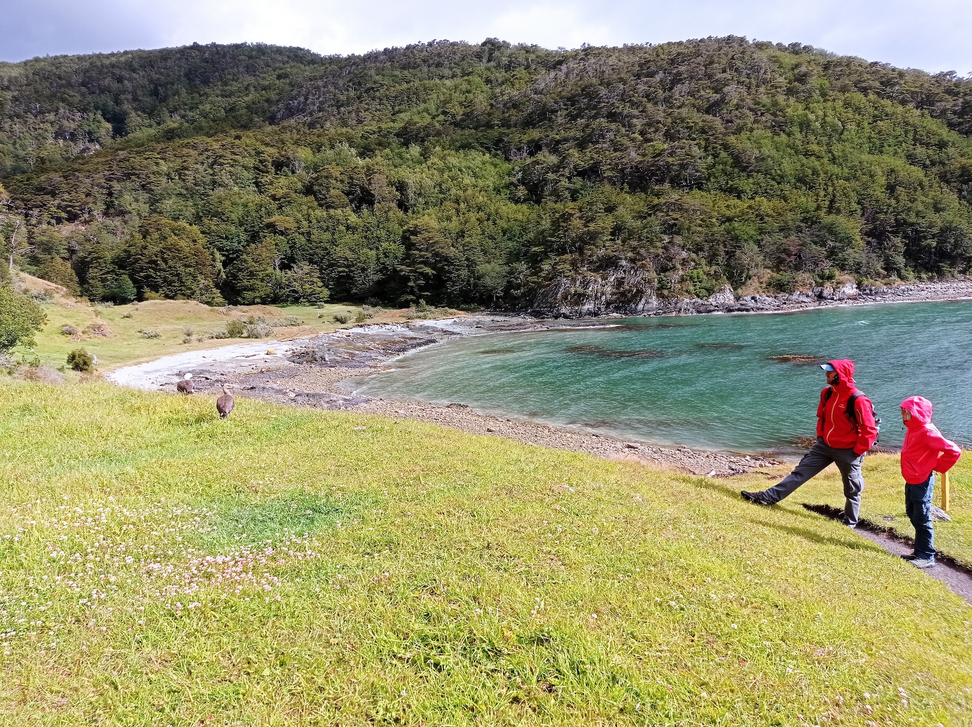 Notre taxi nous dépose à la Bahia Ensenada Zaratiegui pour que nous puissions effectuer le sentier de la côte, qui est indiqué comme durant quatre heures, mais qui n’est que de 8km avec une difficulté moyenne. Comme il n’y a pas de réseau dans le parc, nous convenons de nous retrouver à 12h à la fin du sentier, au croisement de deux routes, en espérant que les quatre heures sont comptées larges vu qu’il nous reste pile quatres heures pour le faire. Il nous sera impossible de le joindre (ou n’importe quel taxi d’ailleurs) et vice-versa… Nous avons donc intérêt à être à l’heure au rendez-vous !