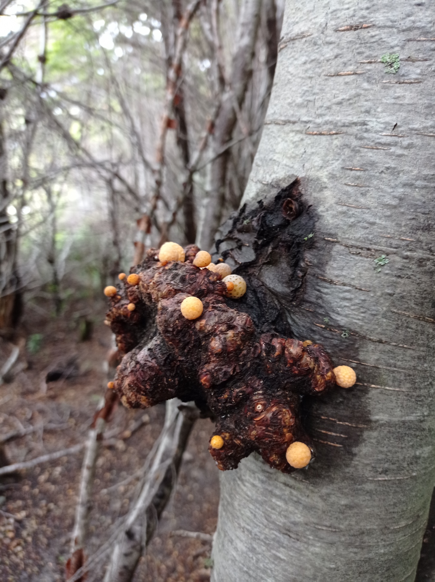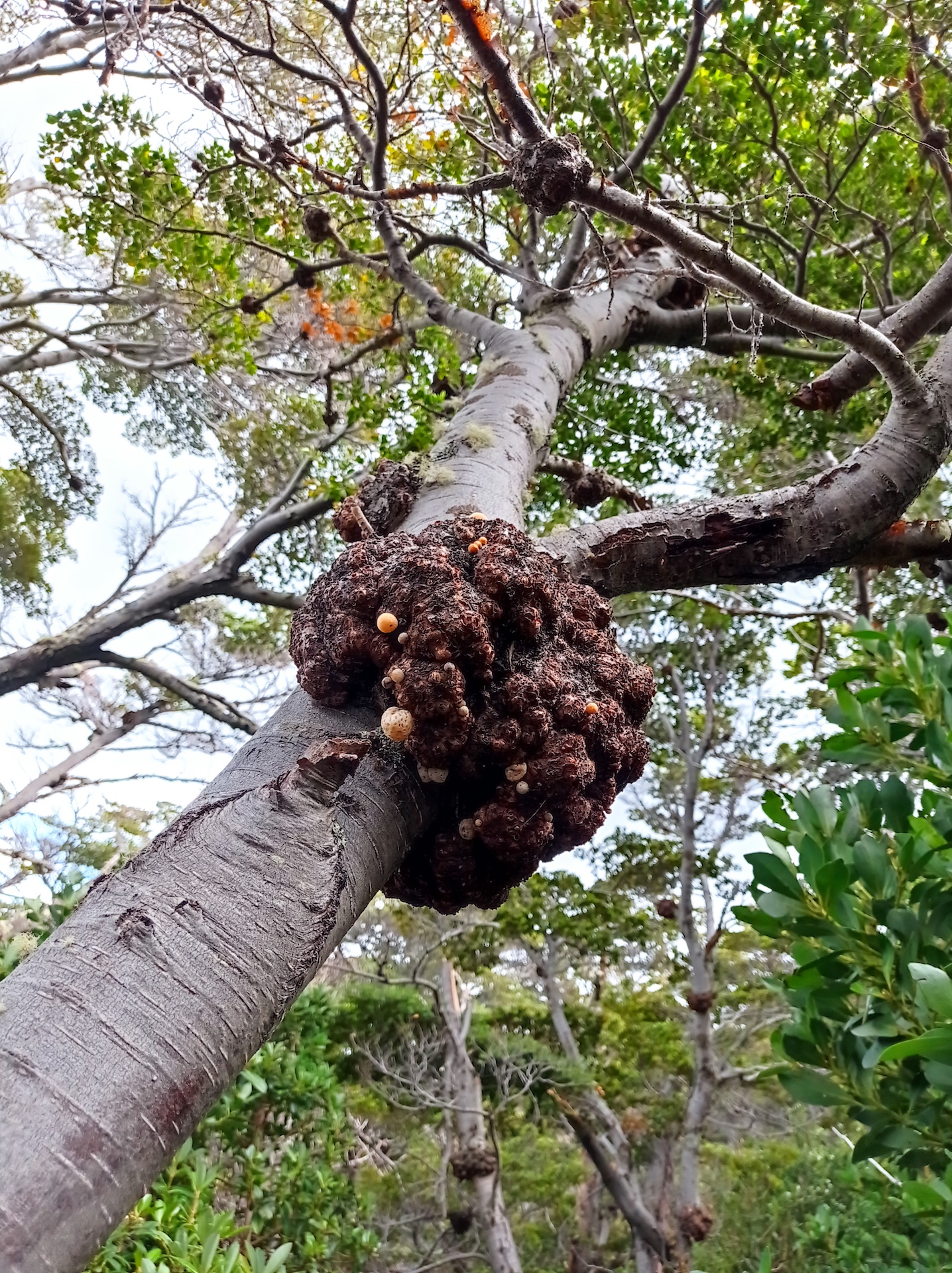 Sur tout le sentier dans la forêt, nous découvrons des coquilles de moule, amenées là par le vent ou les vagues, mais surtout des espèces de boules gélatineuses et constellées de petits trous… nous mettons du temps à découvrir ce que c’est… Ce sont en fait des espèces de champignons qui tombent d’excroissances sur les branches des arbres. Cela fait une drôle de sensation quand nous marchons dessus, ce qui ne manque pas de nous amuser régulièrement durant la randonnée.