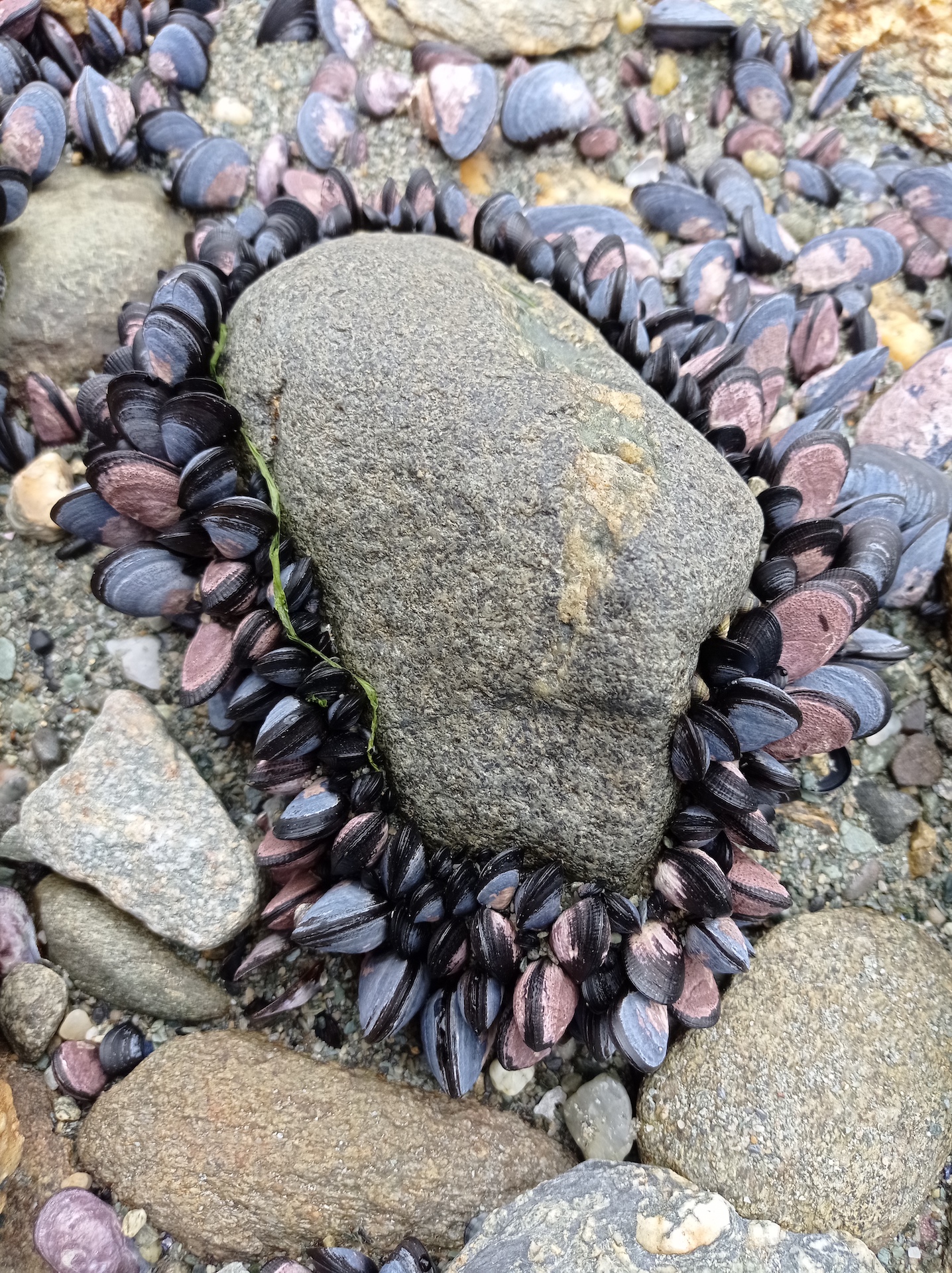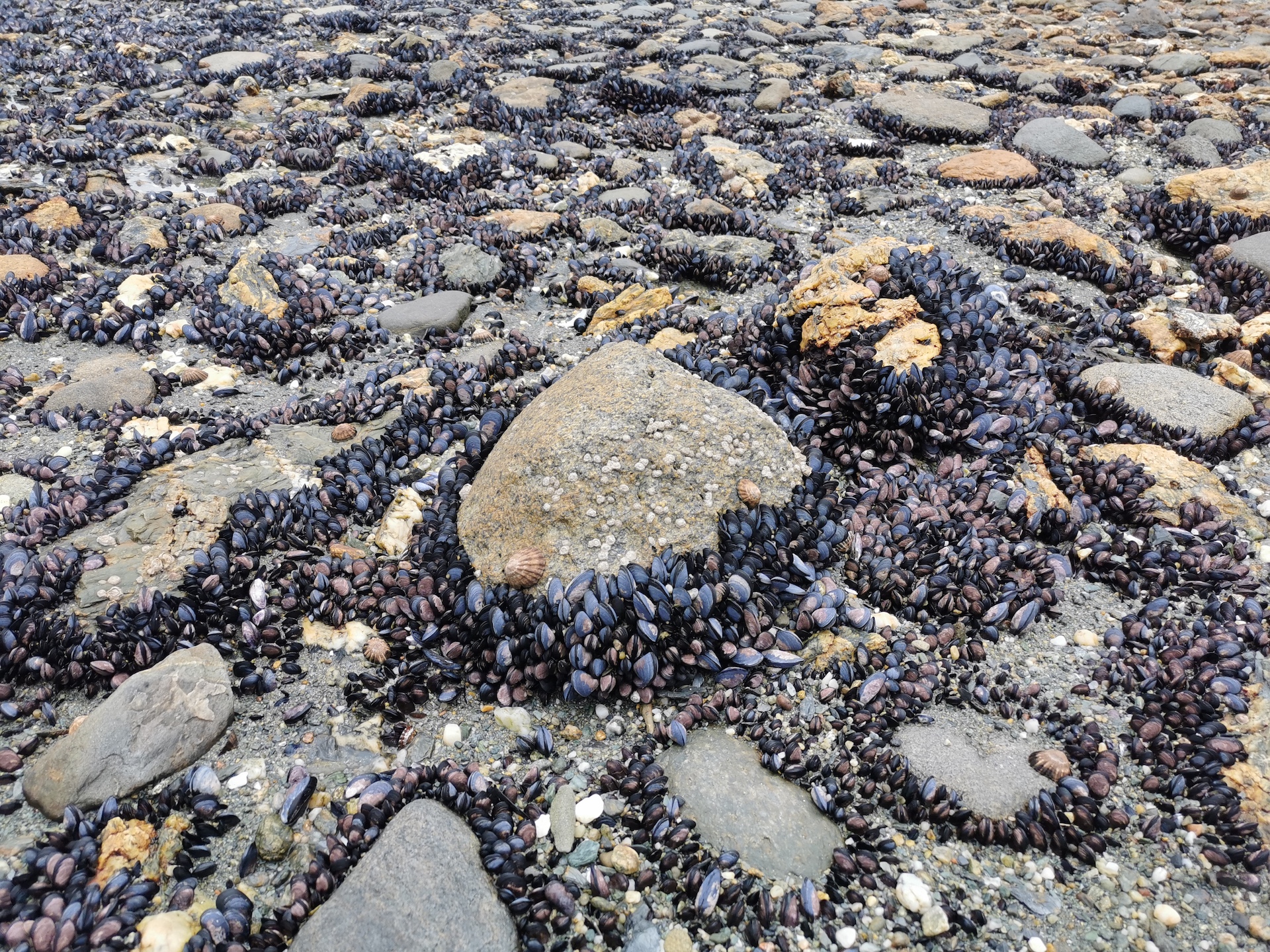 Chemin faisant, nous arrivons sur une plage à marrée basse qui nous permet d’admirer un vrai tapis de moules accrochées aux rochers. C’est impressionnant !