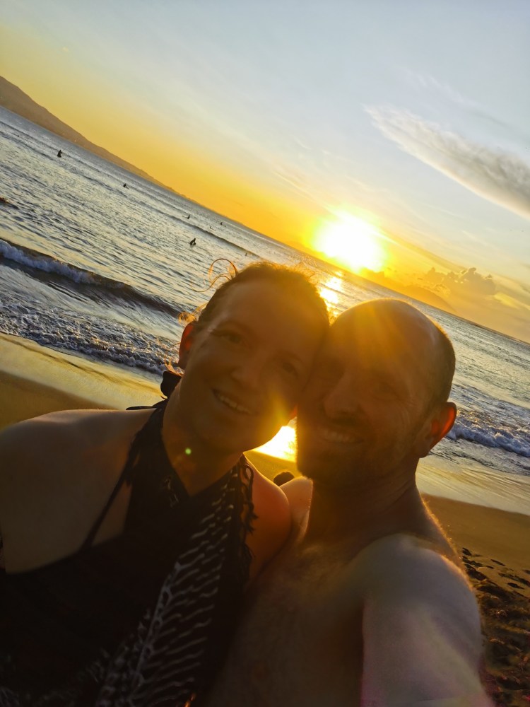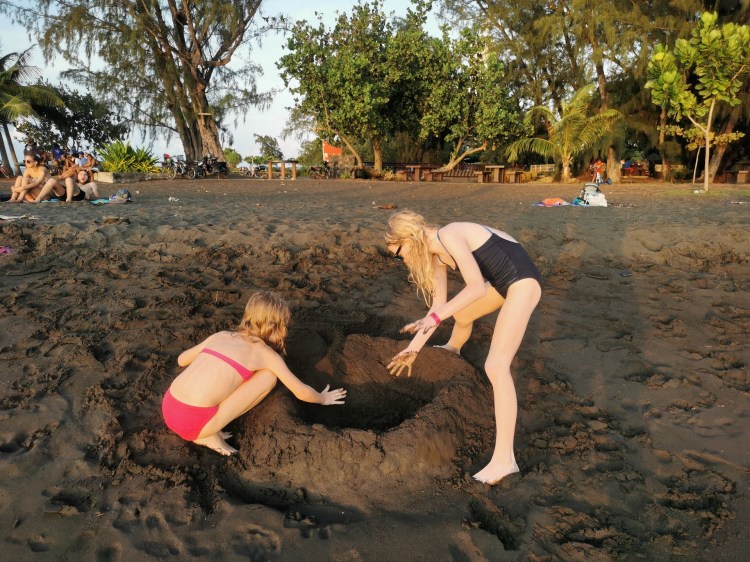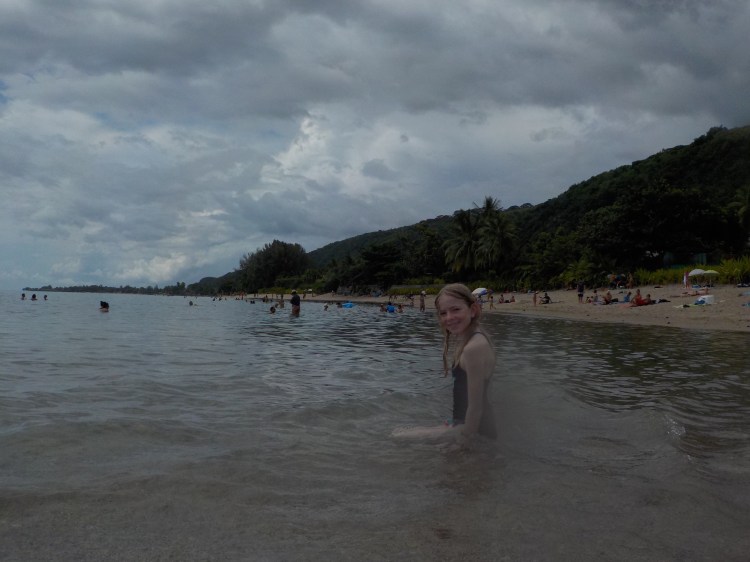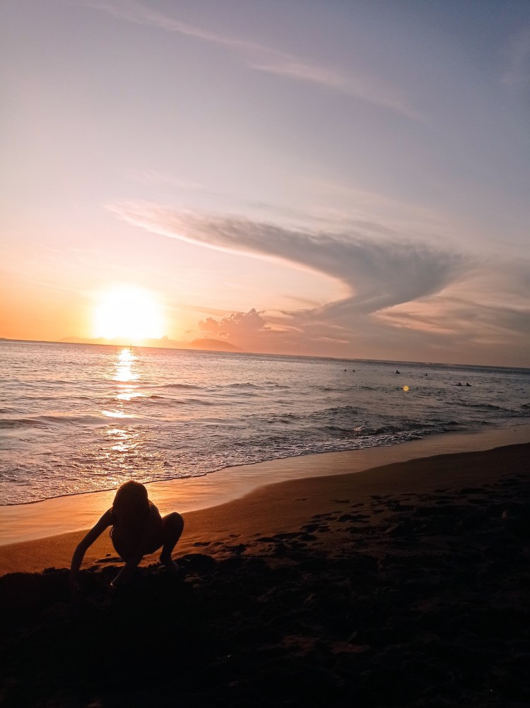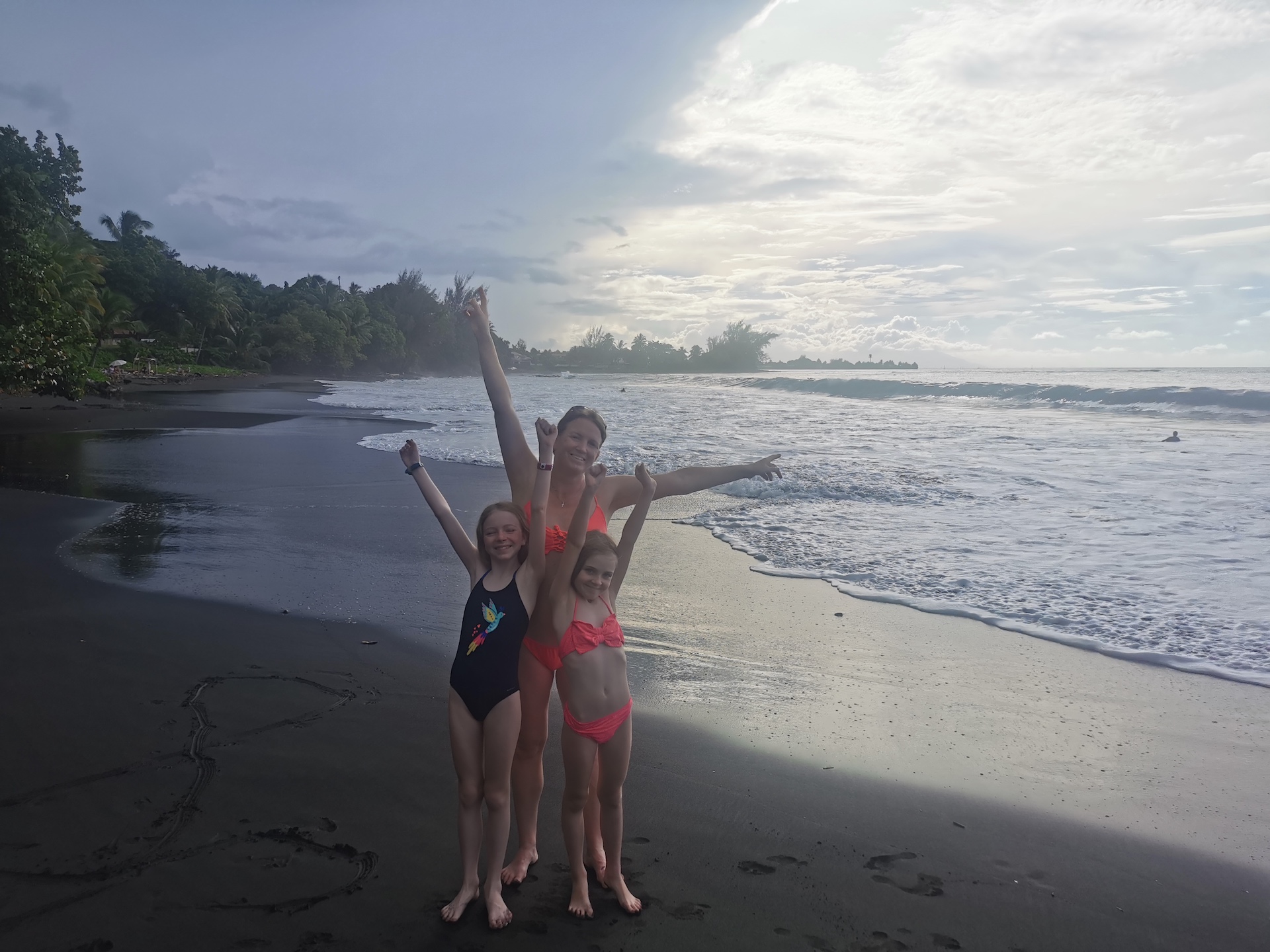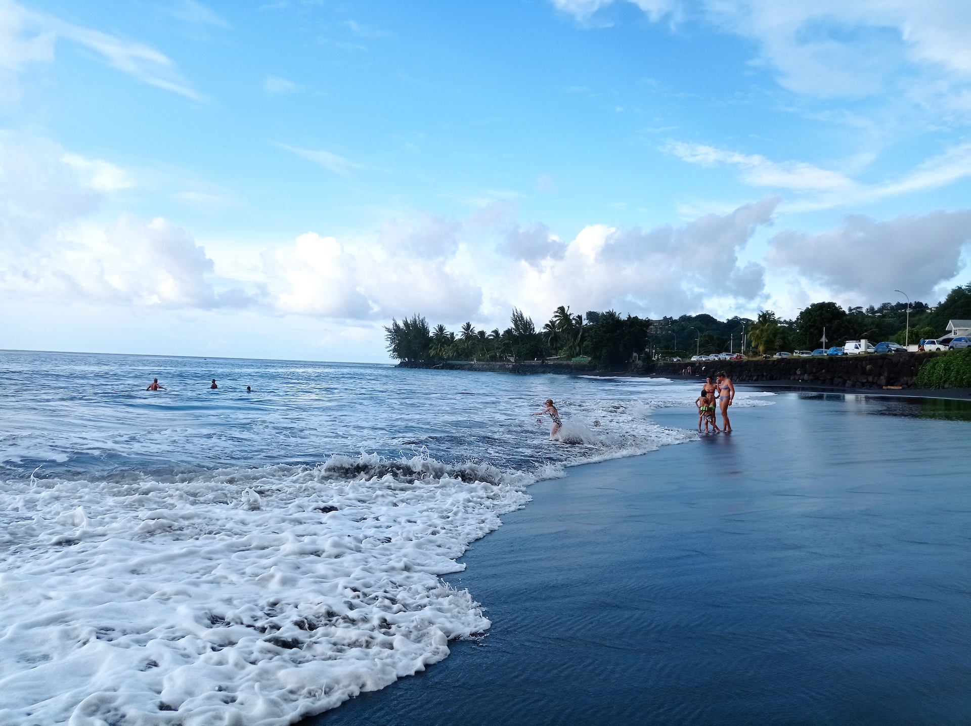 Après cet épisode culturel, place à la détente! La plage est peu propice au snorkeling car la mer y est agitée par des vagues de dimensions modestes. Nous profitons donc de cette jolie plage de sable noire pour nous amuser dans l’eau et dans le sable sans danger. Nous décidons de nous y attarder jusqu’au coucher du soleil, qui nous laisse sans voix, comme souvent en Polynésie.