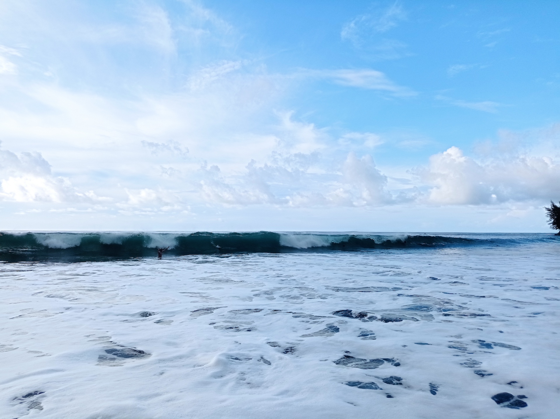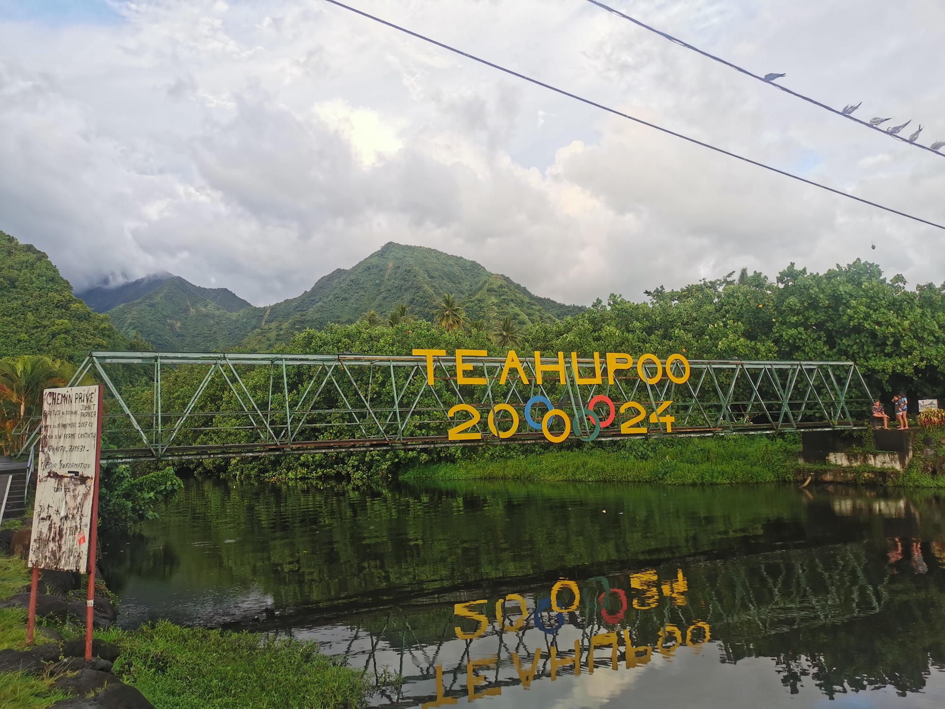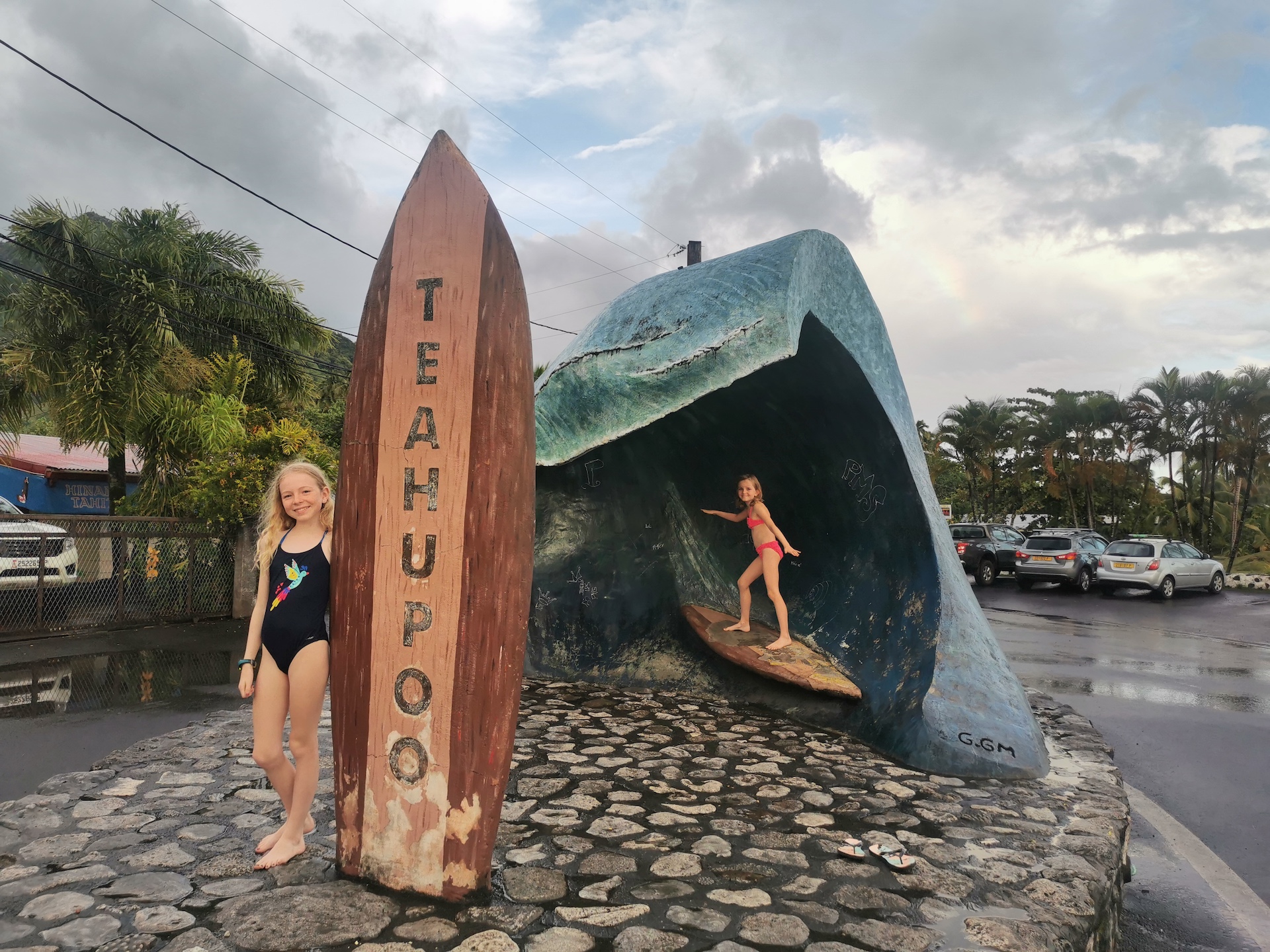 Pour notre dernière étape de la journée, nous quittons Tahiti Nui (la grande) et nous passons sur la péninsule de Tahiti Iti (la petite), au sud-est. L’objectif est de nous rendre sur le lieu de la mythique vague de Teahupoo. Il s’agit d’un lieu célèbre pour les amateurs de surf et il a d’ailleurs été choisi pour la compétition de surf des Jeux Olympiques de Paris 2024. En réalité, la vague est belle mais lointaine et c’est surtout aux mois de juillet et août qu’elle est le plus impressionant. Nous nous contentons donc de l’observer (ainsi que les quelques surfeurs qui la chevauchent) à la jumelle depuis la plage et de prendre quelques photos souvenirs. Nous ne nous baignons pas car une averse nous surprend…
