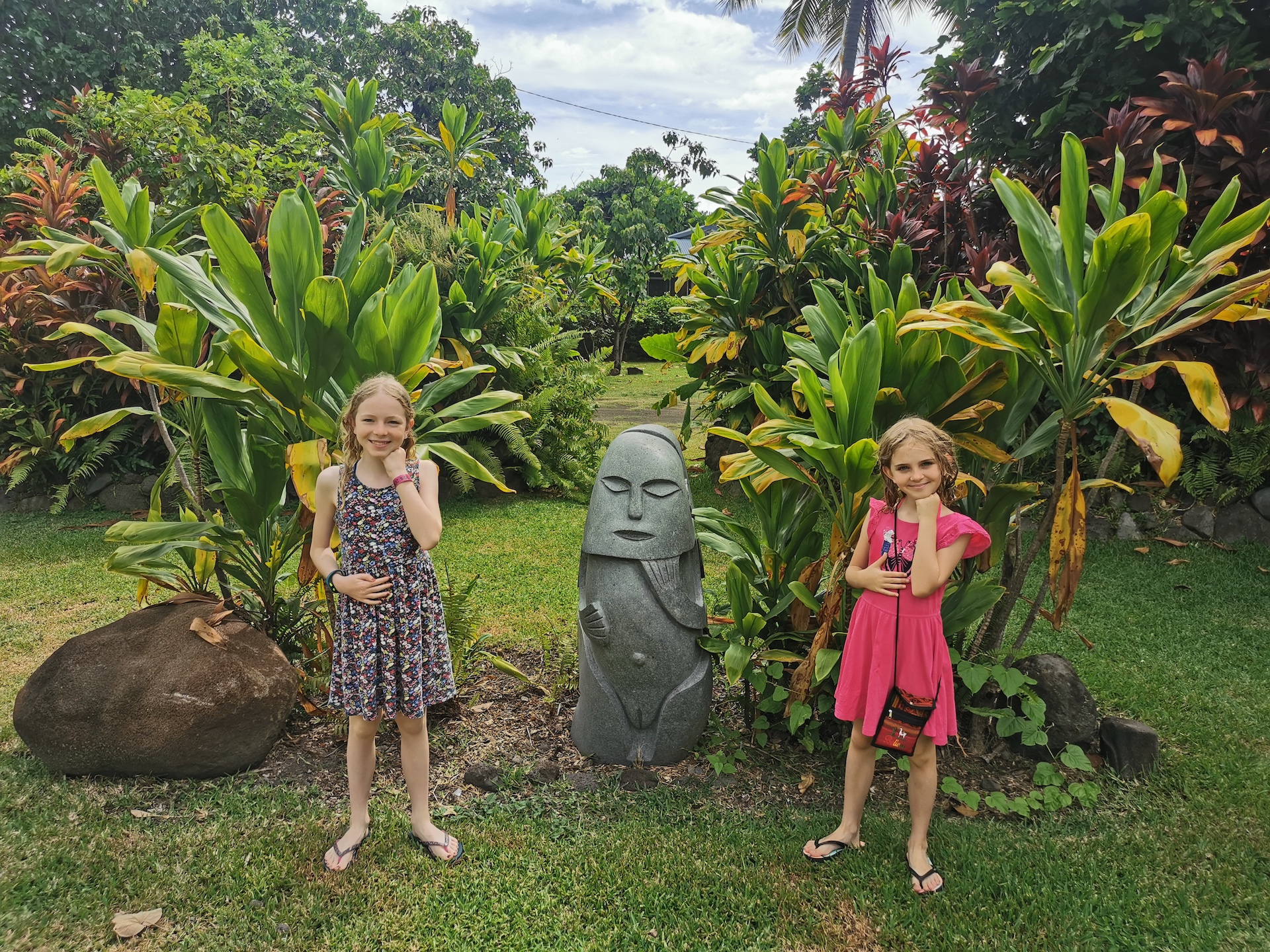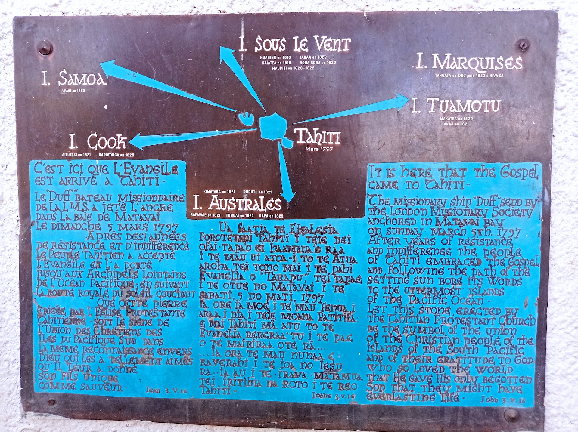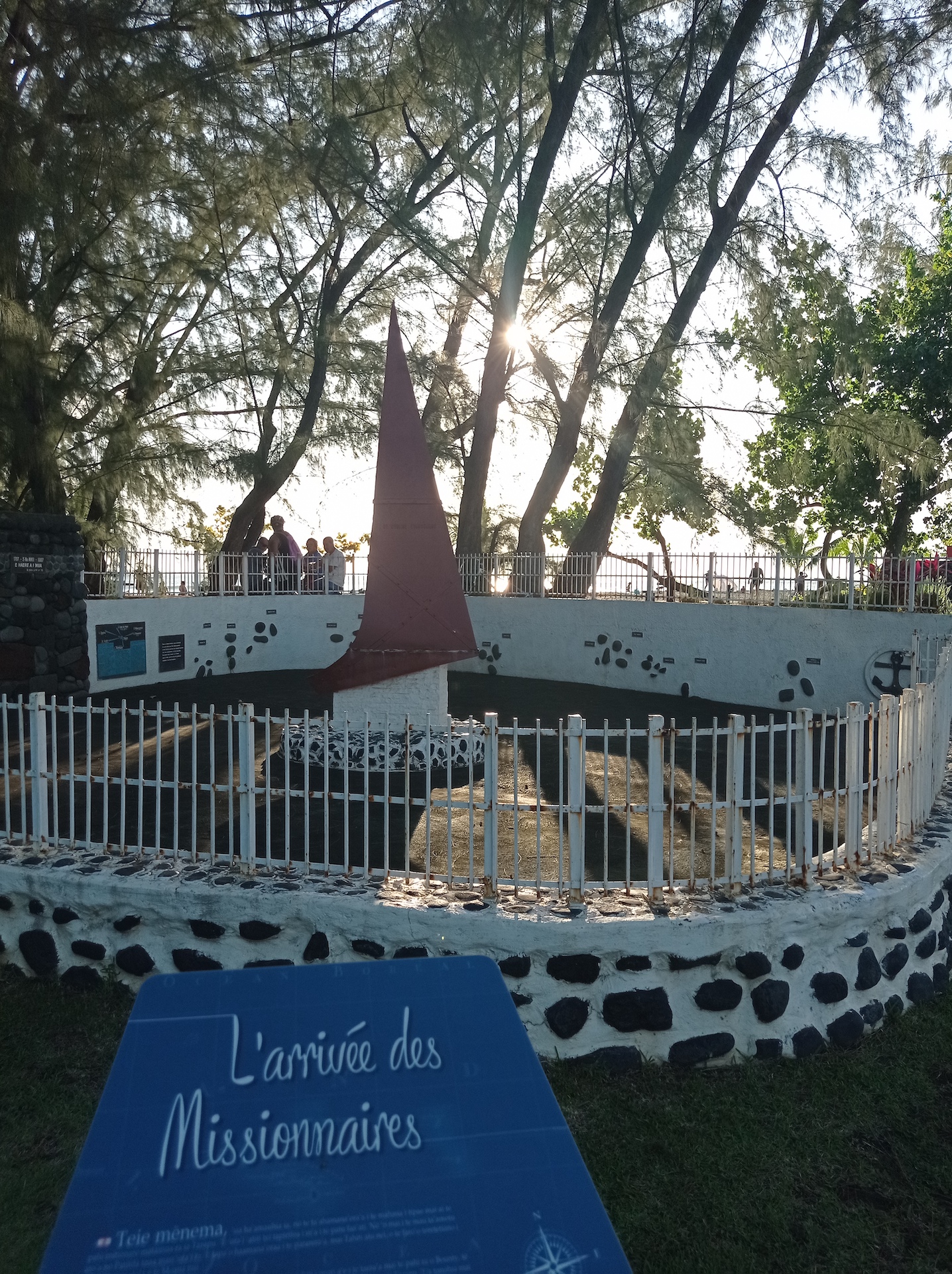 Le parc abrite aussi un monument célébrant l’arrivée des premiers missionnaires sur Tahiti. En 1797, un petit groupe de missionaires protestants de la London Missionary Society débarque du bateau « The Duff » afin d’évangéliser la population locale. Ils commencent à apprendre la langue tahitienne puis enseignent aux habitants à lire et à écrire dans leur propre langage. La diffusion du christianisme se fera dans toutes les îles du Grand Océan à partir de Tahiti. Durant tout notre séjour en Polynésie, nous avons été frappés par le très grand nombre d’églises rencontrées un peu partout. Nous apprenons d’ailleurs que la religion chrétienne joue un rôle important dans la société des îles.