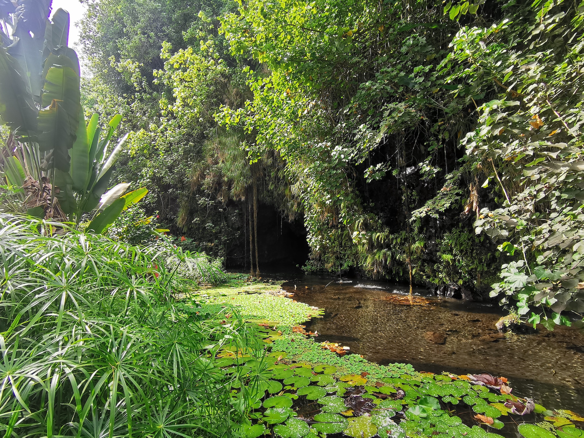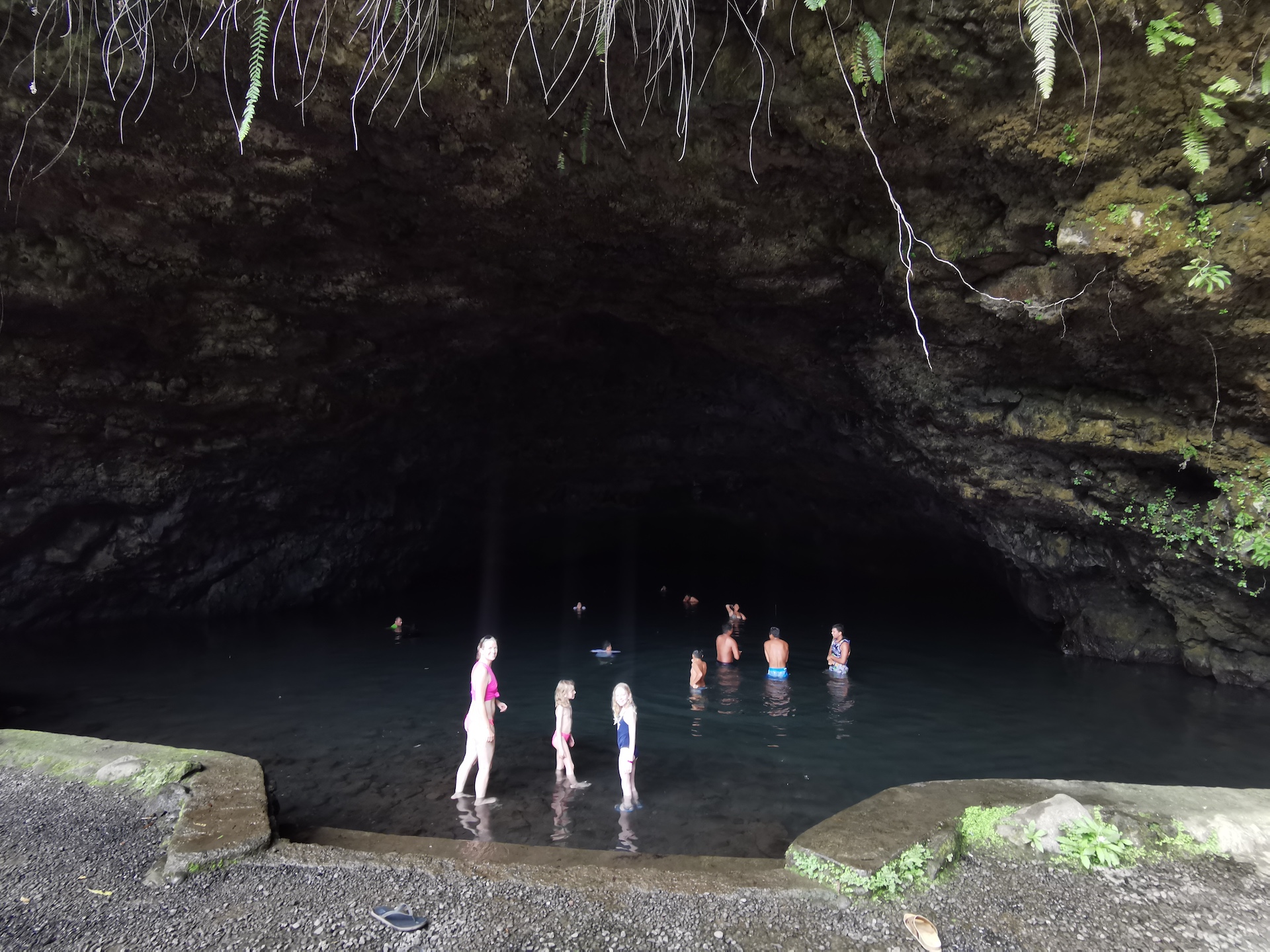 La route nous mène ainsi jusqu’aux grottes de Maraa. Il s’agit de 3 cavités naturelles creusées dans la roche au milieu d’une végétation luxuriante. Des infiltrations d’eau ont formé des petits lacs aux eaux transparentes. Si les deux premières sont petites et jolies, la troisième est plus impressionnante. C’est une grande grotte, profonde, avec une belle hauteur de voûte et dans laquelle nous pouvons nous baigner. L’eau est limpide mais bien fraîche! Vu la chaleur, nous n’hésitons pas à nous y plonger.