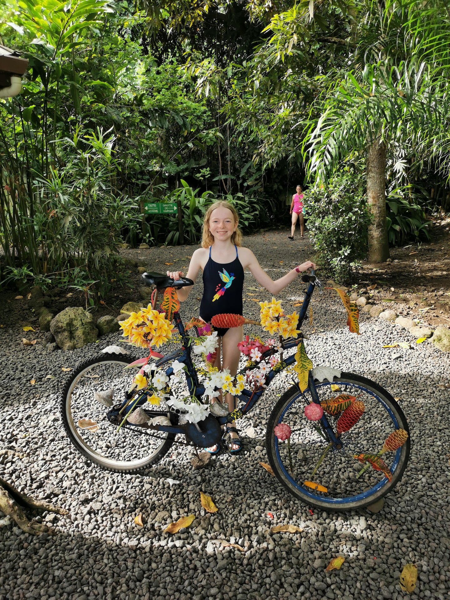 En repartant de la grotte, nous tombons sur un local qui tient absolument à ce que nous fassions une photo avec son vélo. C’est vrai qu’il est joliment décoré et il se propose même de faire pour nous une photo de famille. Il est tellement enthousiaste qu’il finit par « s’imposer » pour que nous photographions l’oeuvre d’art qu’il a sur le dos.