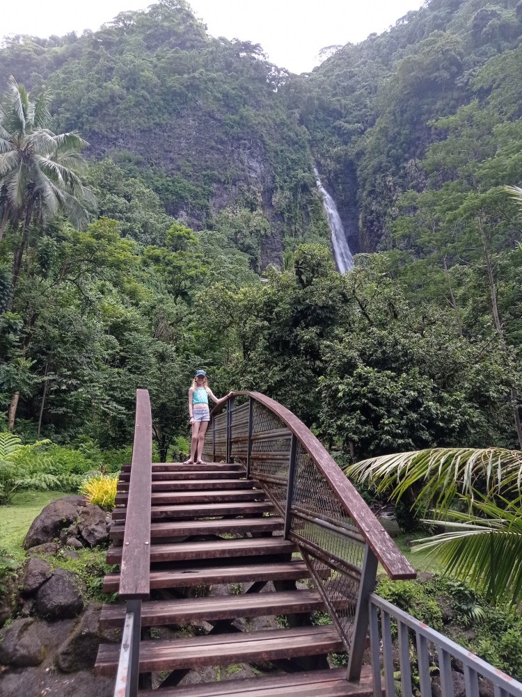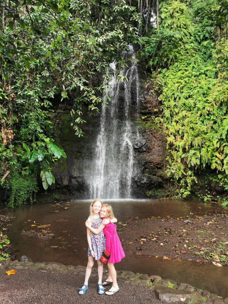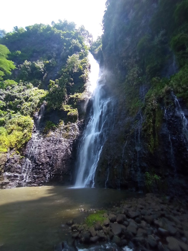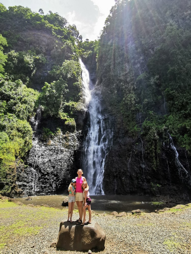 Après avoir déambulé dans les allées du marché, nous reprenons notre véhicule pour terminer le tour de l’île et les quelques sites dignes d’intérêt que nous avons manqué hier. Nous arrivons d’abord à la belle cascade de Faarumai. Ce sont en fait 3 cascades mais l’accès ne nous est autorisé qu’à la première, Vaihamuta, d’une hauteur de près de 100m. Les chemins d’accès aux deux autres étant en travaux, nous sommes un peu déçus de devoir nous contenter d’une seule cascade (même si elle est magnifique) car tout le lieu est lié à une légende qui englobe les trois chutes d’eau, légende que voici: