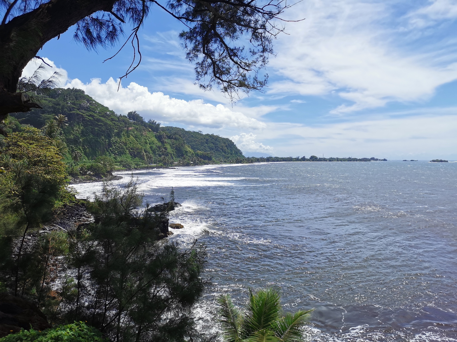 Après cette première immersion dans la culture polynésienne, nous continuons notre tour en nous arrêtant de temps à autre pour découvrir les merveilles de la nature que nous offre l’île de Tahiti. Nous commençons déjà par nous émerveiller de tous ces palmiers et de la proximité de l’eau. La route longe majoritairement la côte (ce sera le cas de quasiment toutes les îles que nous visiterons) et nous multiplions les points de vue magnifiques.