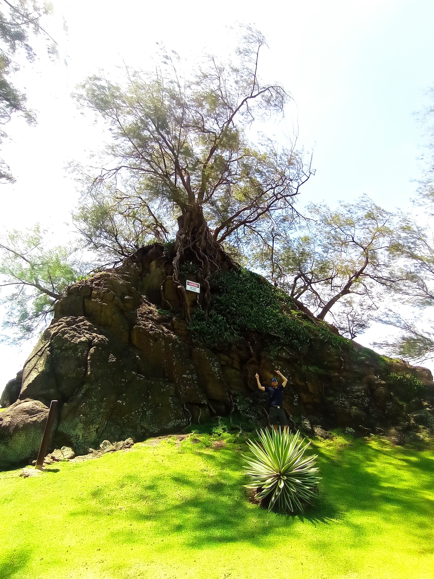 C’est inspirés par cette belle légende que nous repartons en direction du trou du souffleur de Arahoro (la route qui hurle). Cette fois-ci, point de merveille naturelle devant laquelle rester ébaubis mais une particularité géologique fort amusante: le trou du souffleur. C’est un geyser maritime: un tube de lave formé il y plusieurs millions d’années, avec un trou au plafond. Les jours de forte houle, l’eau de l’océan pénètre dans la cavité sous-marine et comprime l’air jusqu’à ce que la pression déclenche le jaillissement de l’eau vers l’extérieur. A intervalles assez réguliers, un jet d’embruns, semblable au souffle d’une baleine, est expulsé des rochers. Le bruit qui accompagne ce souffle est assez impressionnant.