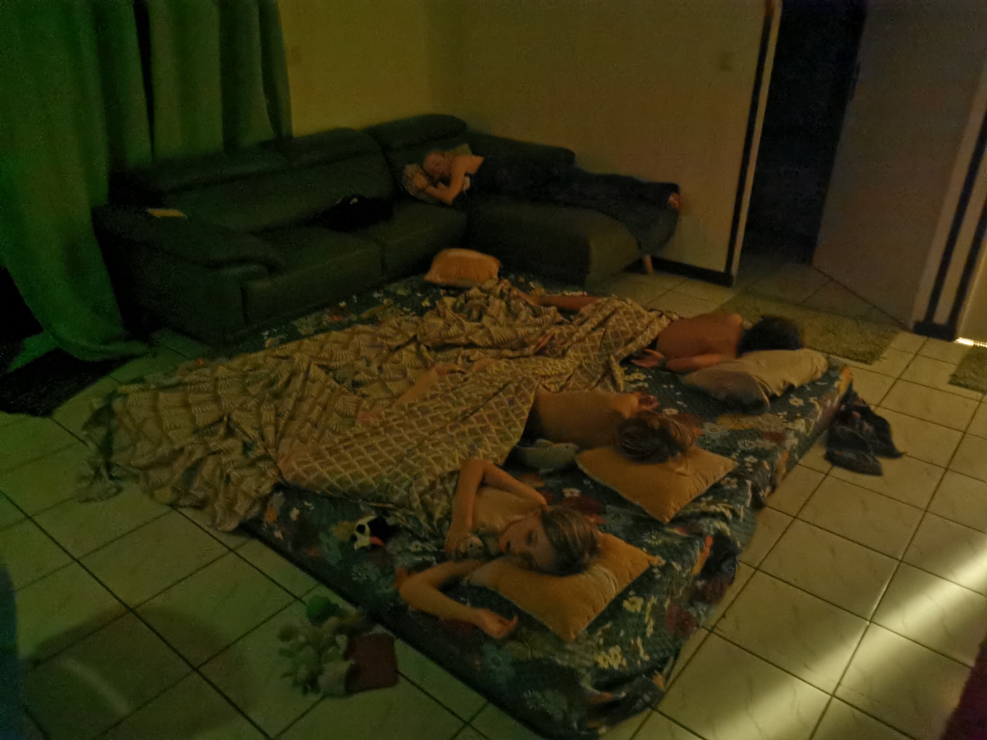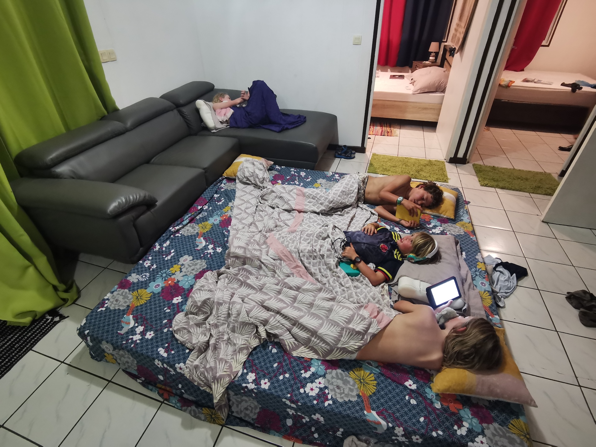 L’appartement a deux chambres, une pour chaque couple. Les enfants dorment au salon en mode camping. Ils sont ravis et… Un peu excités 😄 😂 !