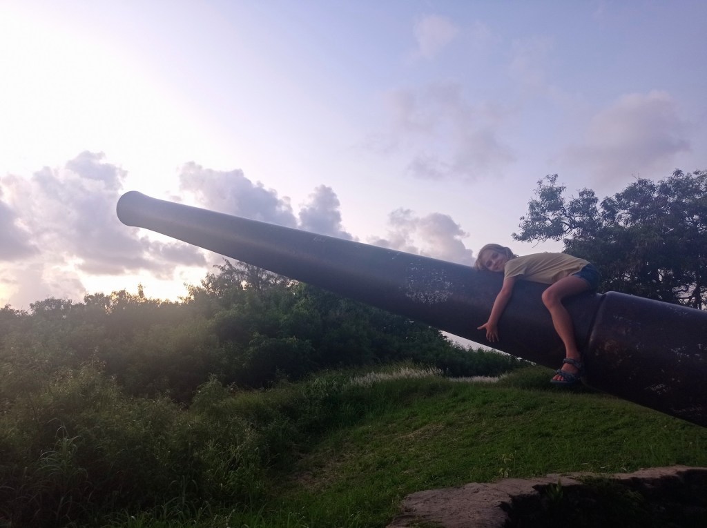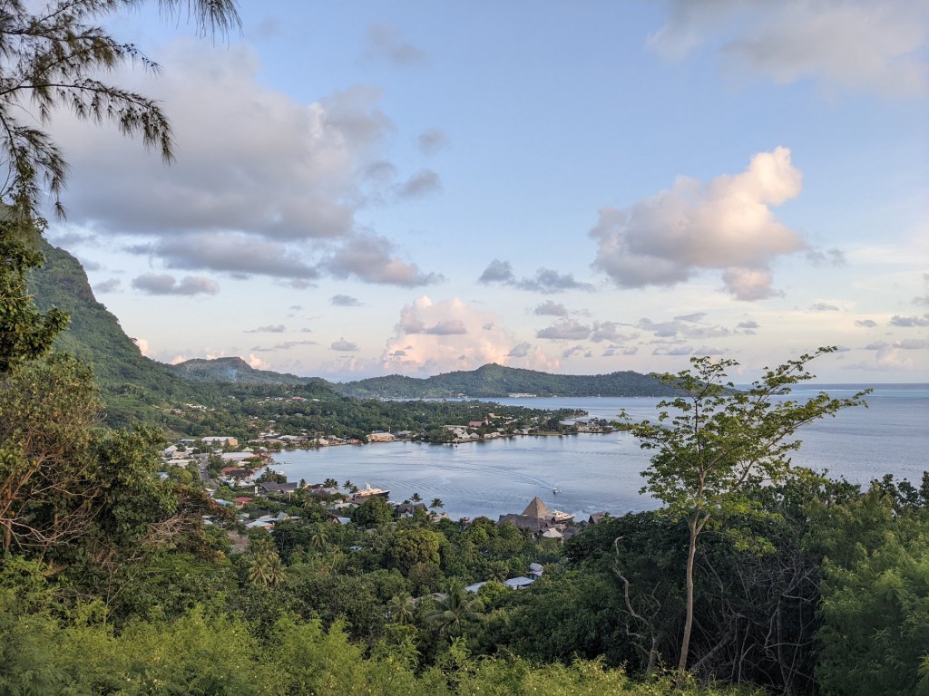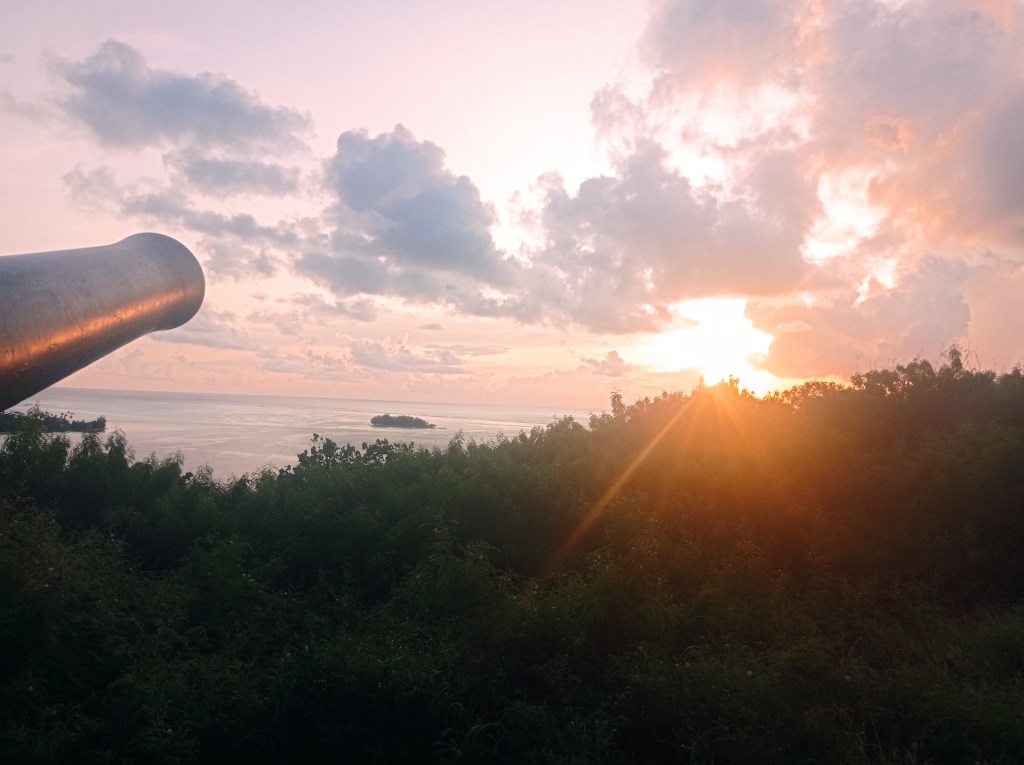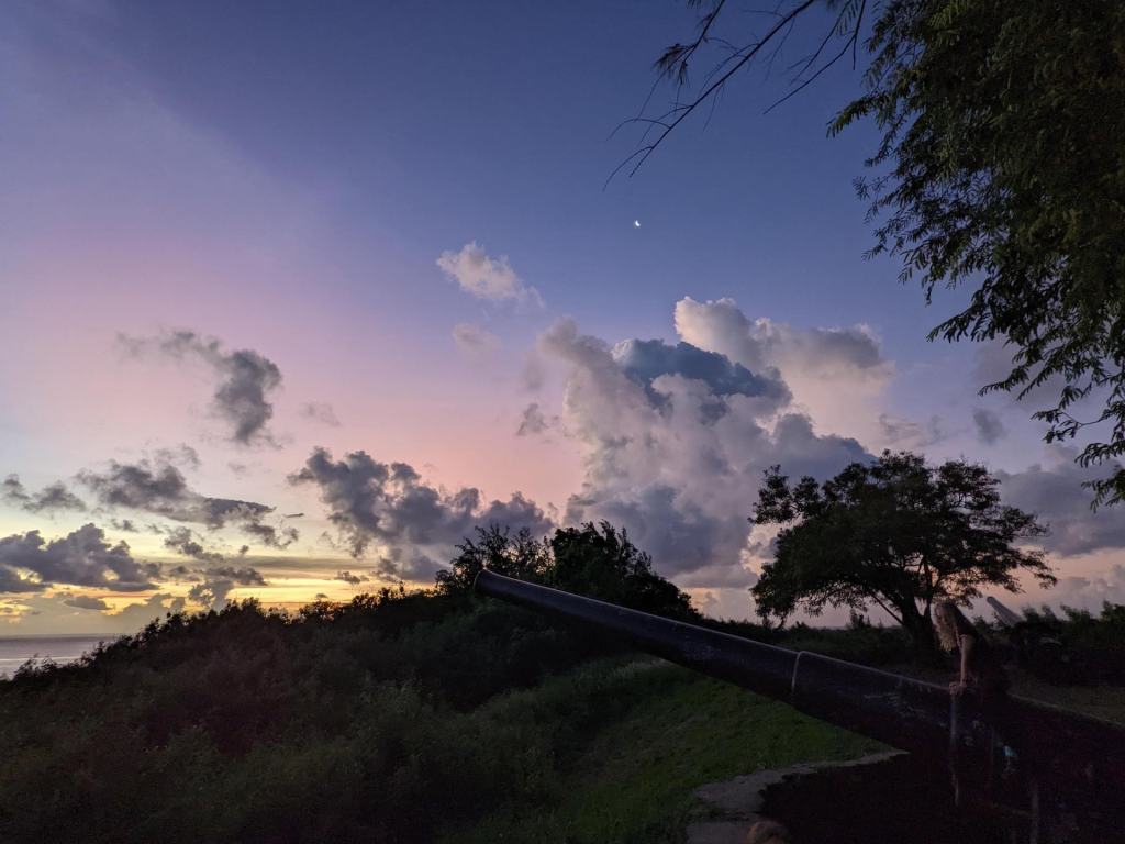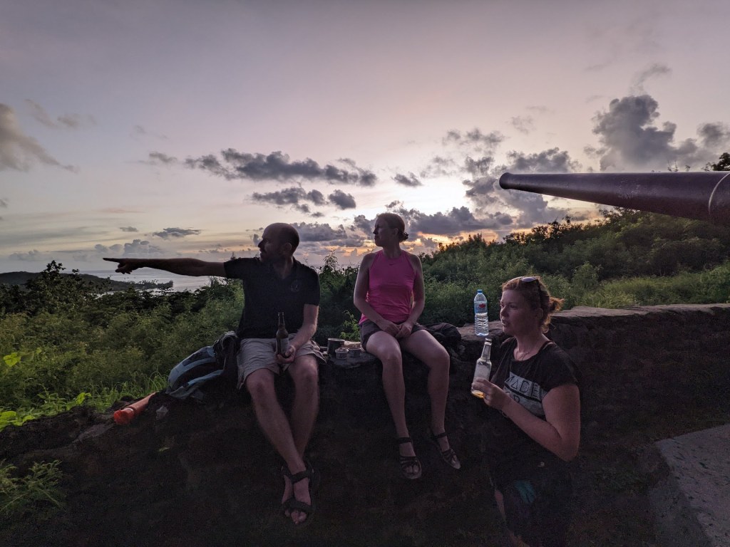 Après trois trajets pour Adrien 😝, nous voici tous de retour à l’appartement. Nous sommes un peu serrés niveau timing car nous souhaitons faire un apéro au coucher du soleil, mais nous devons d’abord monter à pied jusqu’au point de vue! Après une bonne montée d’environ 45 minutes, nous arrivons au sommet. Ce point de vue est parfait pour admirer la baie de Bora Bora et le coucher du soleil. C’est d’ailleurs pour cette raison que nous y trouvons des vestiges de la 2e guerre mondiale: deux canons prêts à défendre la passe! Nous apprenons grâce à Google que 6’000 GI ont habité sur l’île entre 1942 et 1946, formant une arrière-garde en cas d’attaque du Japon.