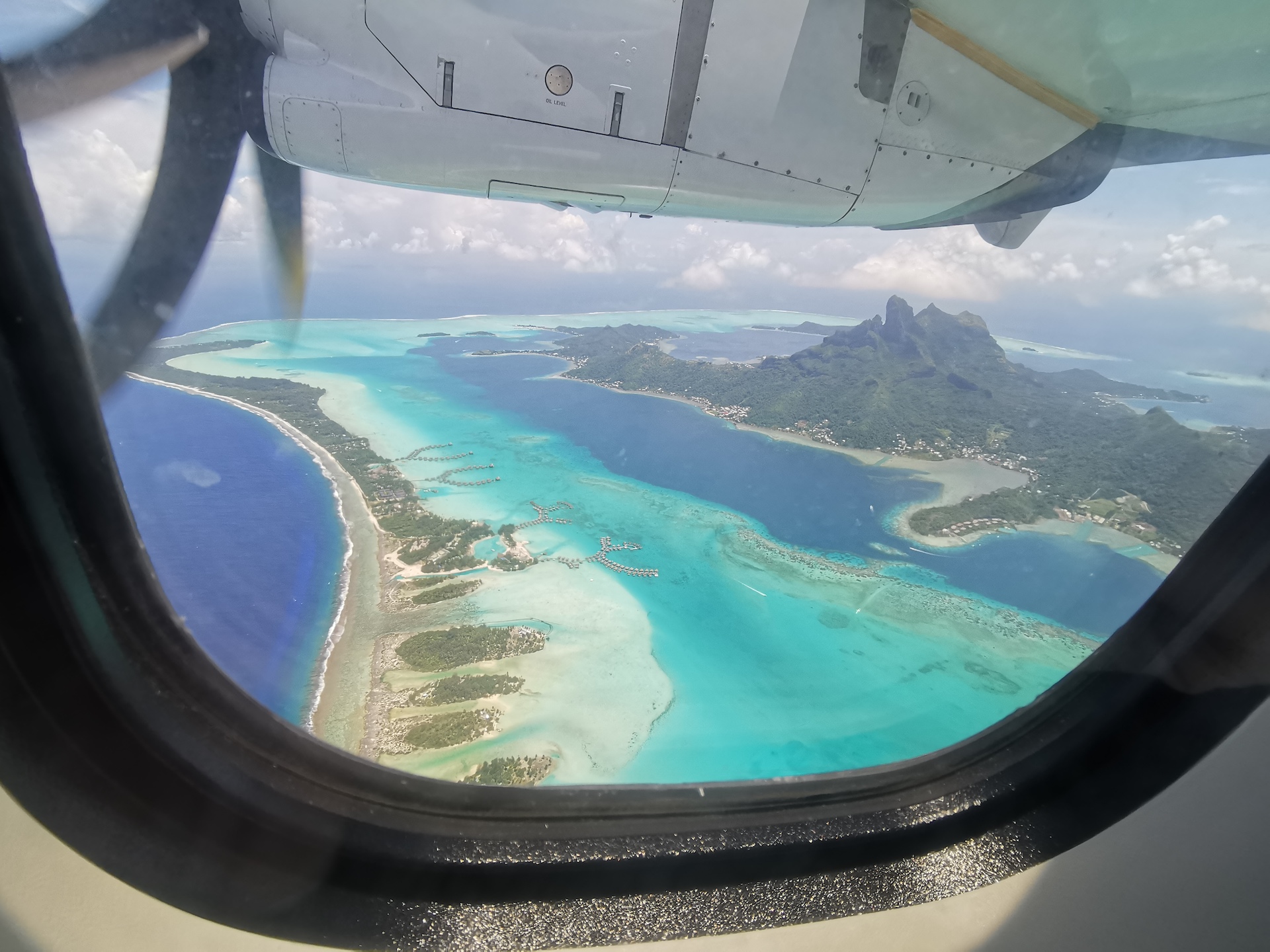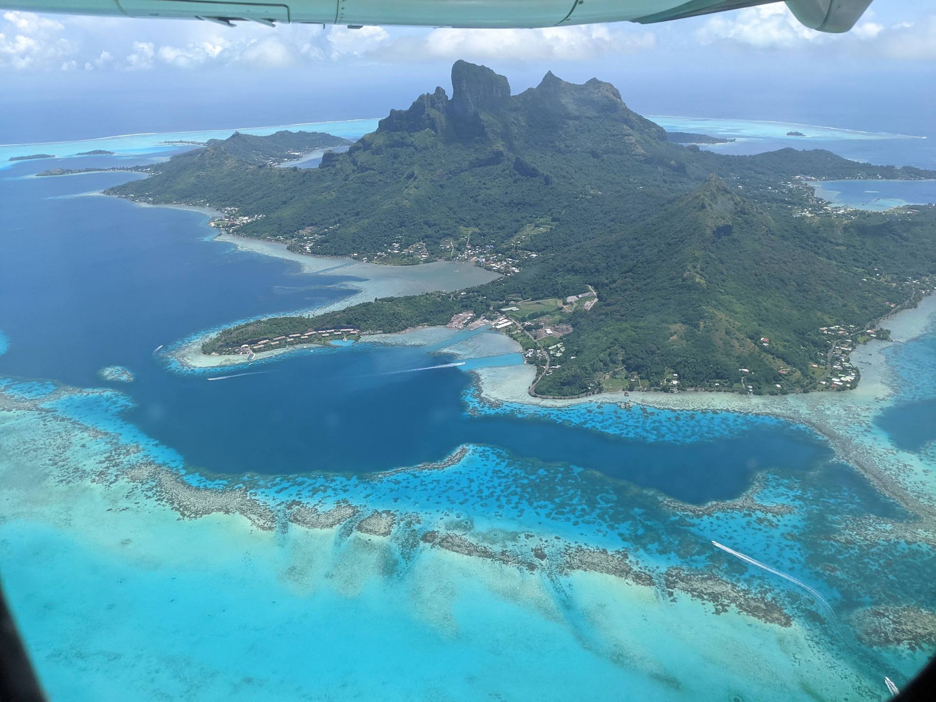 Une quinzaine de minutes plus tard, nous voilà déjà en train d’amorcer notre descente. Nous montons rapidement dans un bateau-navette pour rejoindre l’île principale. Nous constatons rapidement que celle-ci est très prisée des voyageurs à haut budget, le nombre de yachts et d’hôtels sur pilotis est impressionnant!