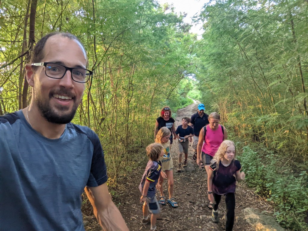 Le retour à la maison est plus casse-cou car il fait noir. Nous nous éclairons à la lumière des natels et de la lampe frontale des Calvayrac. Etonnamment, ce n’est pas un enfant qui s’encouble et tombe dans le fossé, c’est Gabrielle 🤦🏼♀️ ! Heureusement, plus de peur que de mal, car sa chute est en mode ralenti et quelques branchages la retiennent. Elle ne récoltera au final que quelques griffures et des tout petits bleus.
