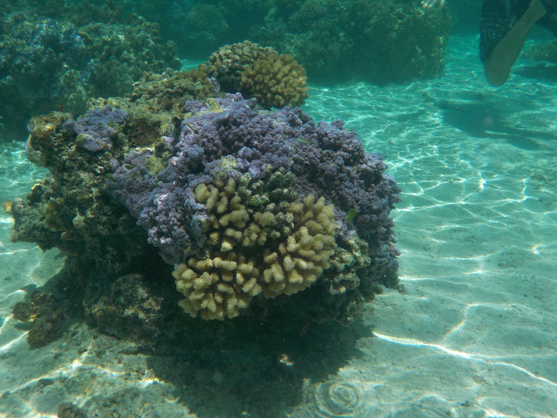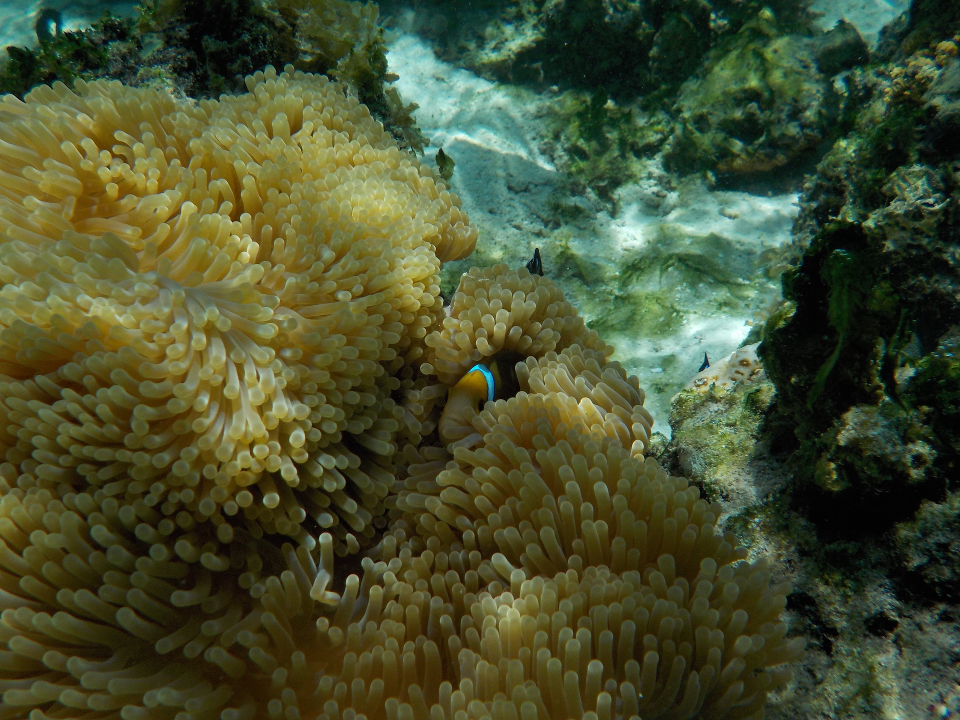 Durant notre sortie avec masque et tuba, nous avons la chance d’apercevoir des poissons clowns (Nemo) et d’en prendre un en photo. Ils habitent dans des anémones de mer très urticantes, ce sont d’ailleurs les seuls poissons connus à pouvoir vivre parmi les tentacules de l’anémone de mer, car leurs écailles sont recouvertes d’une protection gélatineuse. Ces deux animaux marins vivent en symbiose car ils se rendent mutuellement service: l’anémone protège le poisson clown des prédateurs tandis que celui-ci nettoie ses tentacules des parasites et des restes de nourriture. Ils sont très craintifs et ils rentrent dans leur anémone au moindre mouvement. Ces dernières sont toujours entourées de mini-poissons qui ressemblent à des poissons clowns, mais à l’intérieur se cache toujours un gros poisson clown, qu’il est difficile d’entrevoir.