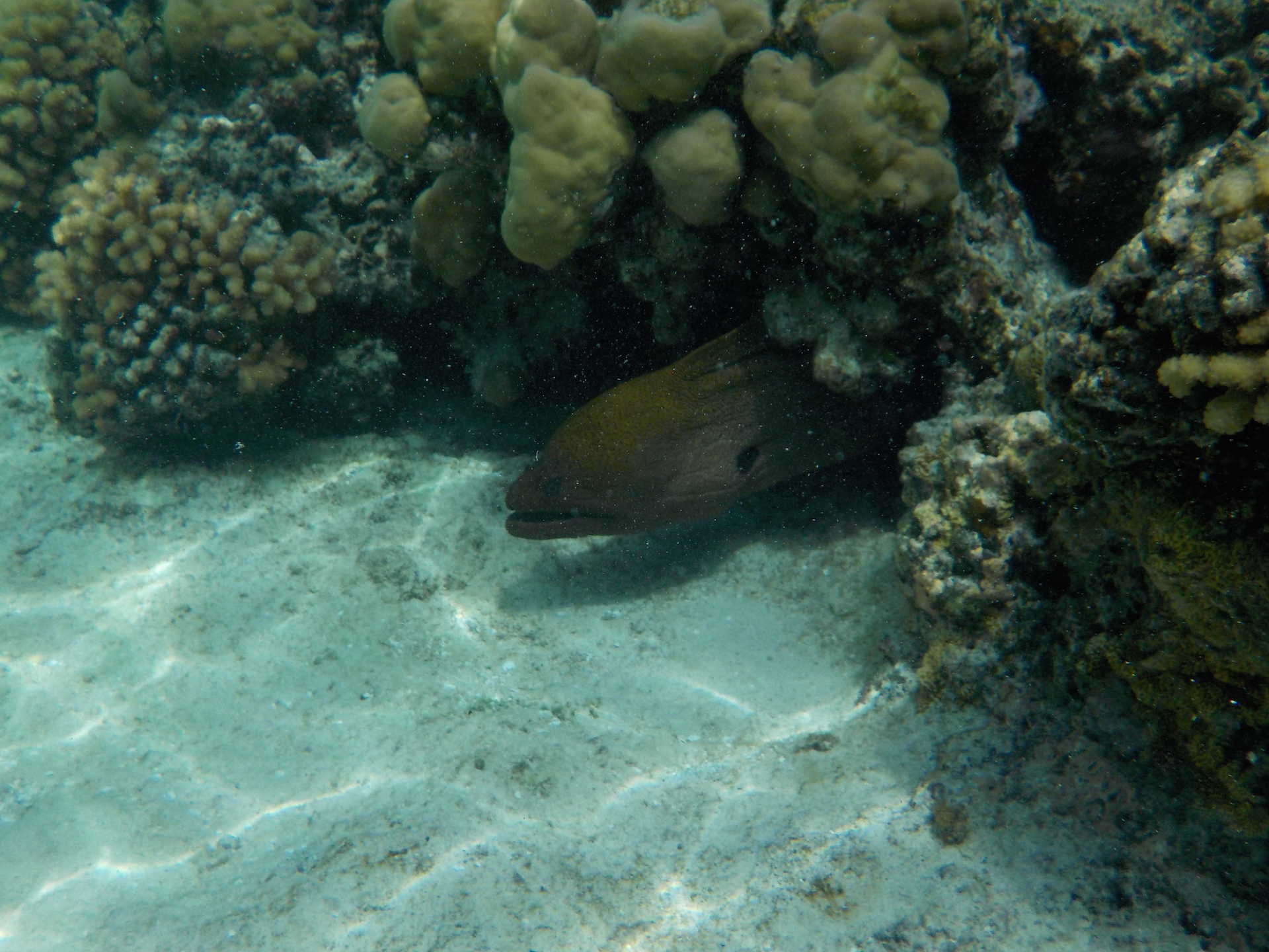 Gabrielle opte pour rester sur la chaise longue avec un des chats du motu tandis que les autres vont dans l’eau. A nouveau, nous pouvons observer de nombreux poissons et Philippe se retrouve encore une fois nez-à-nez avec une jolie murène!
