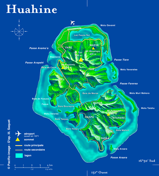 L’île de Huahine est coupée en deux, Huahine Nui et Huahine Iti. Ces deux parties sont reliées par un pont.