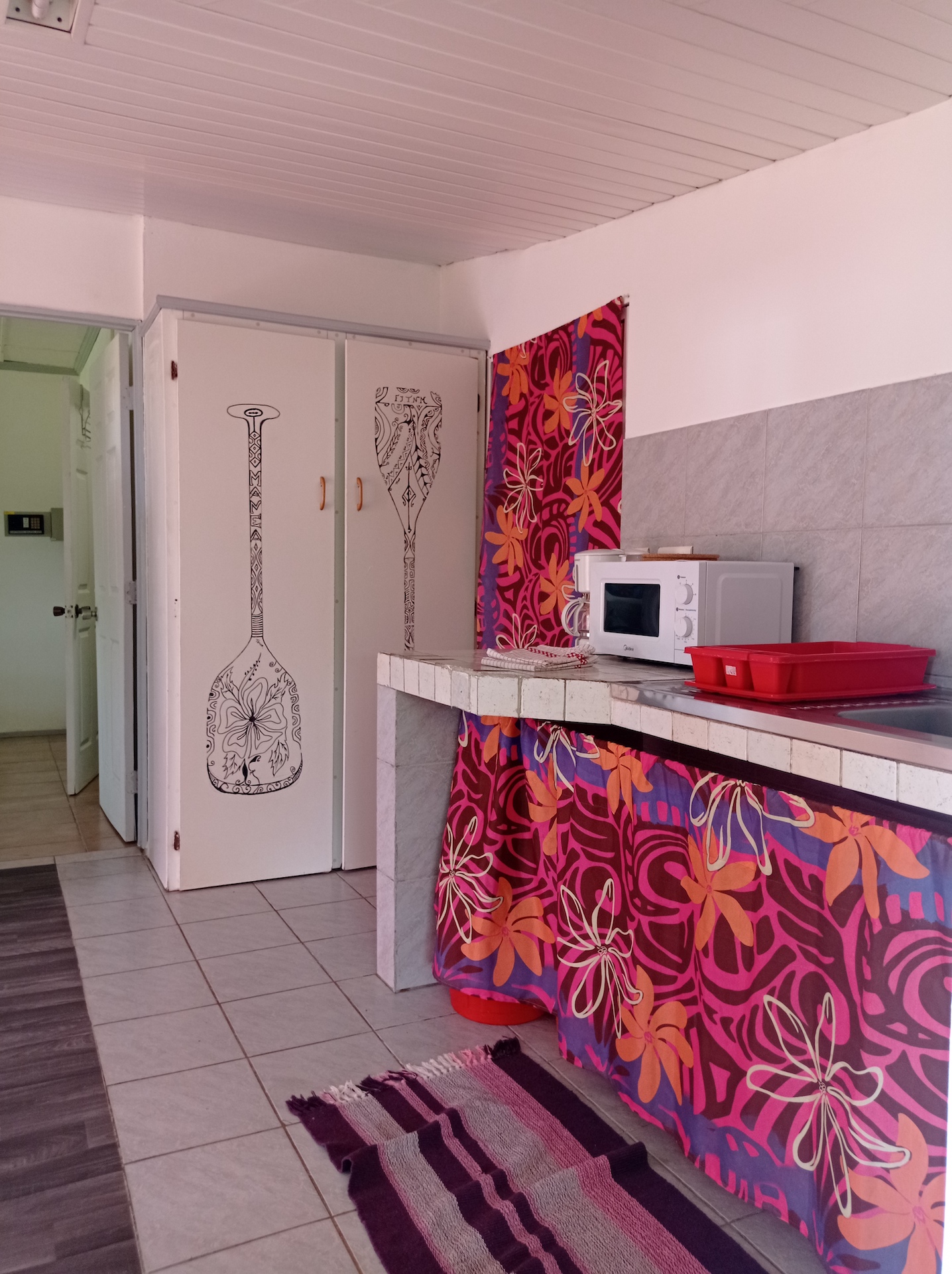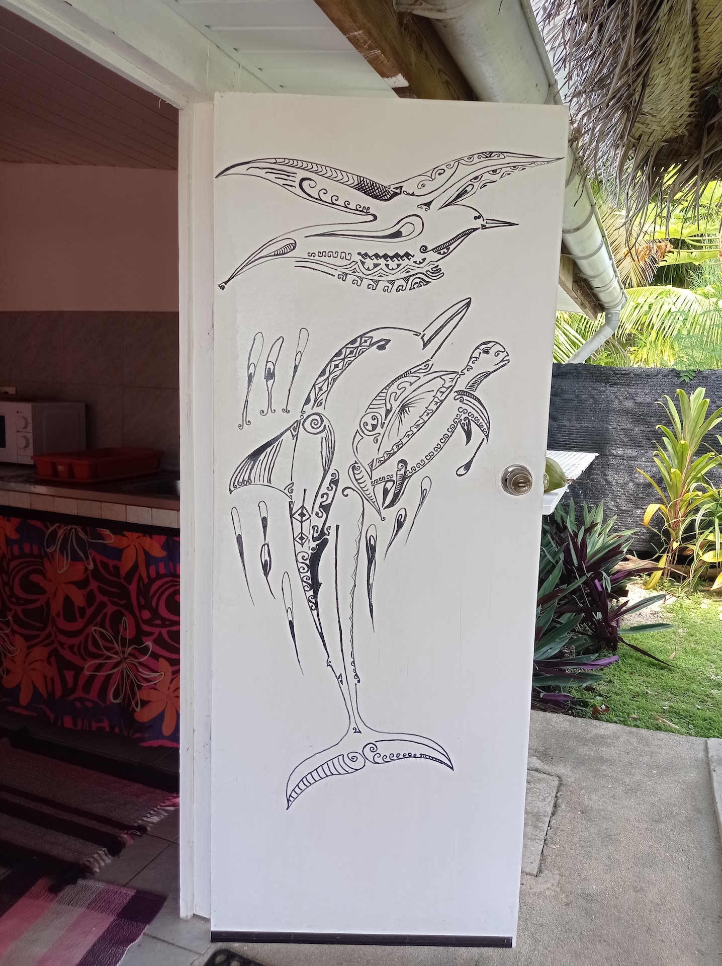 Sur Huahine, nous habitons dans des lieux séparés, alors nous partons chacun de notre côté pour découvrir nos logements respectifs. Le nôtre se trouve à cinq minutes en voiture de l’aéroport et nous arrivons dans une petite maisonnette joliment décorée, près d’une petite plage. Il sera difficile d’y nager car l’eau est très peu profonde, avec des rochers, mais la vue est magnifique.