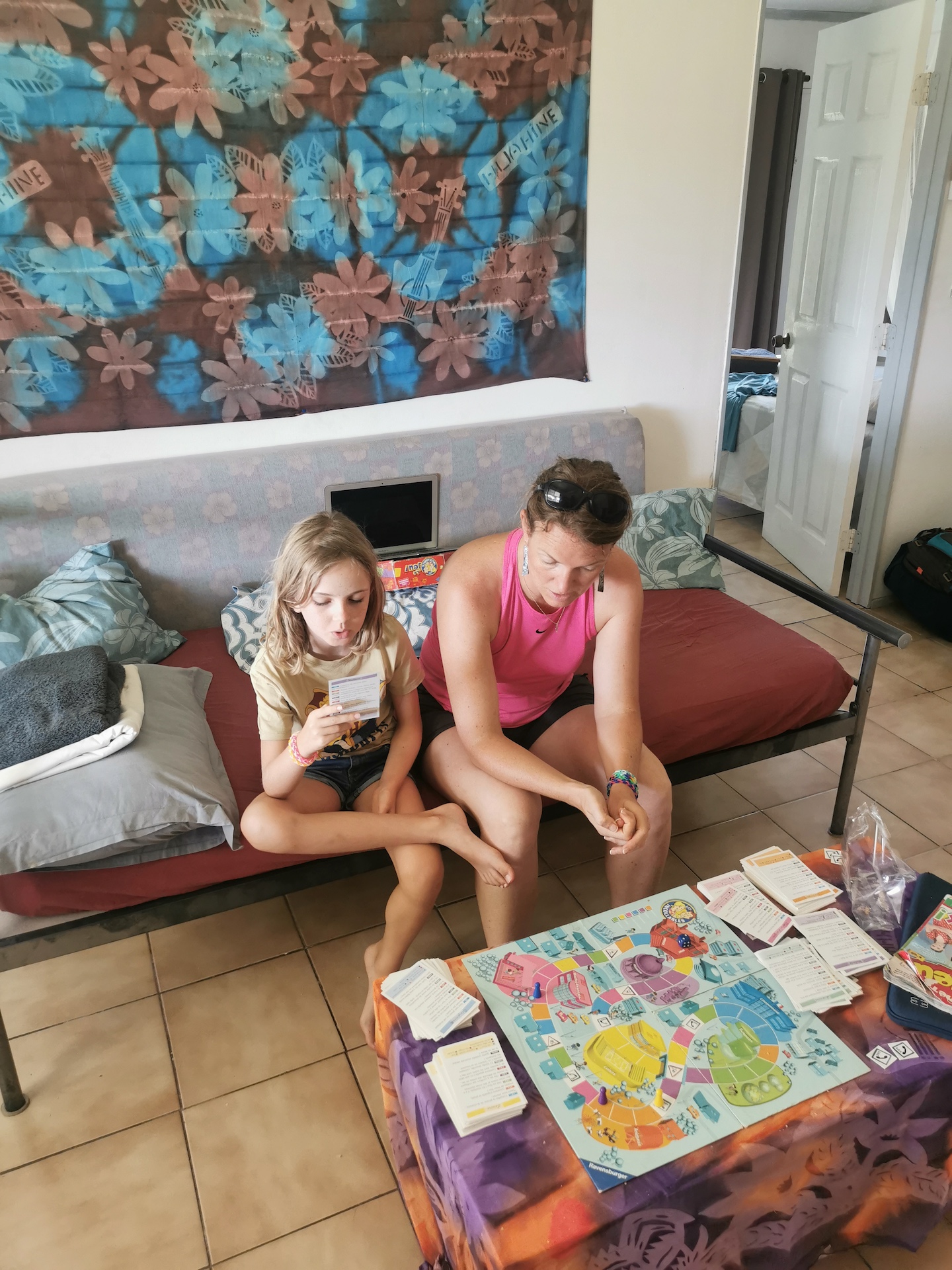 A l’intérieur, les filles sont contentes de voir que, pour la première fois en Polynésie, elles auront chacune leur chambre!! Bon, Estelle, c’est au salon 😉. Nous découvrons qu’il y a des livres et quelques jeux de société au salon. Les filles s’empressent de lire les petits livres puis nous nous lançons dans une partie des « Incollables ».