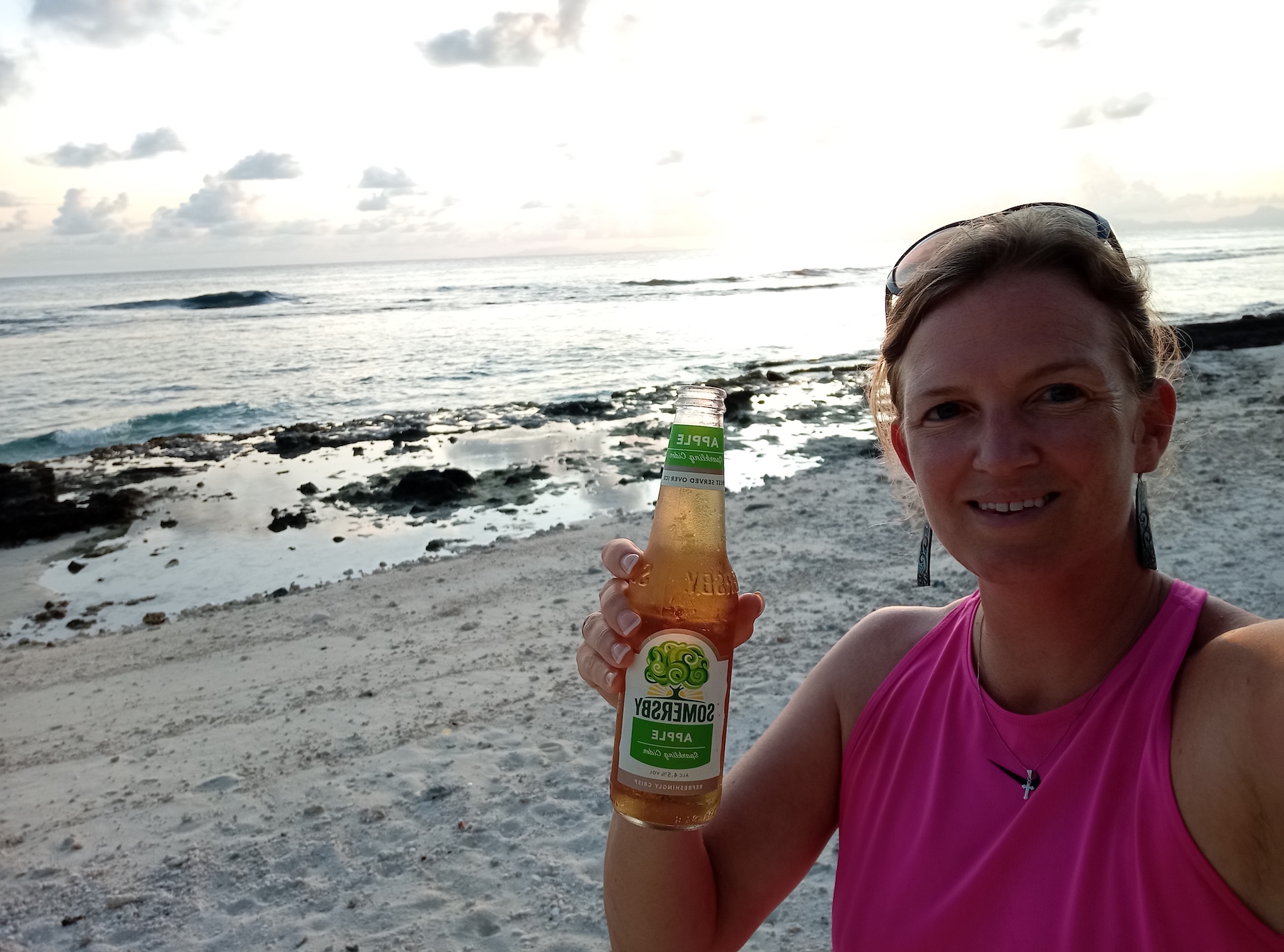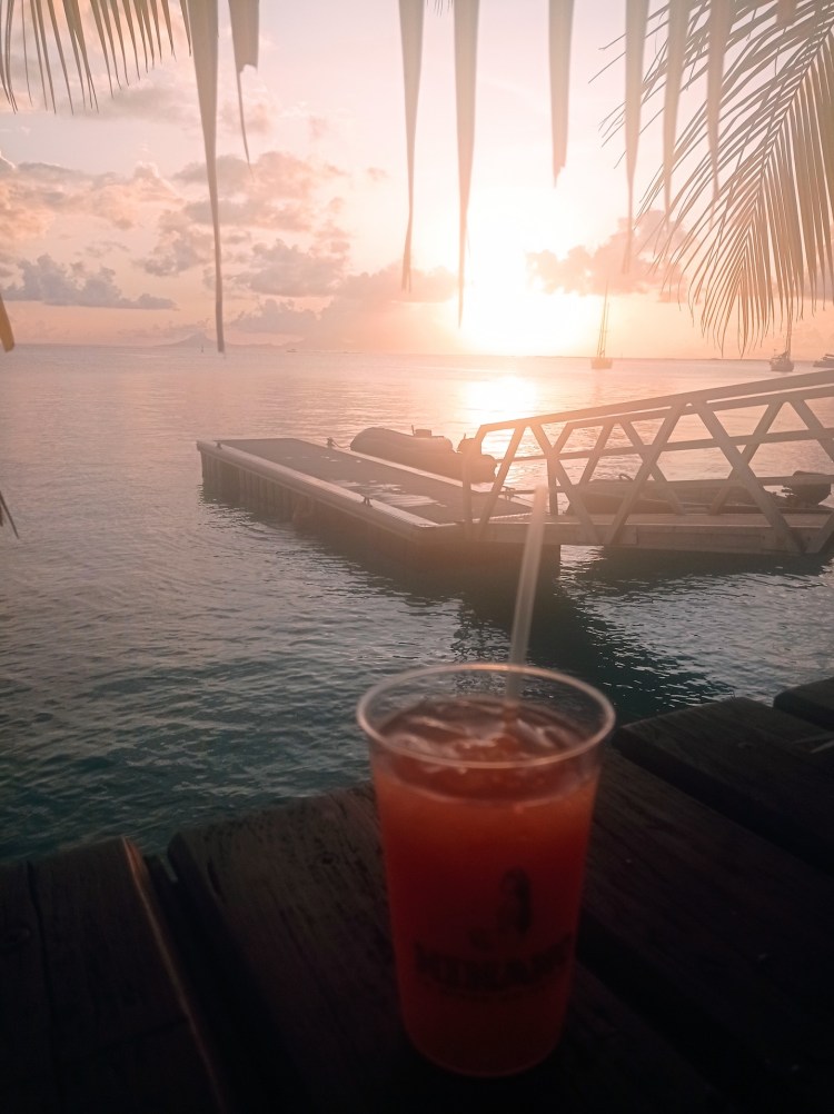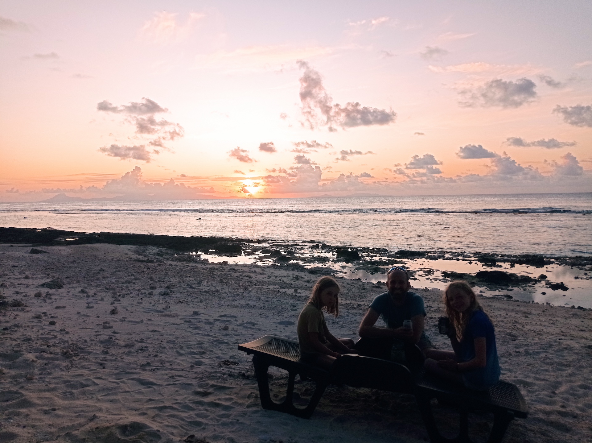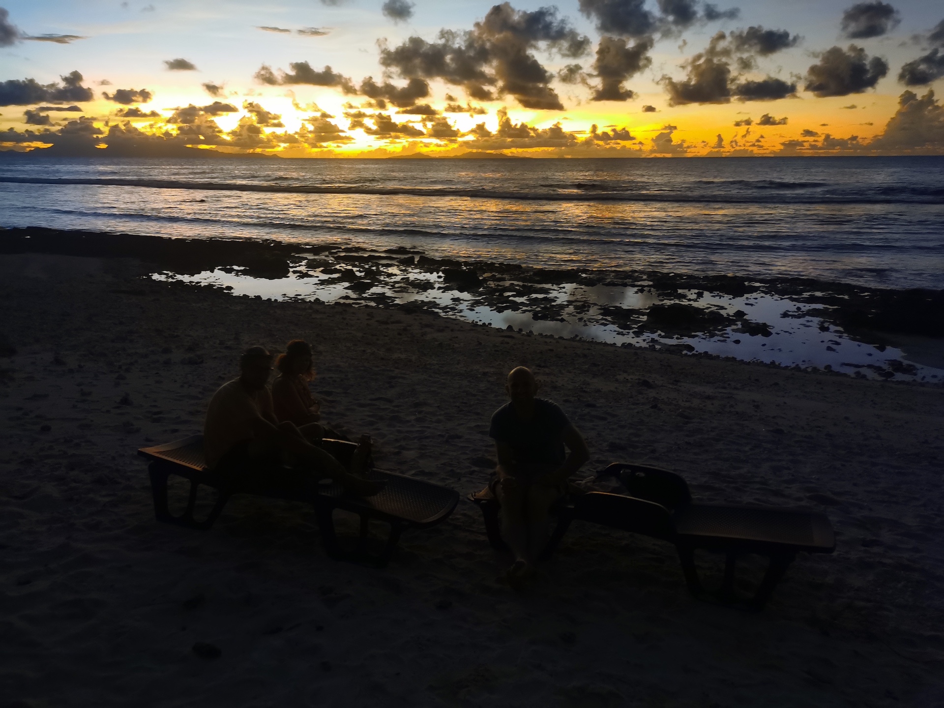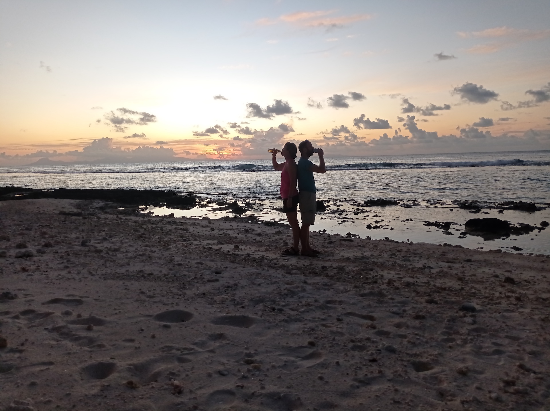 Après nous être rendus au supermarché pour acheter de quoi nous nourrir ces prochains jours, nous partons prendre l’apéro sur la plage au coucher du soleil. Magnifique!