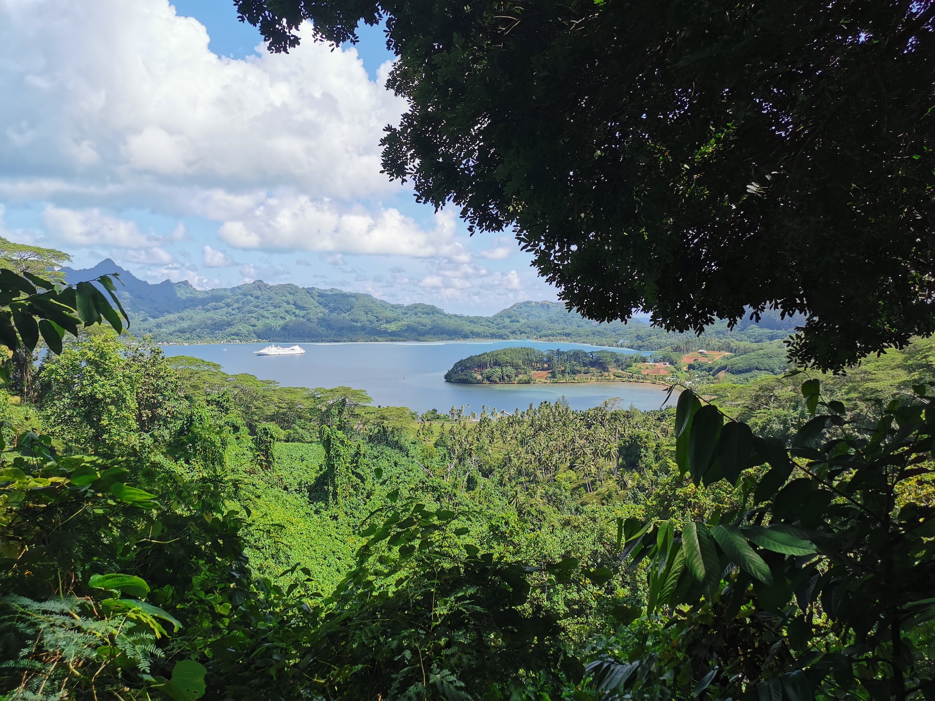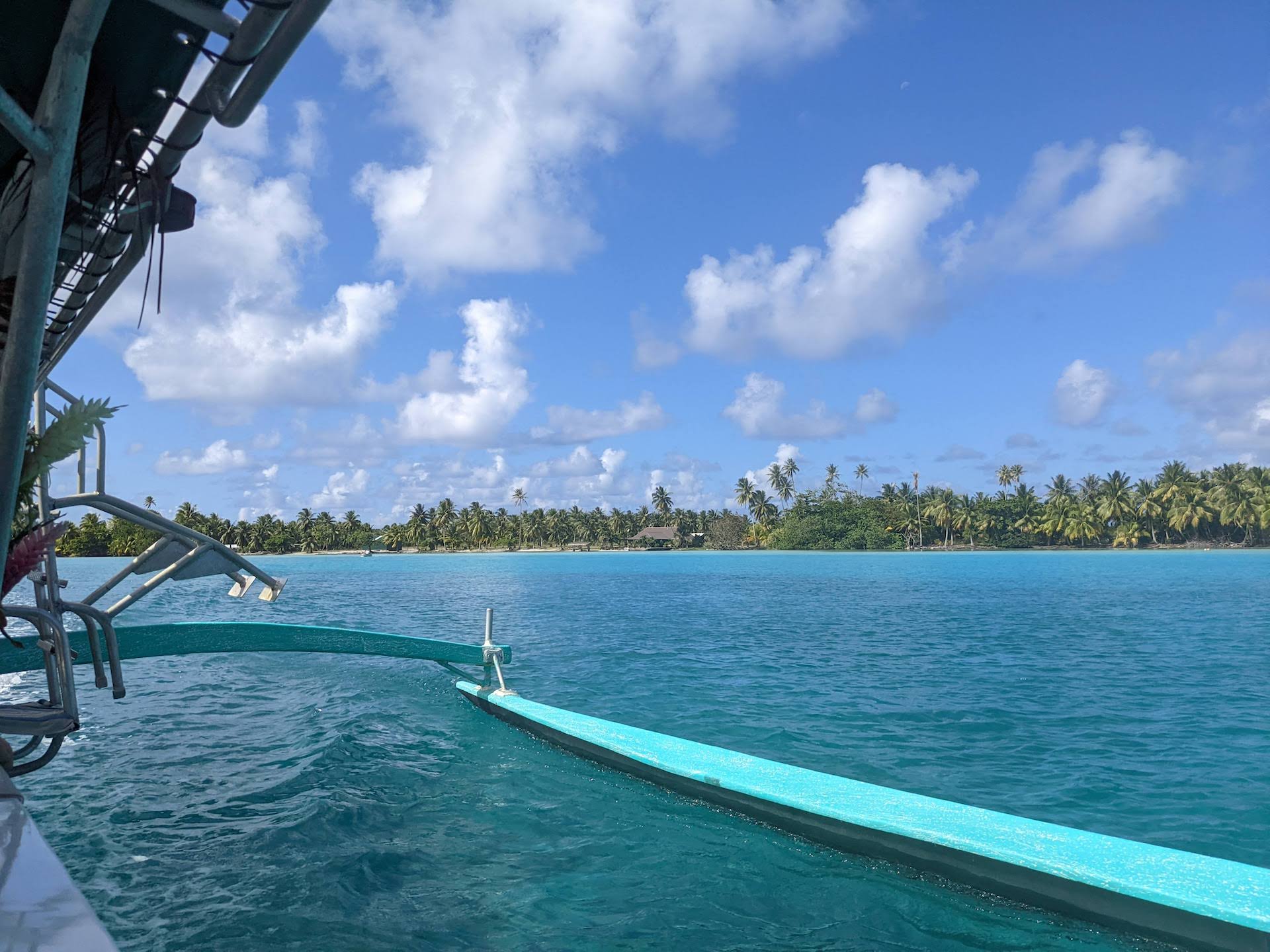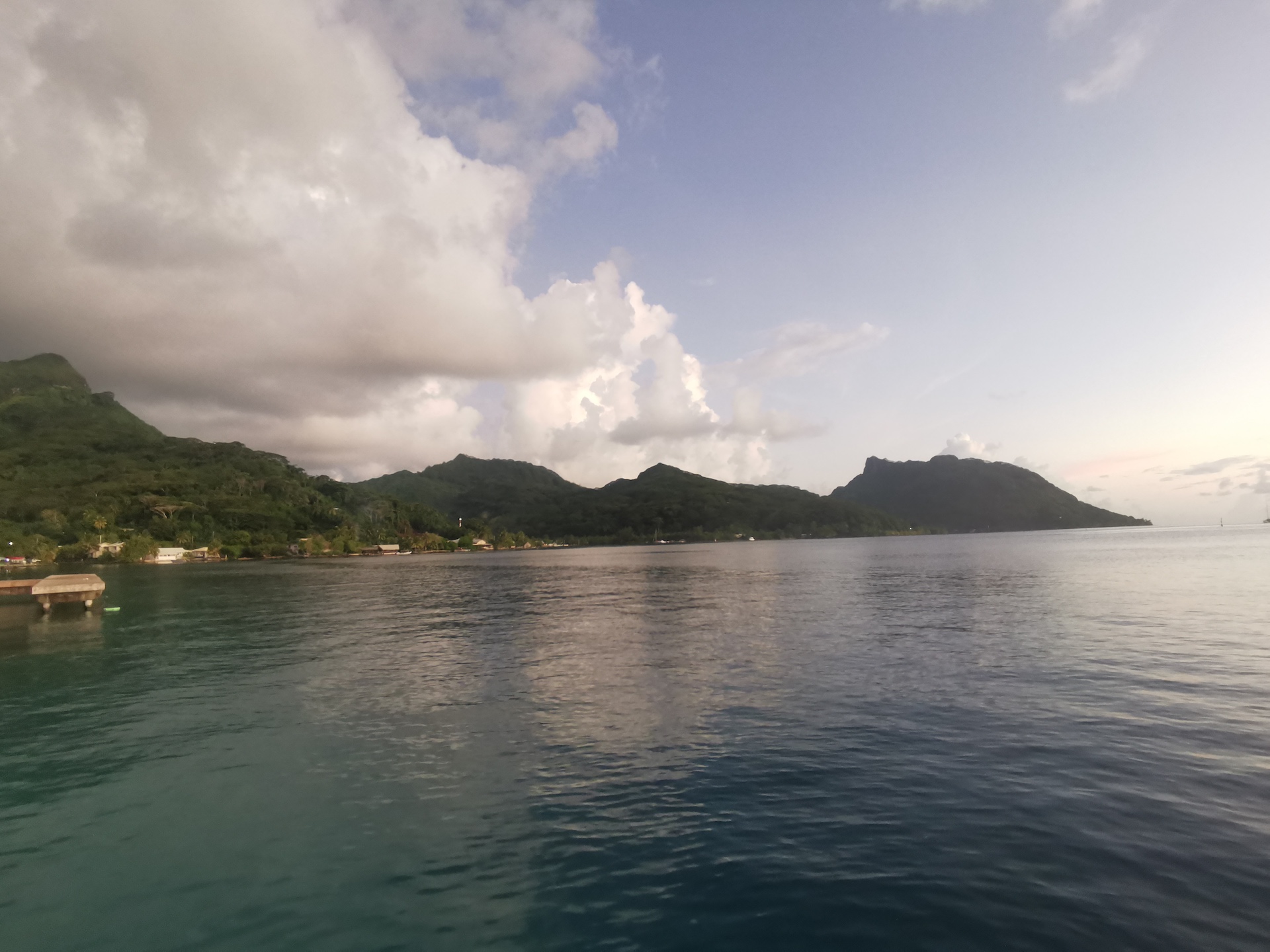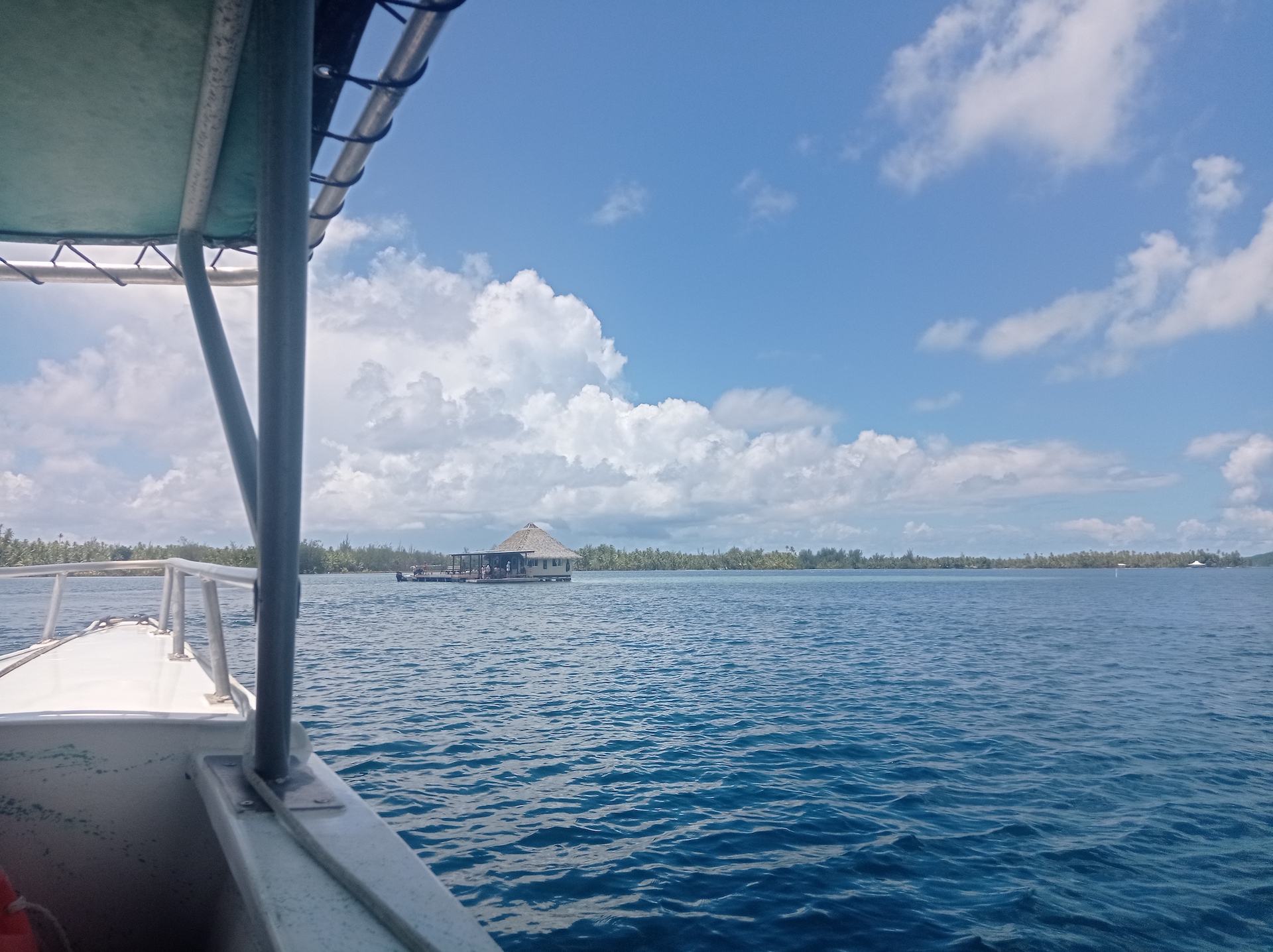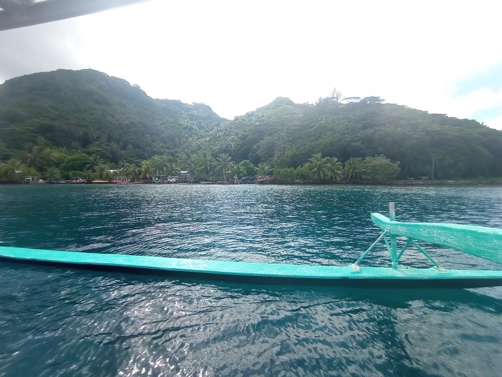 Après une dizaine de minutes de navigation en musique, nous passons devant un village de pêcheurs qui n’est accessible qu’en bateau. Ils pêchent des poissons, des langoustes et des bénitiers. Leurs enfants vont à l’école en bateau, mais si la mer est trop agitée, ils ne peuvent pas s’y rendre. C’est durant cette discussion que nous apprenons qu’il n’y a pas d’hôpital sur l’île mais seulement un dispensaire, comme c’est souvent le cas sur les îles de Polynésie. Si nécessaire, ils doivent aller sur Ra’iatea ou Tahiti. Les jeunes lycéens doivent également s’y déplacer car les écoles ici ne vont que jusqu’au cycle d’orientation.