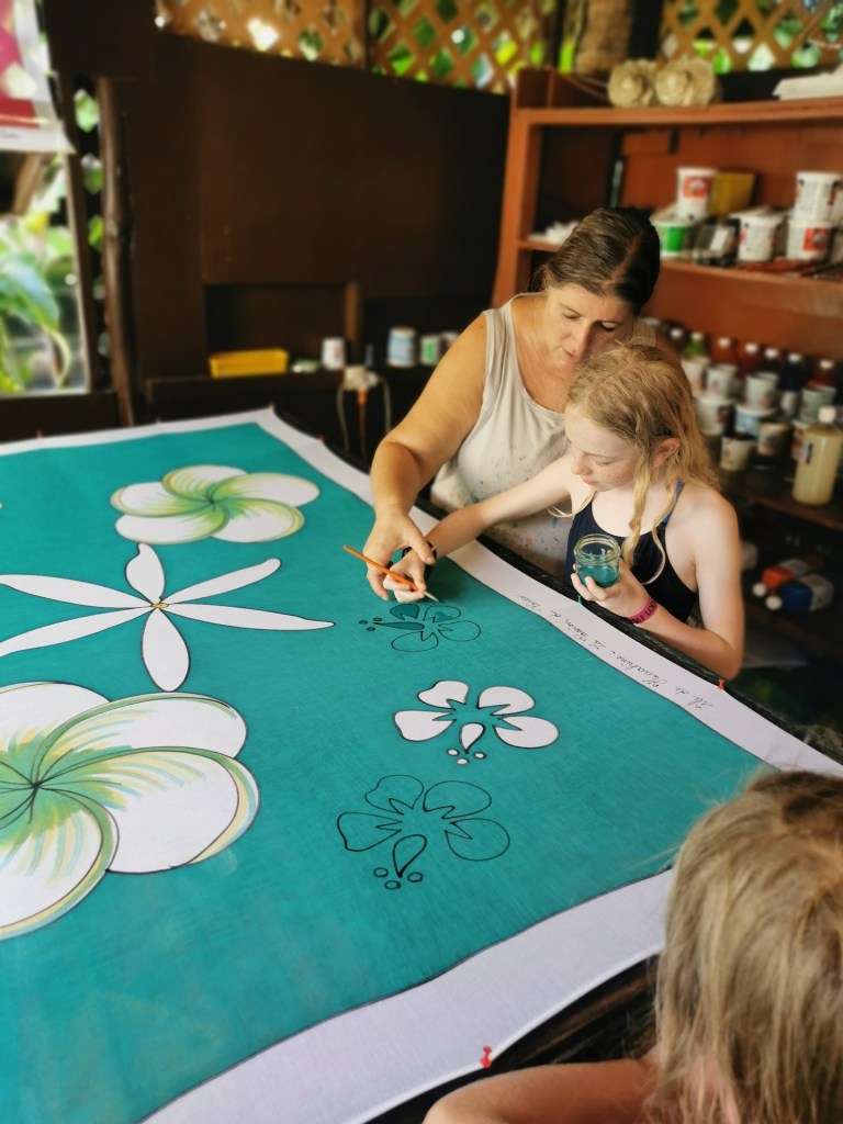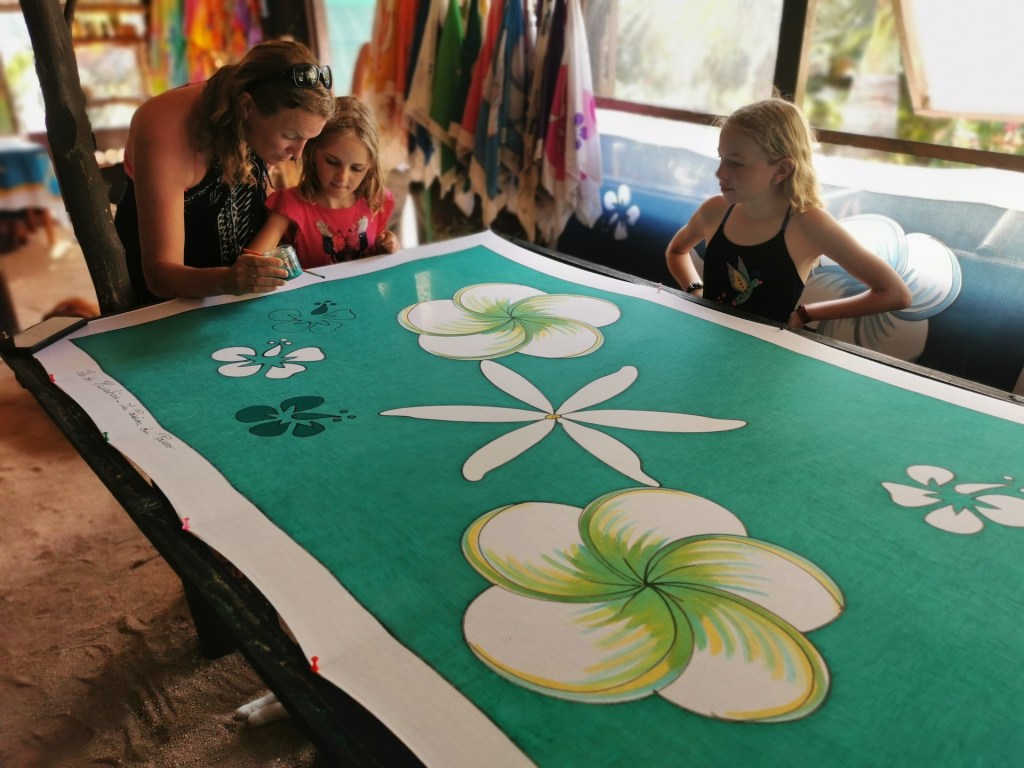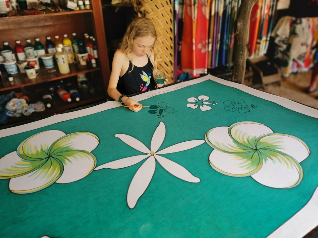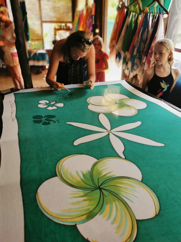 Les paréos de Polynésie sont réputés et nous ne manquons pas de nous arrêter chez une française de la métropole qui a appris cet art. Elle nous initie à la peinture sur paréo avec des couleurs qui plaisent énormément à Gabrielle 🤩.