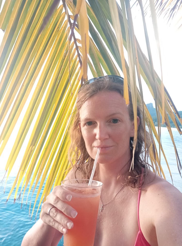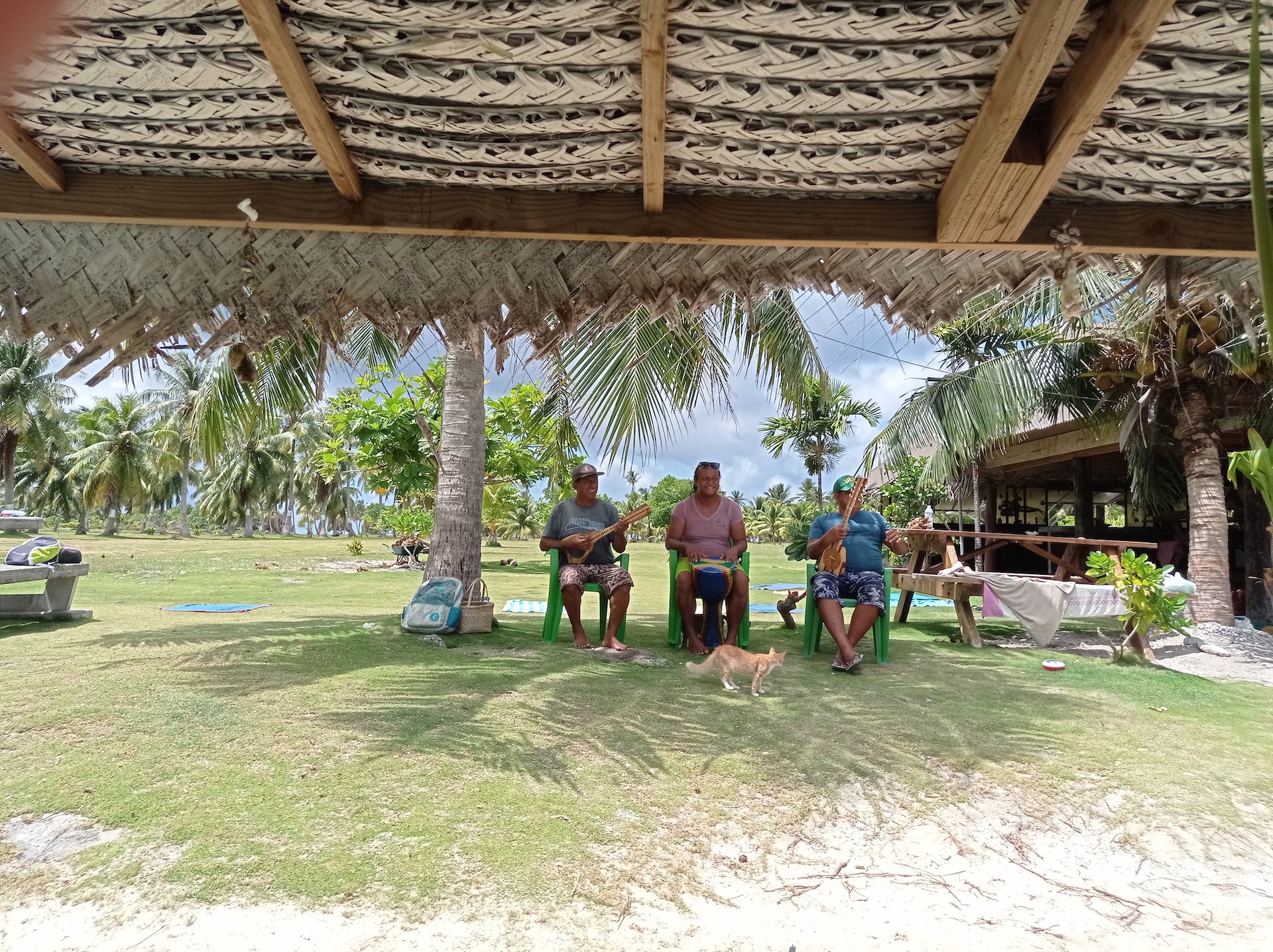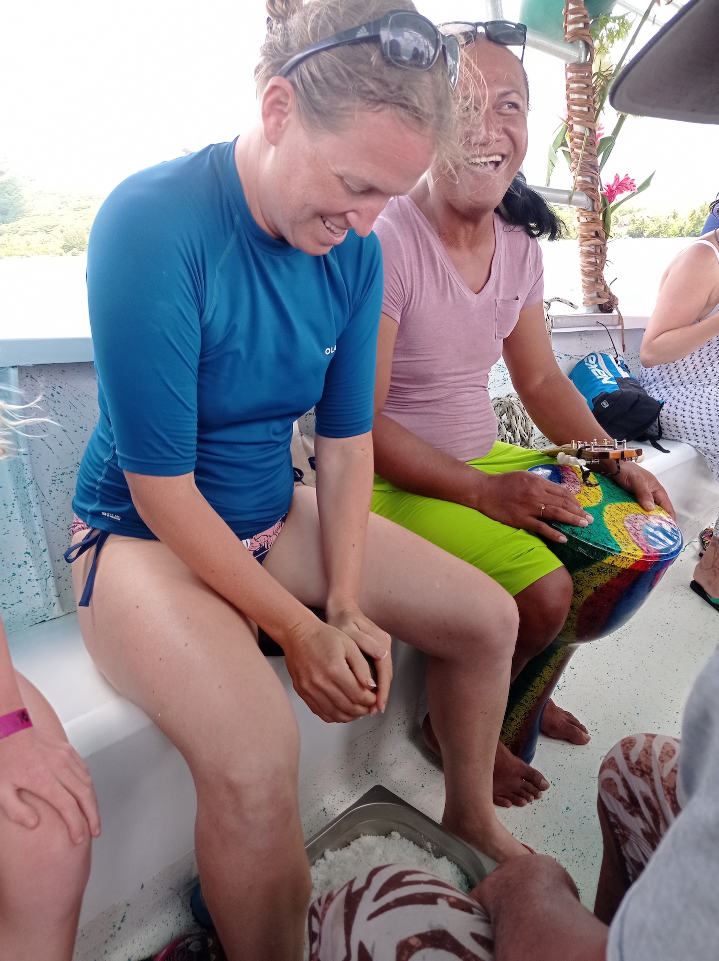 Après la baignade, nous retournons de l’autre côté, où les musiciens sont prêts pour nous entraîner dans une chorégraphie endiablée. Comme à Maupiti, Philippe arrive à y échapper car il s’est coupé le pied sur un corail… Une belle entaille en emporte-pièce il faut dire 🤪.