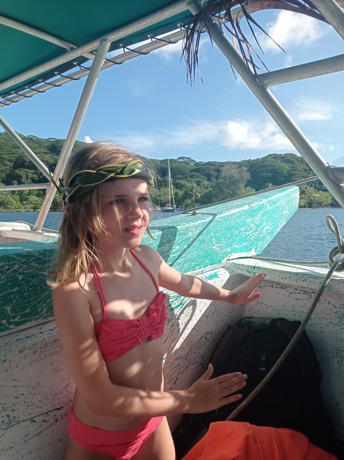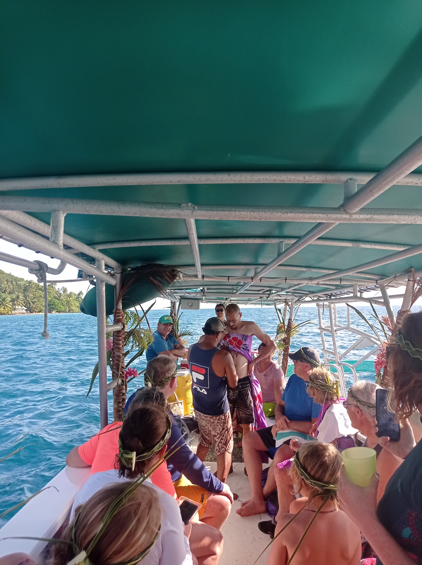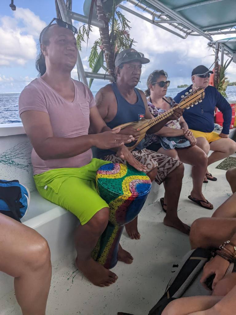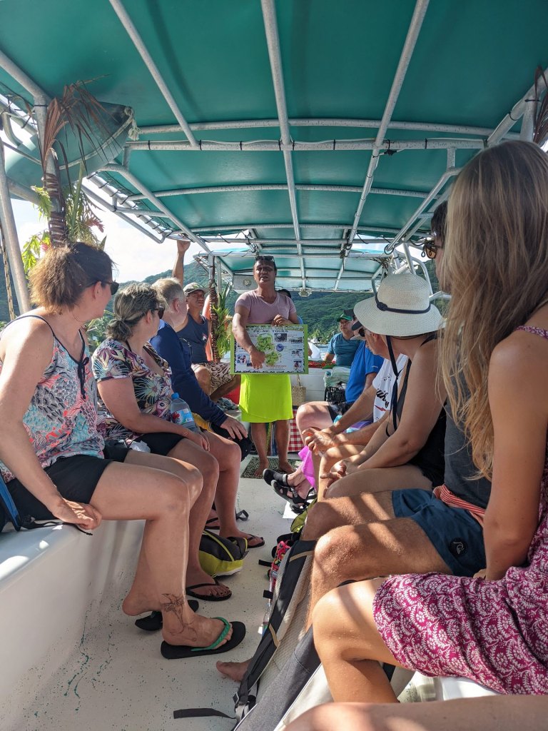 Pour notre dernier jour sur Huahine, nous partons avec les Calvayrac en bateau pour faire le tour de l’île. Nous sommes une quinzaine, accompagnés par l’hôte des Calvayrac, un guide et un musicien.
