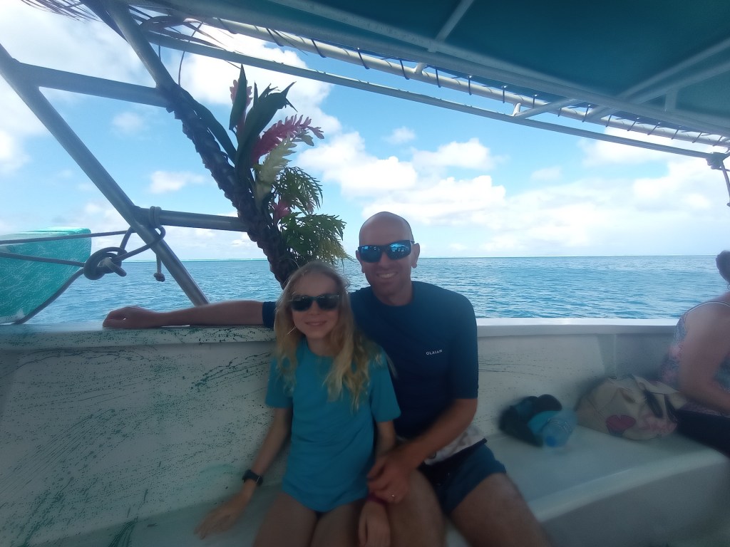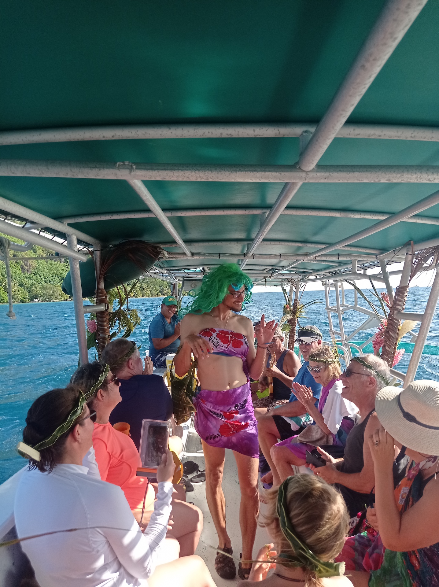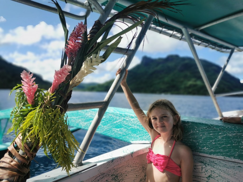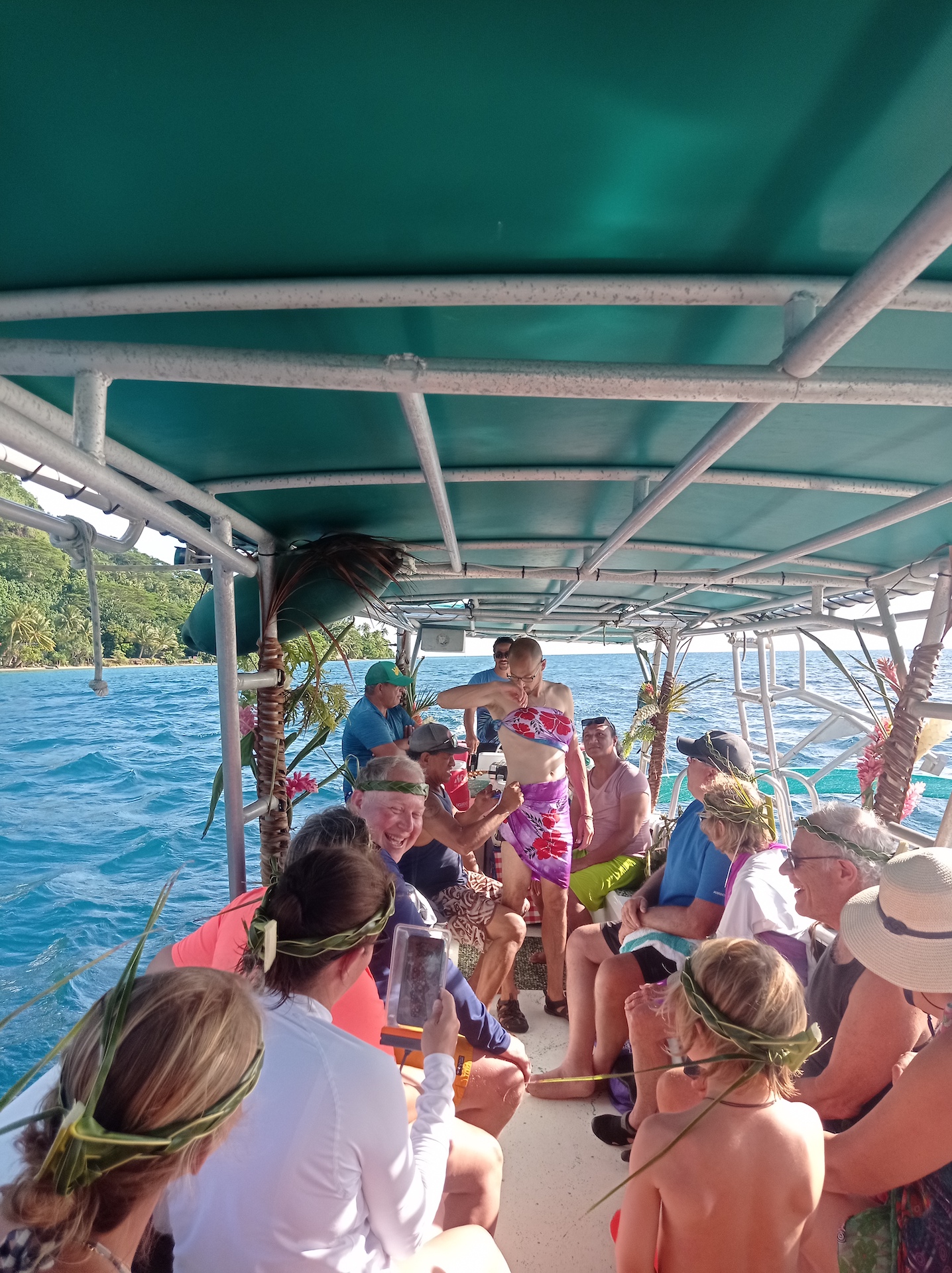 Pour notre dernier jour sur Huahine, nous partons avec les Calvayrac en bateau pour faire le tour de l’île. Nous sommes une quinzaine, accompagnés par l’hôte des Calvayrac, un guide et un musicien.