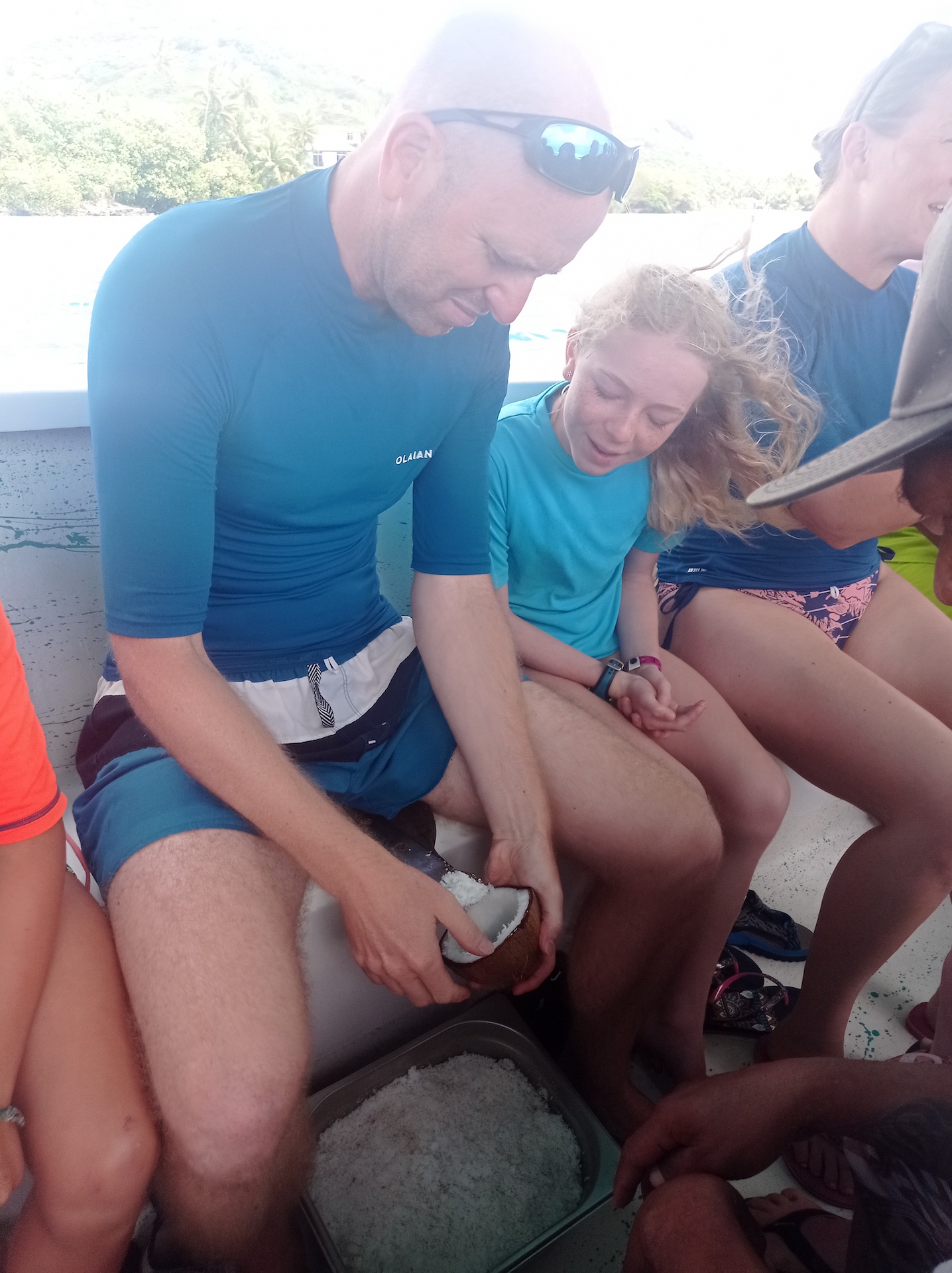 Le temps file et nos estomacs commencent à crier famine. Nous allons manger sur le terrain du patron de l’agence qui se trouve sur un motu encore sauvage. Pour nous faire patienter, notre guide nous montre comment râper la noix de coco afin d’en extraire son lait. Ça demande des muscles! 💪🏻