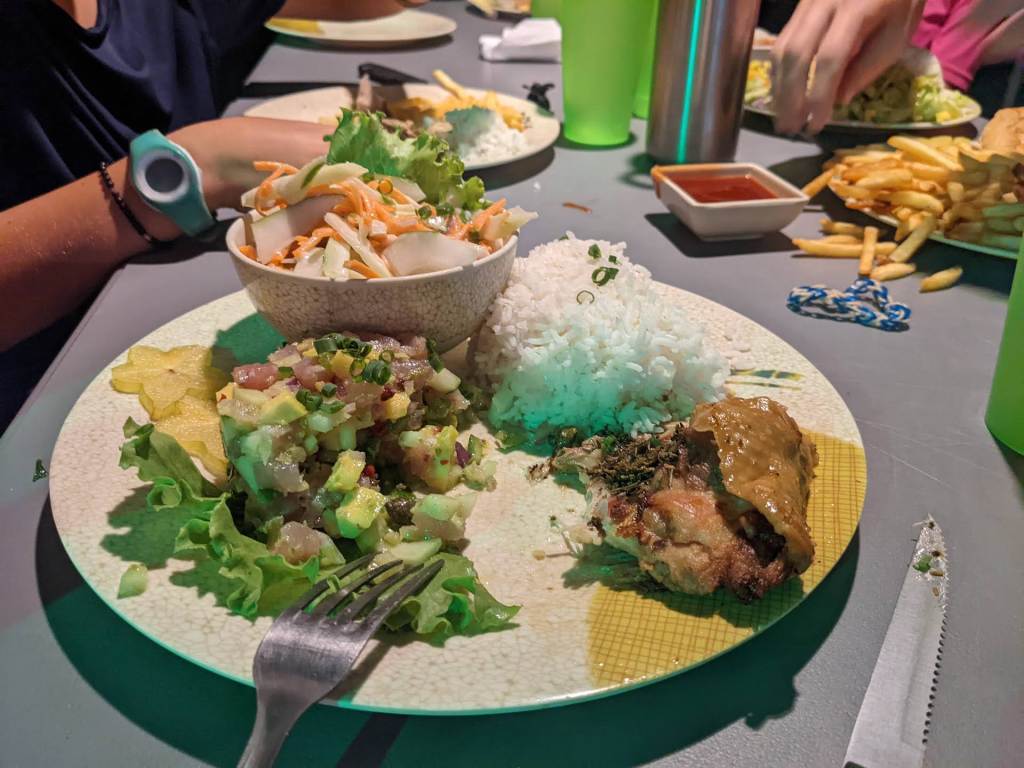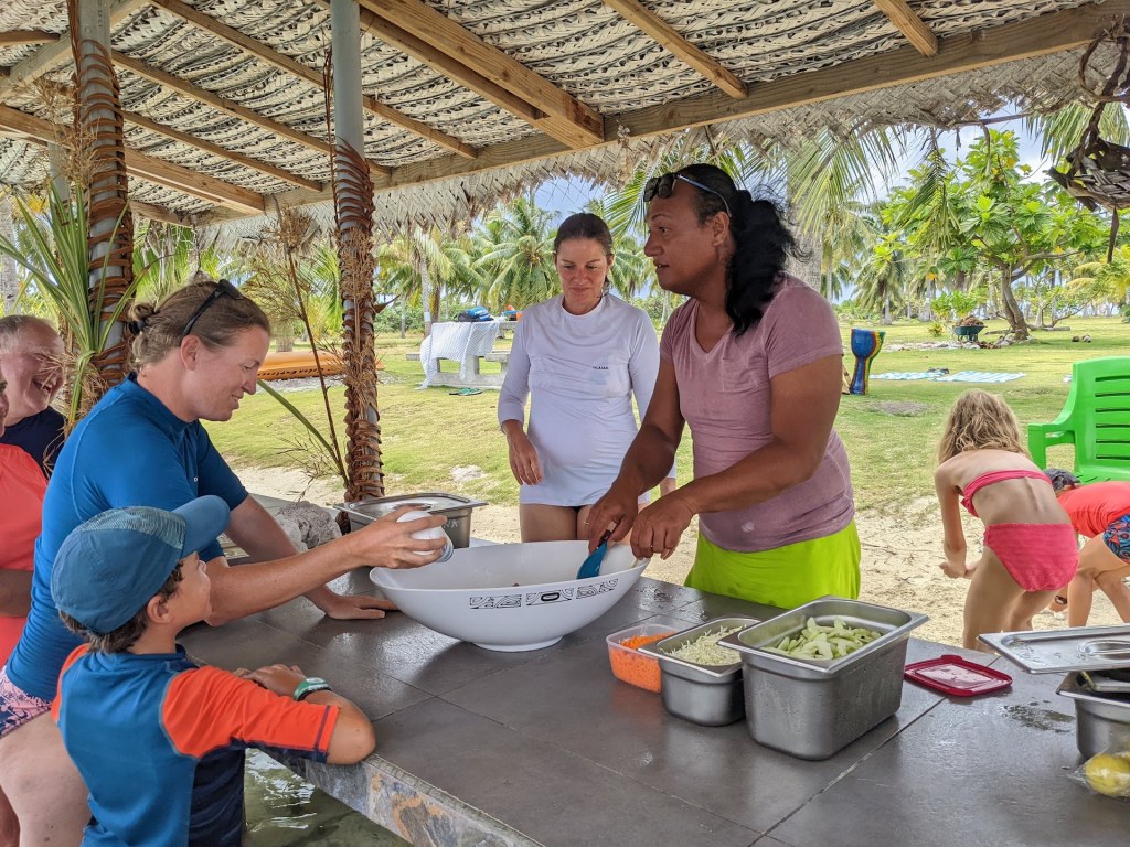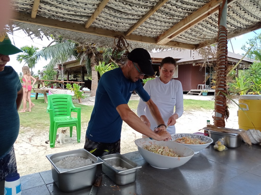 Notre guide et son chef nous initient à la recette du poisson à la tahitienne et ils nous font participer. Adrien sera choisi pour extraire le lait de coco de nos « rapures » et Gabrielle pour ajouter le sel.