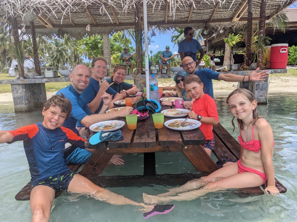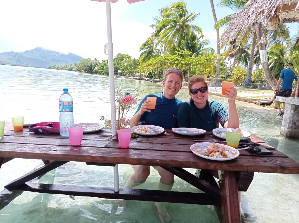 En arrivant sur le motu, nous avons la surprise de voir que nous allons manger les pieds dans l’eau 😃😎.