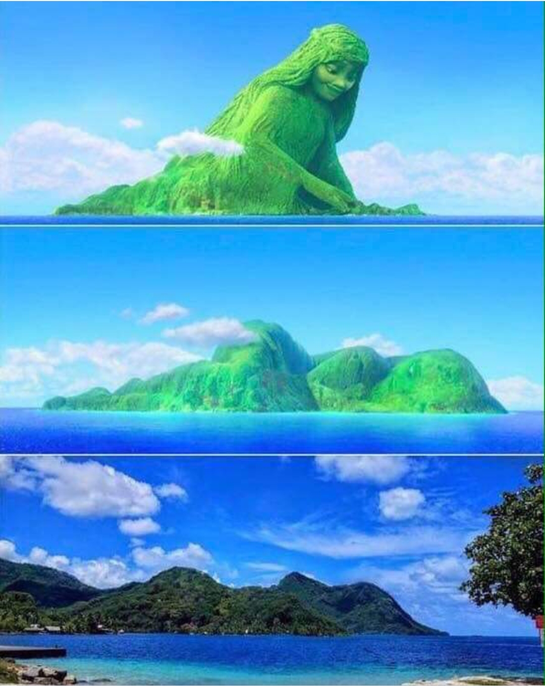 - Tout d’abord, le profil des sommets de l’île fait penser à une femme couchée ce qui a donné l’idée pour la fin du film. En effet, en conlusion du dessin animé, Te Fiti, la déesse de la nature et de la vie, se couche et forme le profil particulier de cette île.