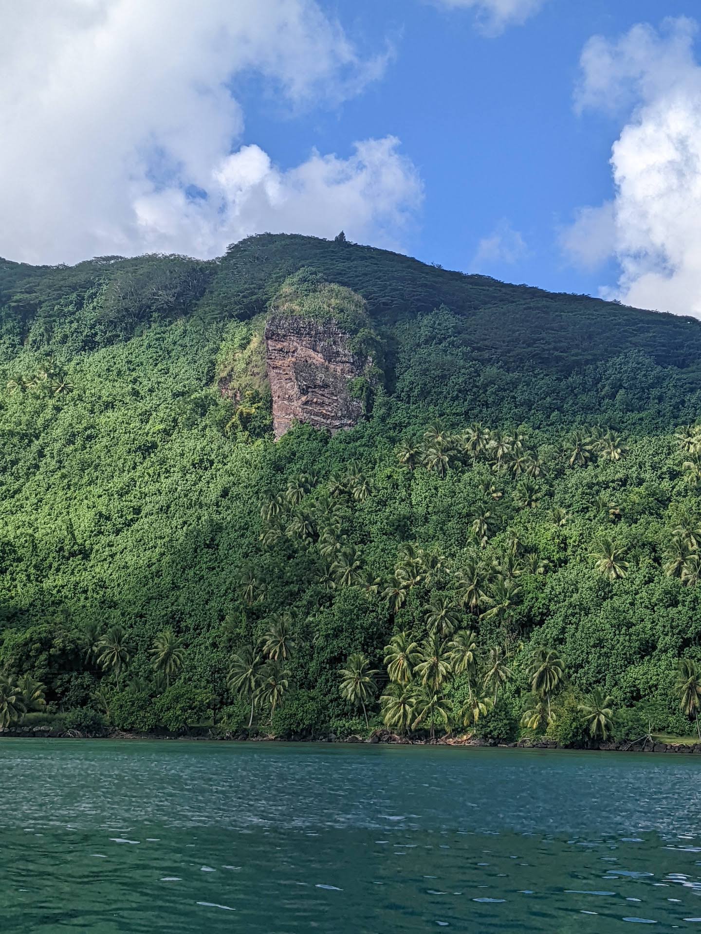 Nous continuons notre navigation autour de l’île et nous arrivons en vue de la falaise où se trouvent la rame et l’hameçon du dieu Hiro (voir la légende ci-dessus). Ils sont sur le rocher sans végétation: la rame est en grand, tout à droite, et l’hameçon juste à sa gauche, en blanc. Il faut un peu d’imagination…🙃.