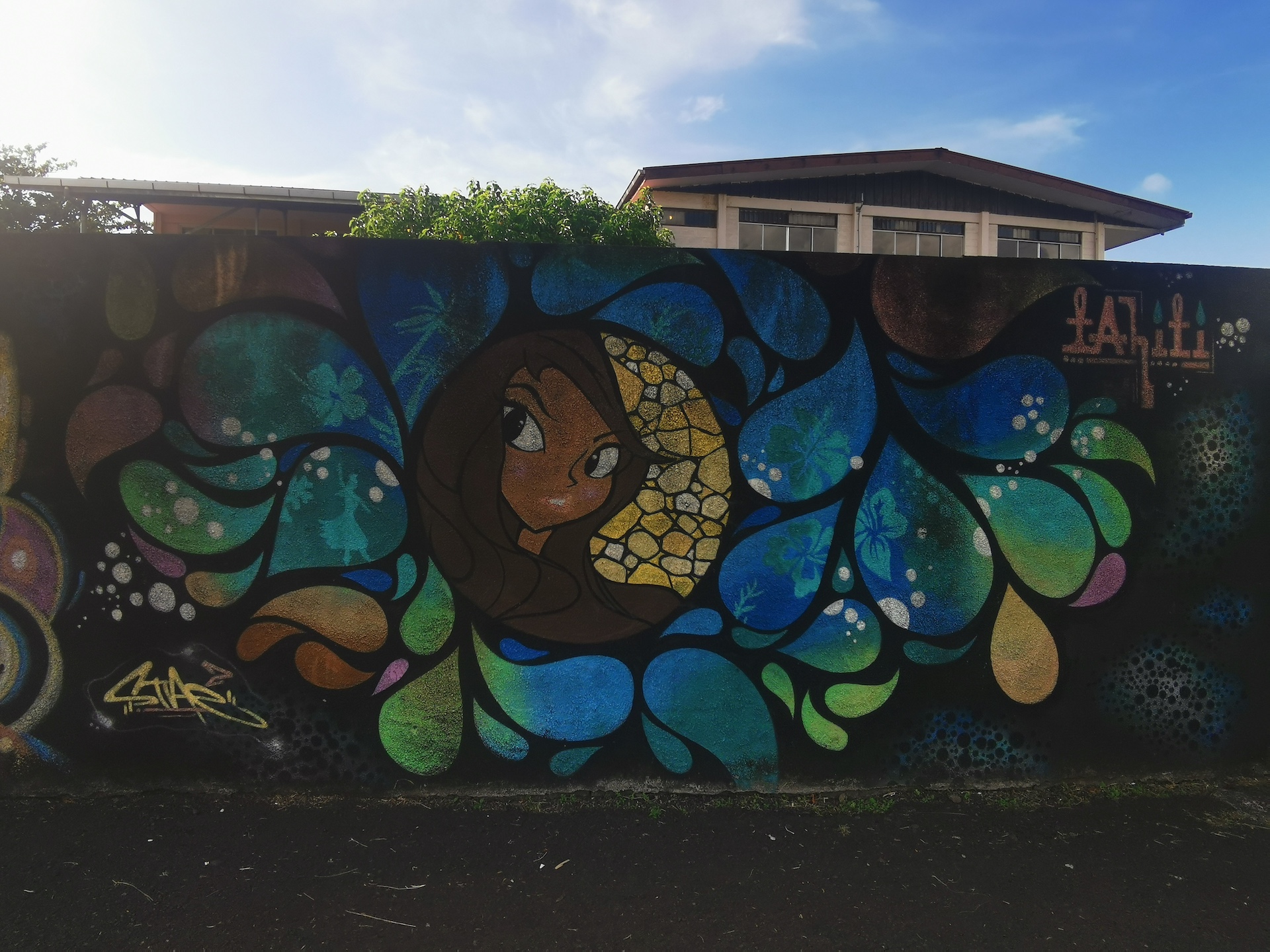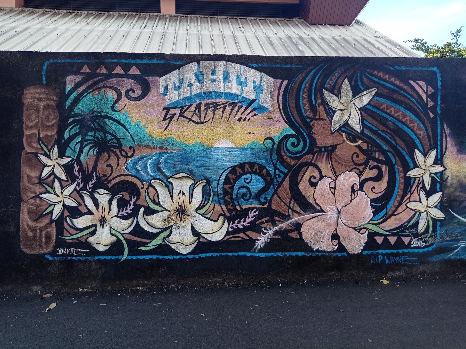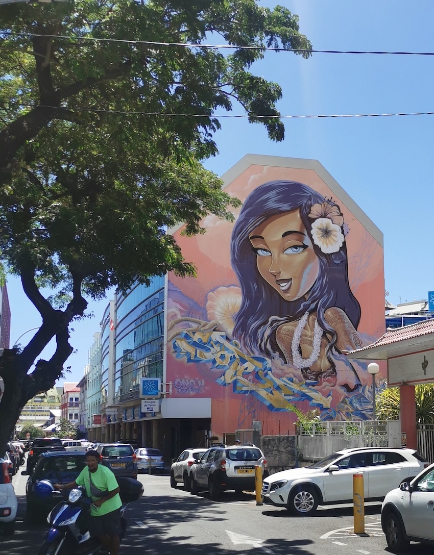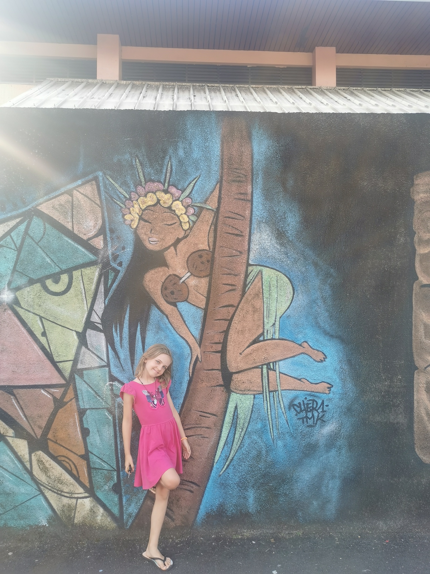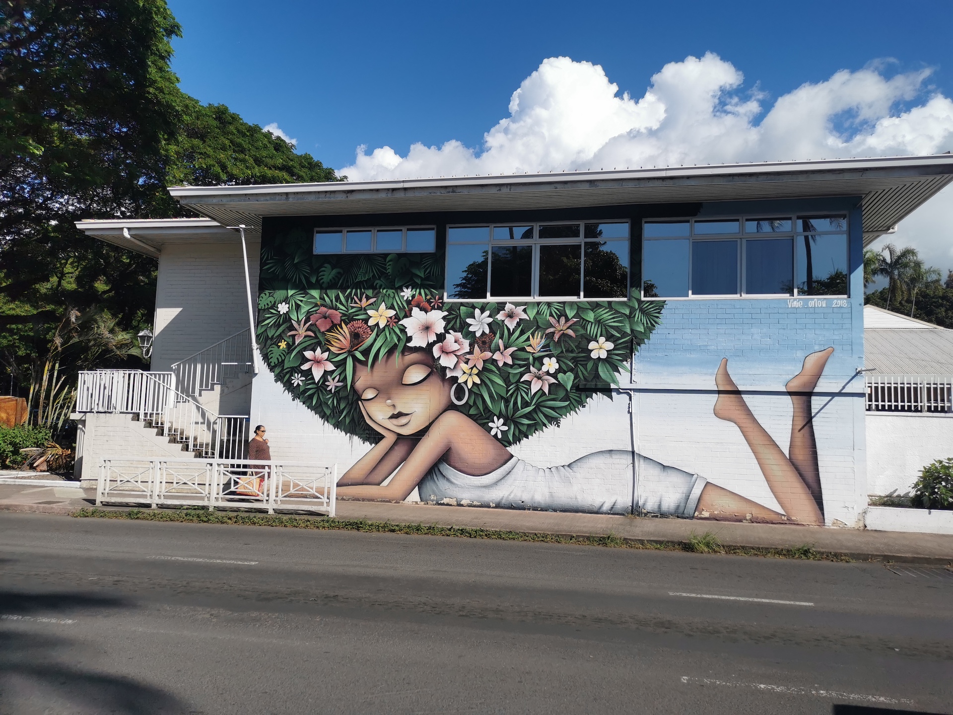 Pour la suite de la journée, nous avons prévu une balade artistique. En effet, nous avions remarqué il y a trois semaines que de nombreuses fresques ornent les murs de la ville. Après une recherche sur internet, nous apprenons qu’elles ont été réalisées durant le Ono’u Festival Tahiti qui a eu lieu à Papeete de 2014 à 2018. C’était un festival de street-art qui réunissait à la fois des artistes de renommée internationale et des artistes locaux fiers de leur culture. C’est, aujourd’hui, un véritable musée à ciel ouvert!