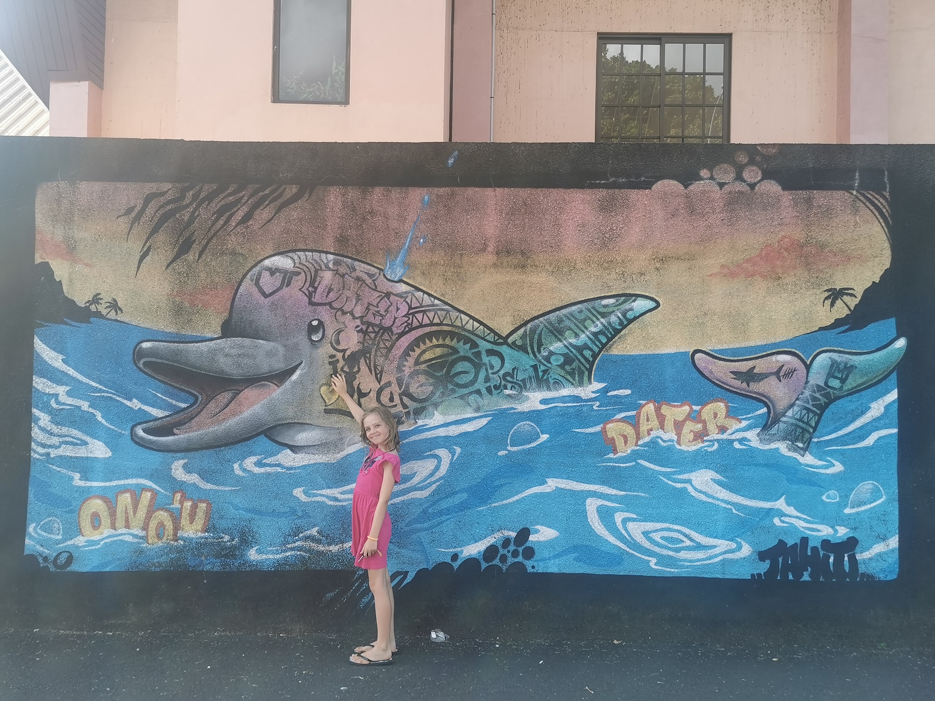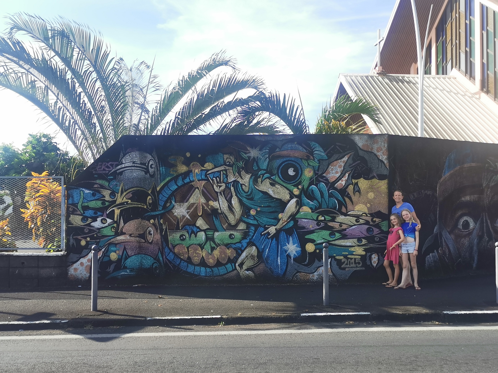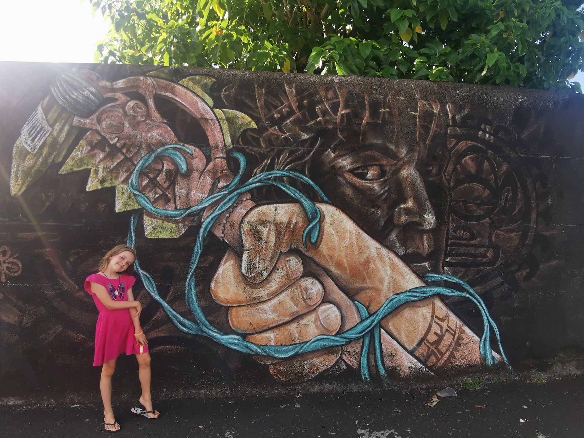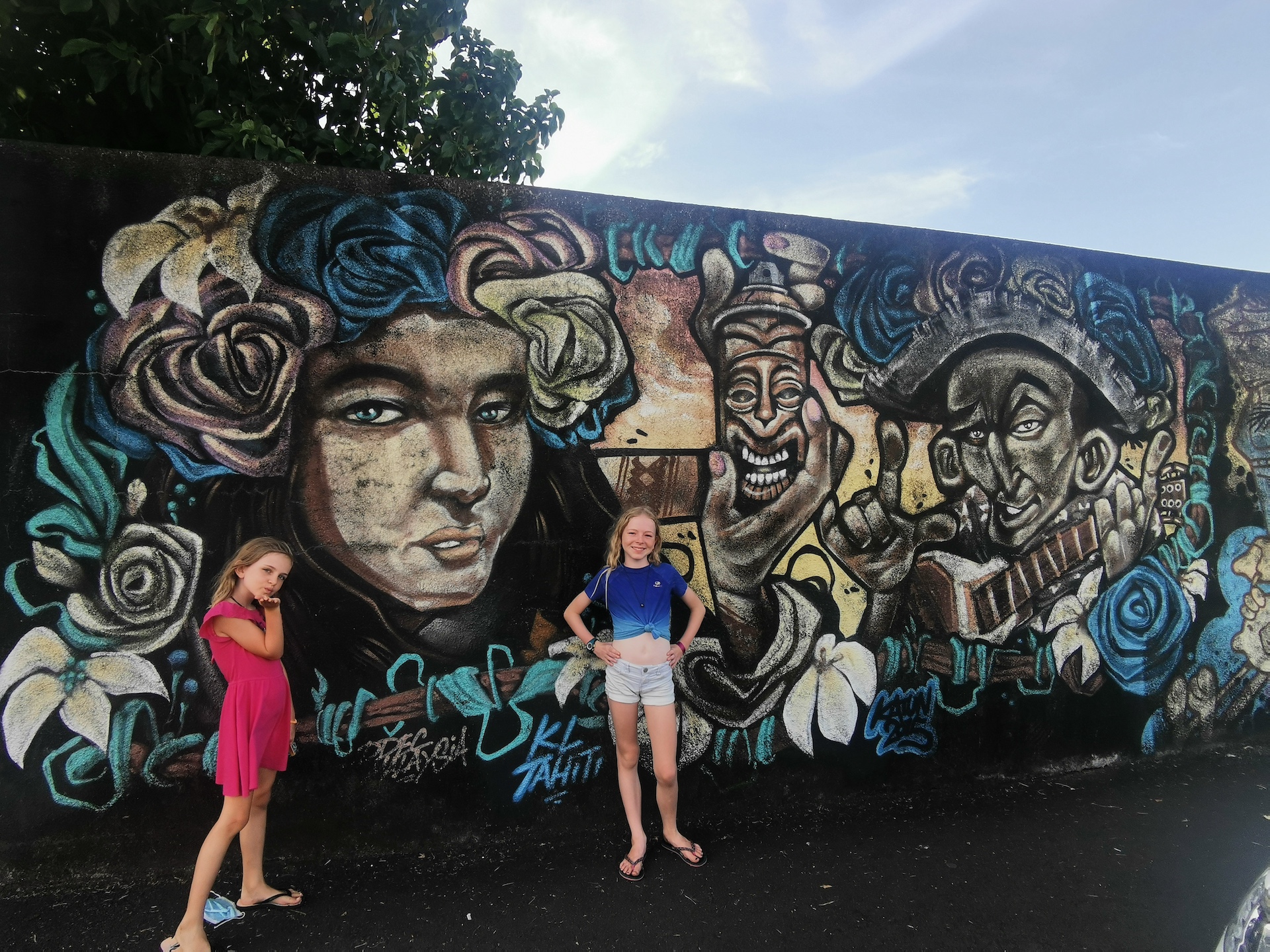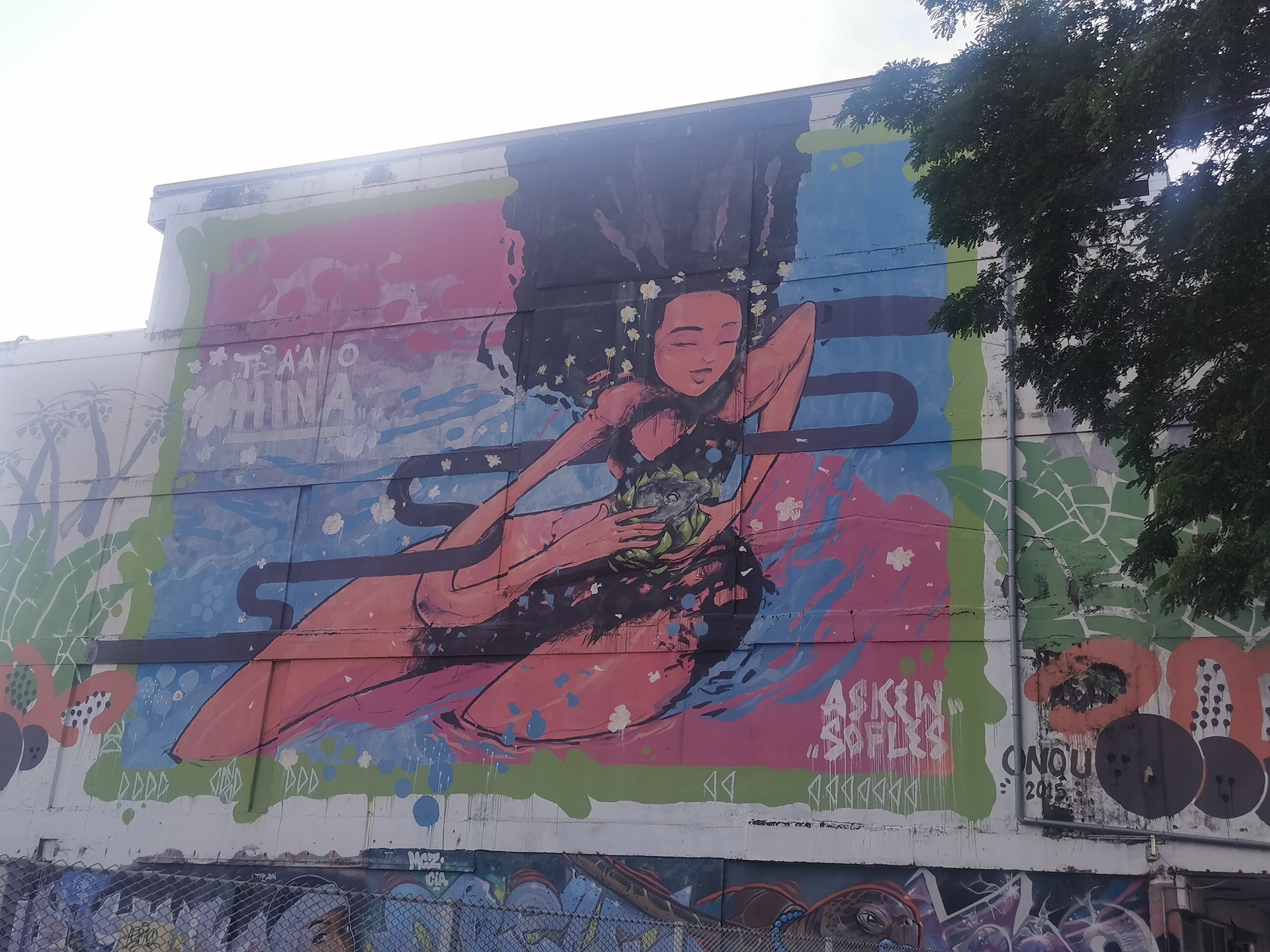 Pour la suite de la journée, nous avons prévu une balade artistique. En effet, nous avions remarqué il y a trois semaines que de nombreuses fresques ornent les murs de la ville. Après une recherche sur internet, nous apprenons qu’elles ont été réalisées durant le Ono’u Festival Tahiti qui a eu lieu à Papeete de 2014 à 2018. C’était un festival de street-art qui réunissait à la fois des artistes de renommée internationale et des artistes locaux fiers de leur culture. C’est, aujourd’hui, un véritable musée à ciel ouvert!