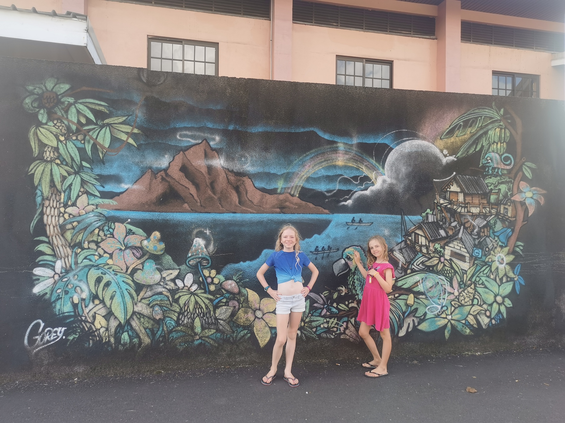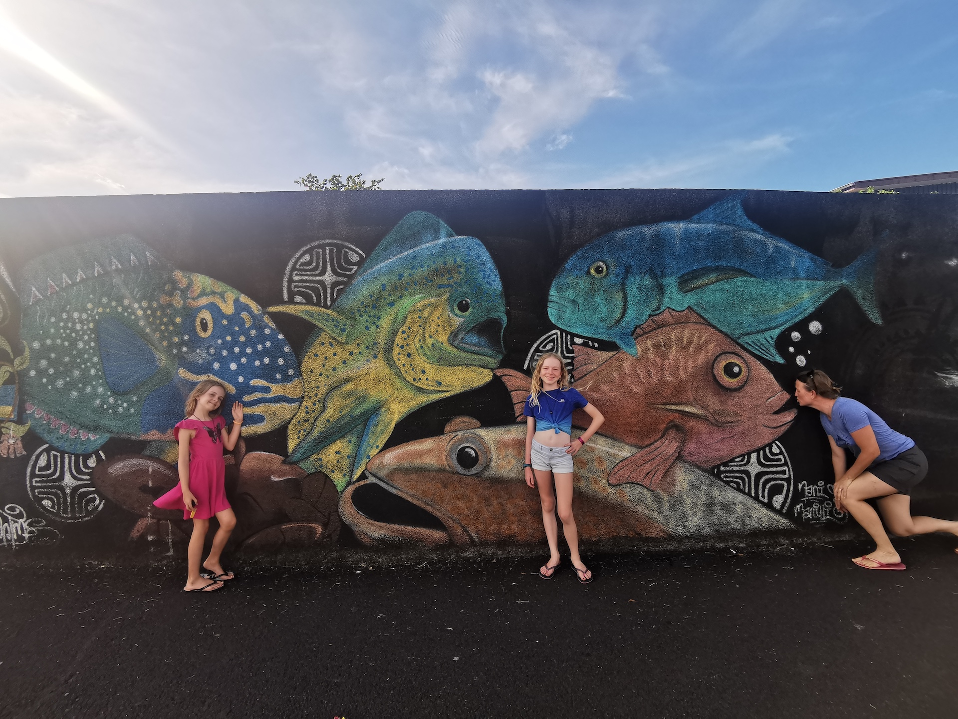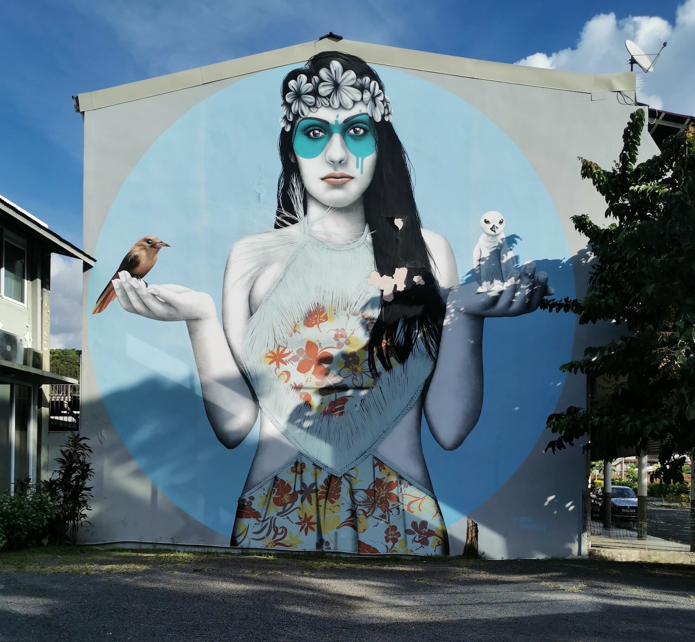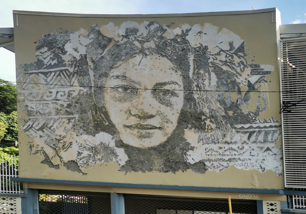 Pour la suite de la journée, nous avons prévu une balade artistique. En effet, nous avions remarqué il y a trois semaines que de nombreuses fresques ornent les murs de la ville. Après une recherche sur internet, nous apprenons qu’elles ont été réalisées durant le Ono’u Festival Tahiti qui a eu lieu à Papeete de 2014 à 2018. C’était un festival de street-art qui réunissait à la fois des artistes de renommée internationale et des artistes locaux fiers de leur culture. C’est, aujourd’hui, un véritable musée à ciel ouvert!