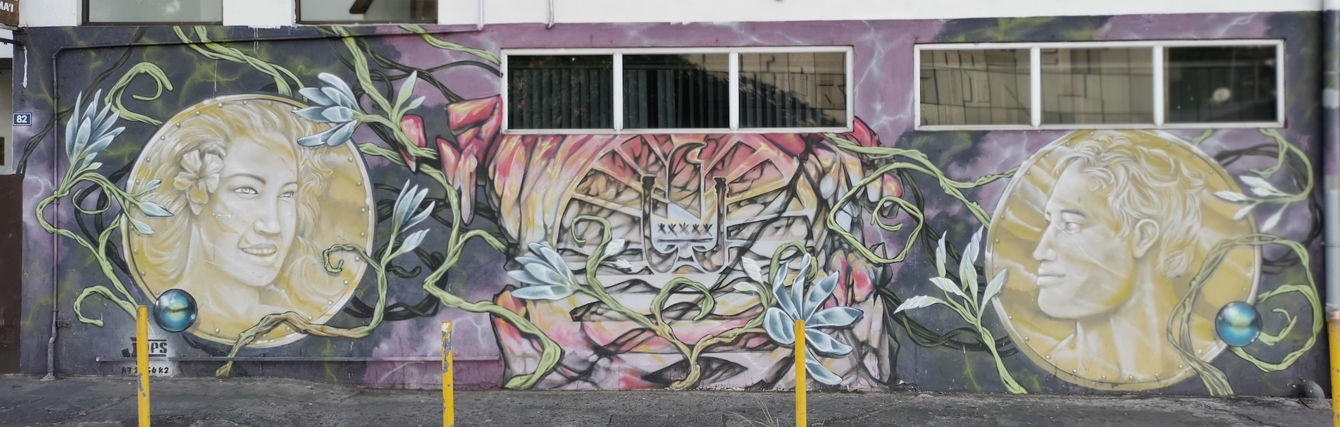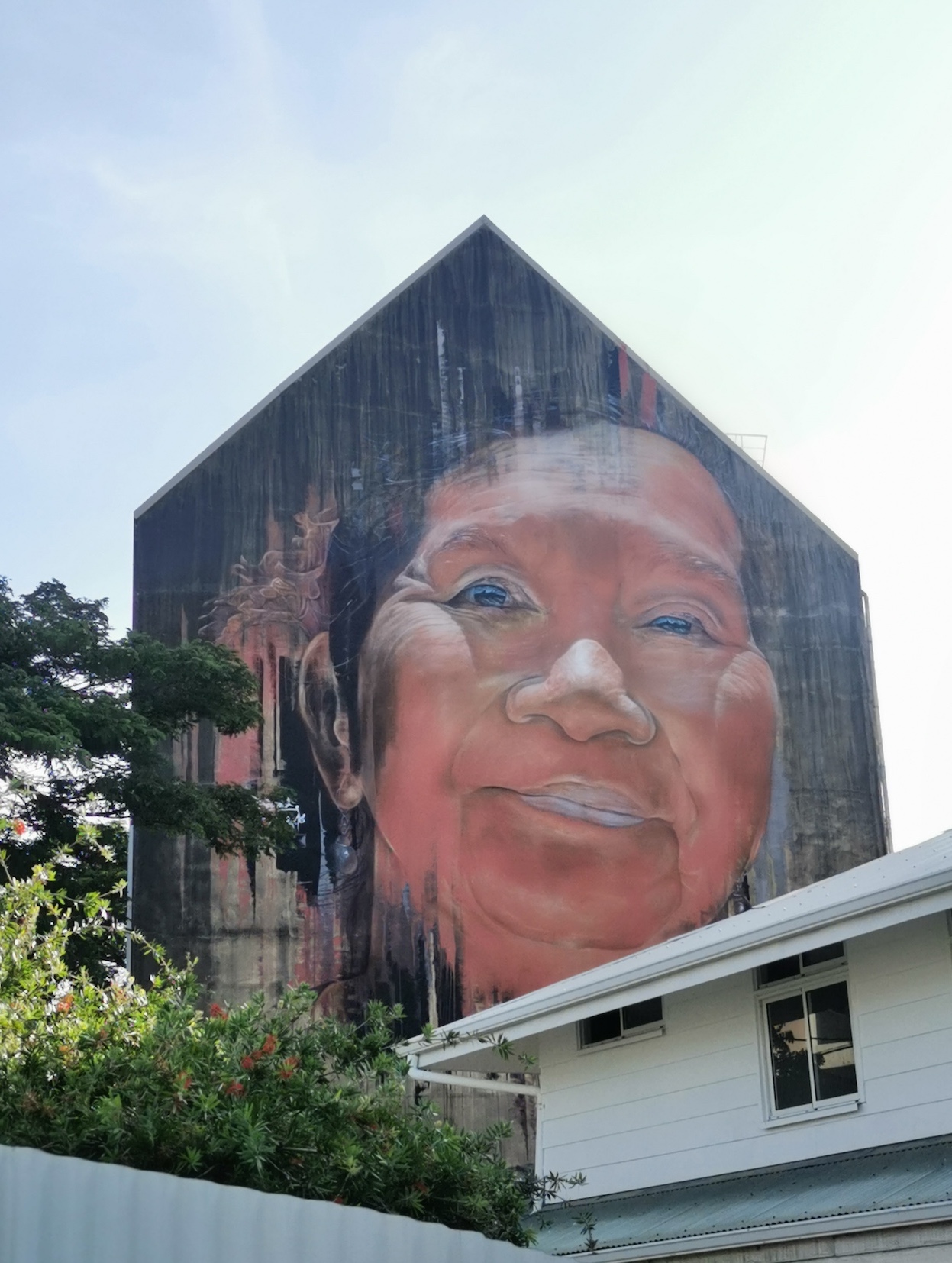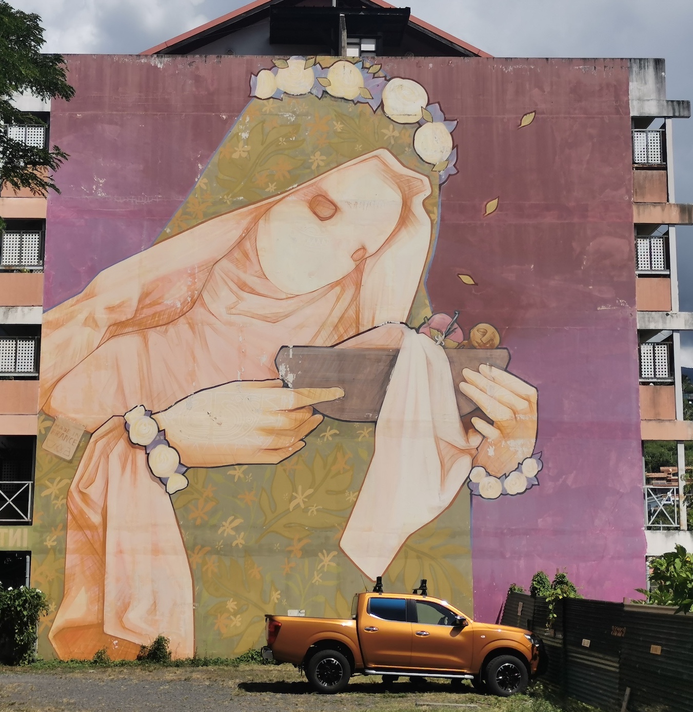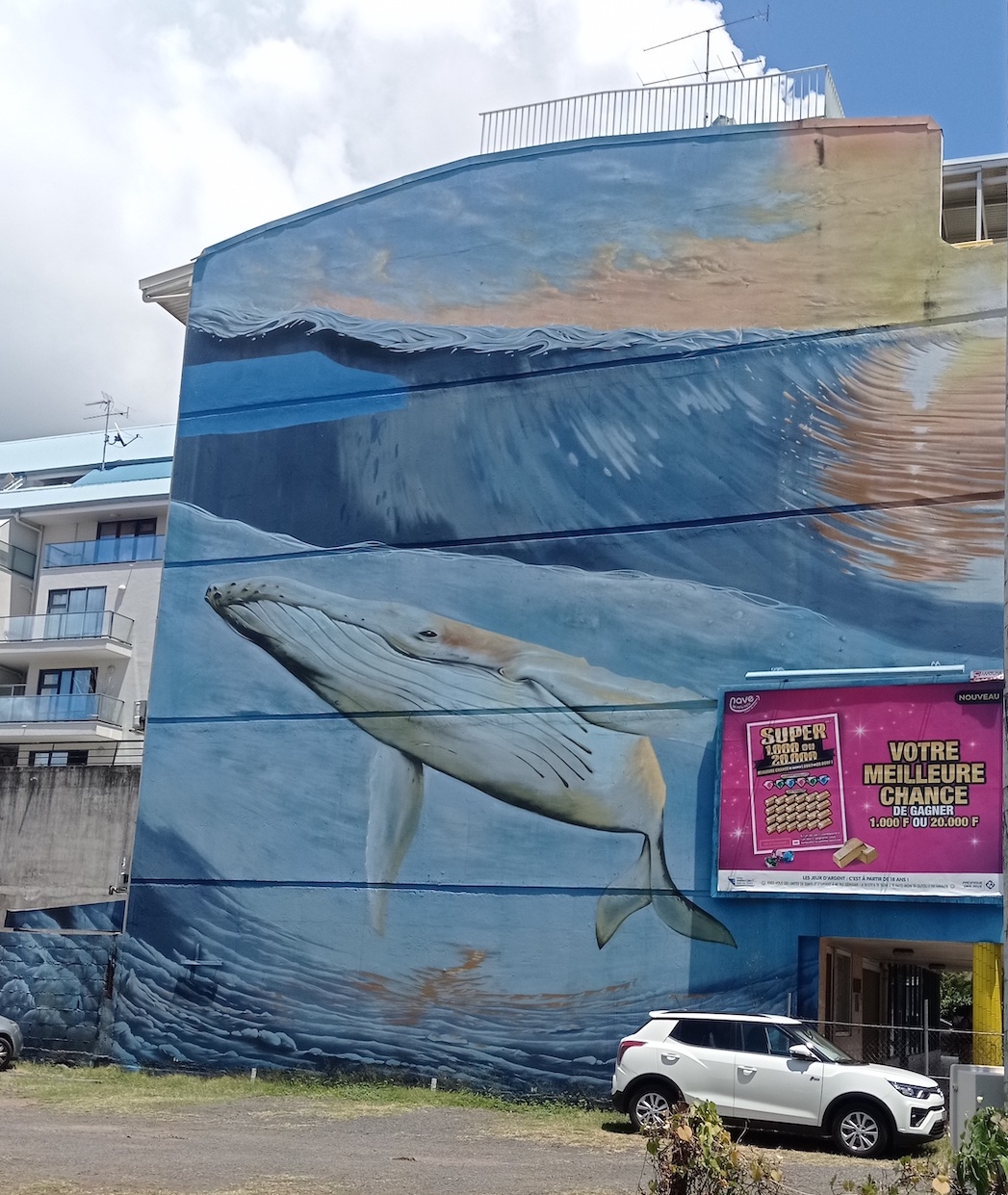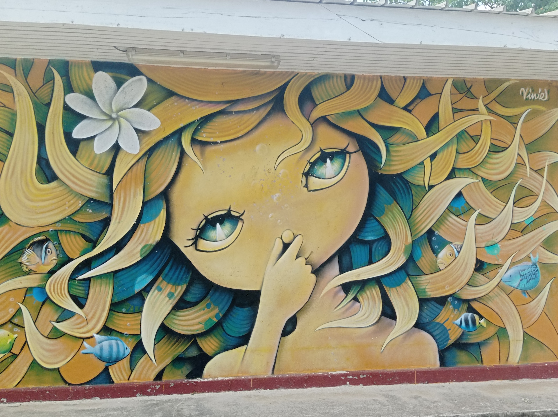 Pour la suite de la journée, nous avons prévu une balade artistique. En effet, nous avions remarqué il y a trois semaines que de nombreuses fresques ornent les murs de la ville. Après une recherche sur internet, nous apprenons qu’elles ont été réalisées durant le Ono’u Festival Tahiti qui a eu lieu à Papeete de 2014 à 2018. C’était un festival de street-art qui réunissait à la fois des artistes de renommée internationale et des artistes locaux fiers de leur culture. C’est, aujourd’hui, un véritable musée à ciel ouvert!