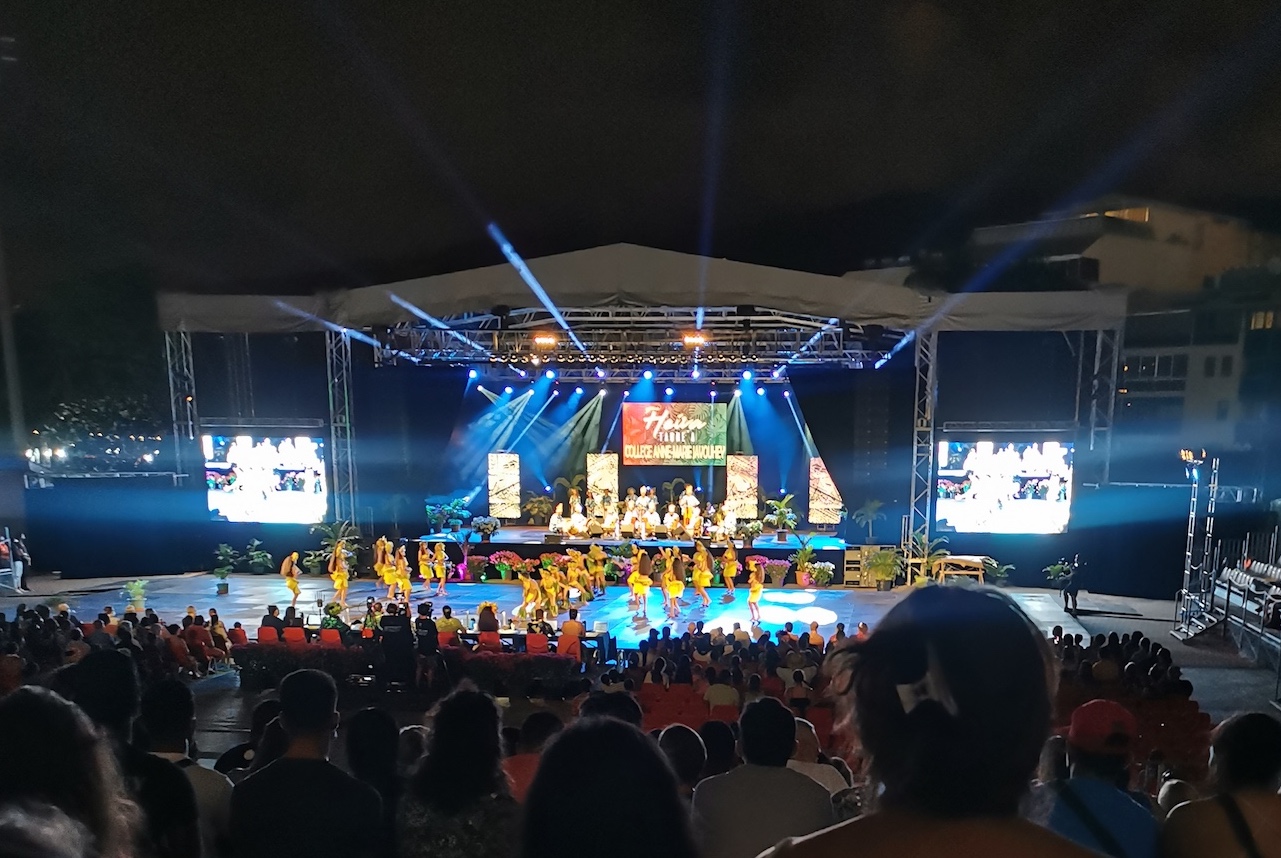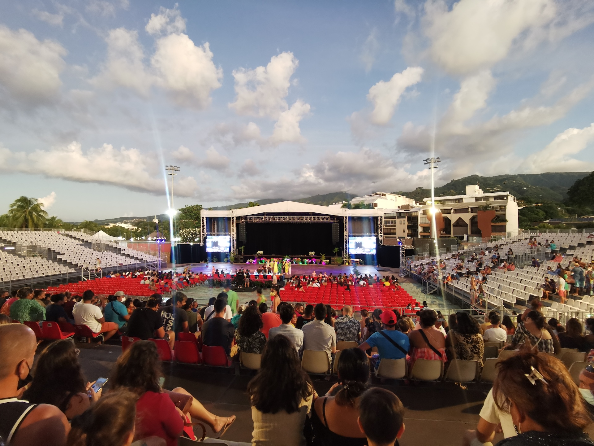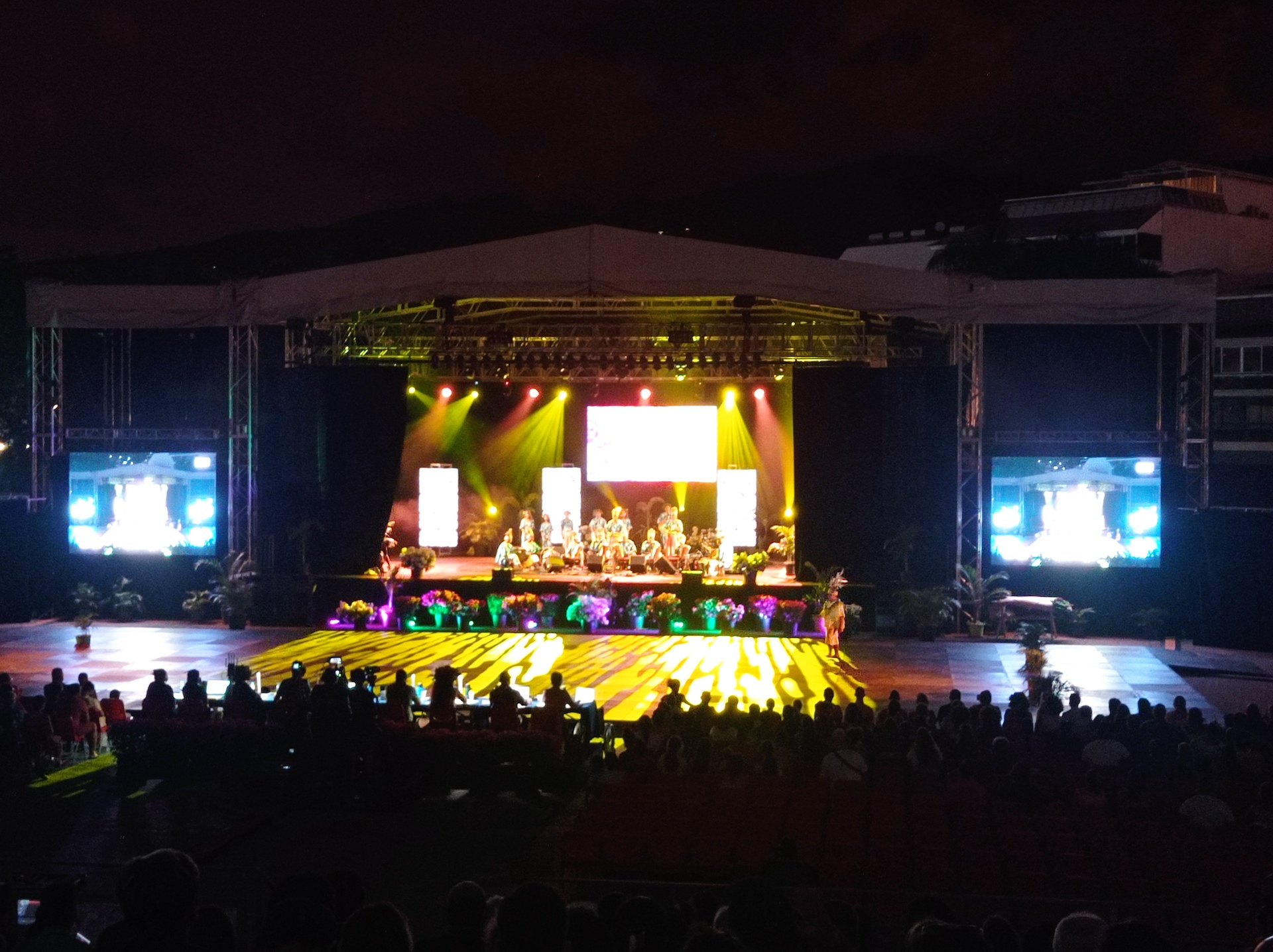 En arrivant, nous constatons rapidement que ce concours est très populaire car les gradins sont pleins! Les discours d’introduction se succèdent, en français et en tahitien… C’est un peu long mais nous apprenons que ce concours met en valeur de nombreux aspects pédagogiques, notamment en musique, en art plastique, en danse, en connaissance de la culture polynésienne, en conduite de projet, en collaboration, etc. Bref, nous n’avons pas retenu tout ce qui a été dit en introduction., les discours traînaient en longeur… Surtout qu’une grande partie était en tahitien 😜 !