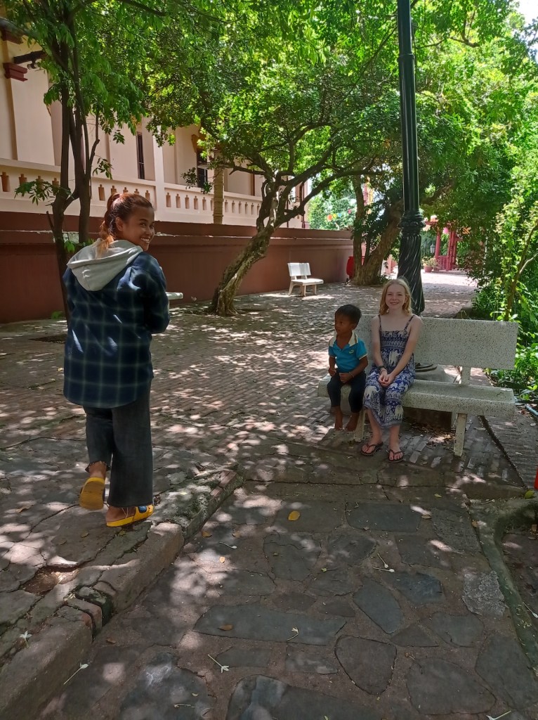 Au cours de la visite, Marine s’assied sur un banc de pierre pour se reposer. A ce moment-là, une femme khmère passe devant elle avec son enfant. Ni une ni deux, elle assied son fils à côté de Marine et elle prend des photos, comme si de rien n’était 🤔.