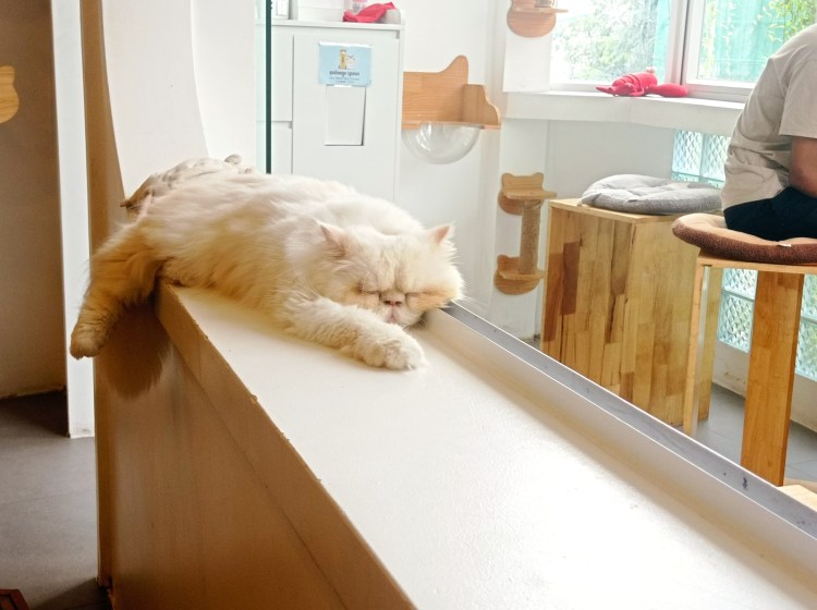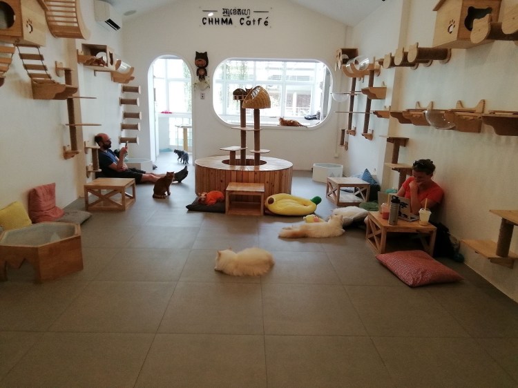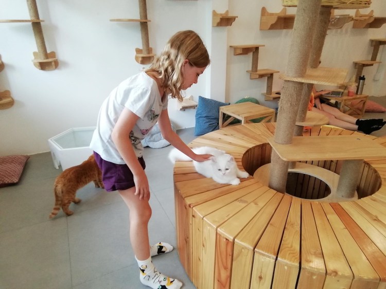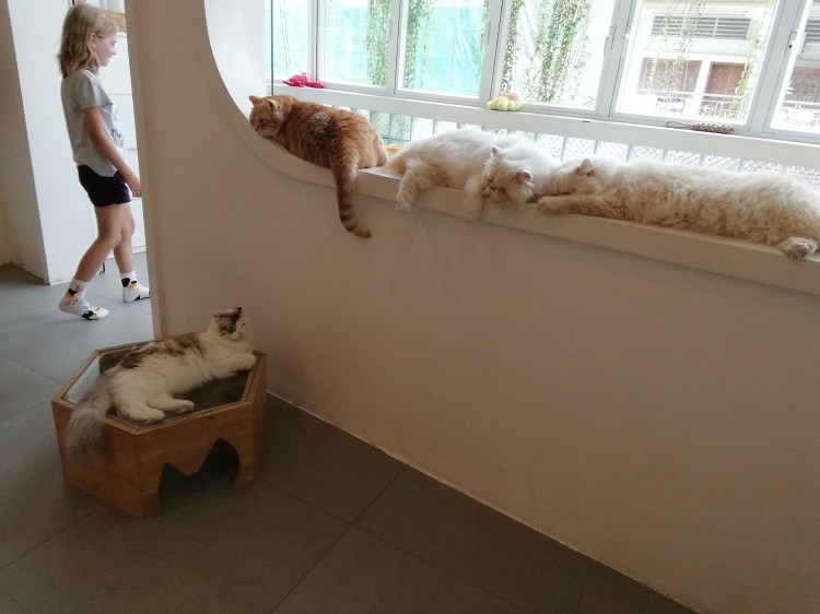 Notre vol est en début de soirée, mais nous devons libérer la chambre pour 11h00. Après quelques efforts de persuasion, Philippe cède et nous nous dirigeons vers le Catfé pour y passer les dernières heures d’attente 🐈. Les filles sont ravies et nous voici avec quatre nouvelles paires de chaussettes chats, car il faut en avoir des neuves pour entrer dans la pièce 🤦🏼♂️🤦🏼♀️.