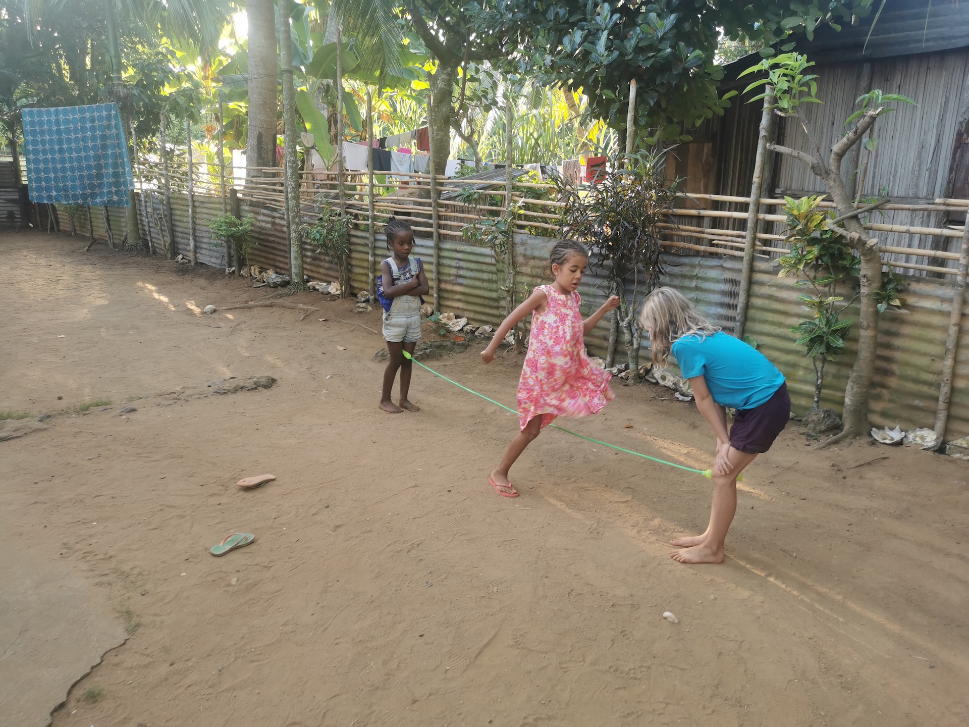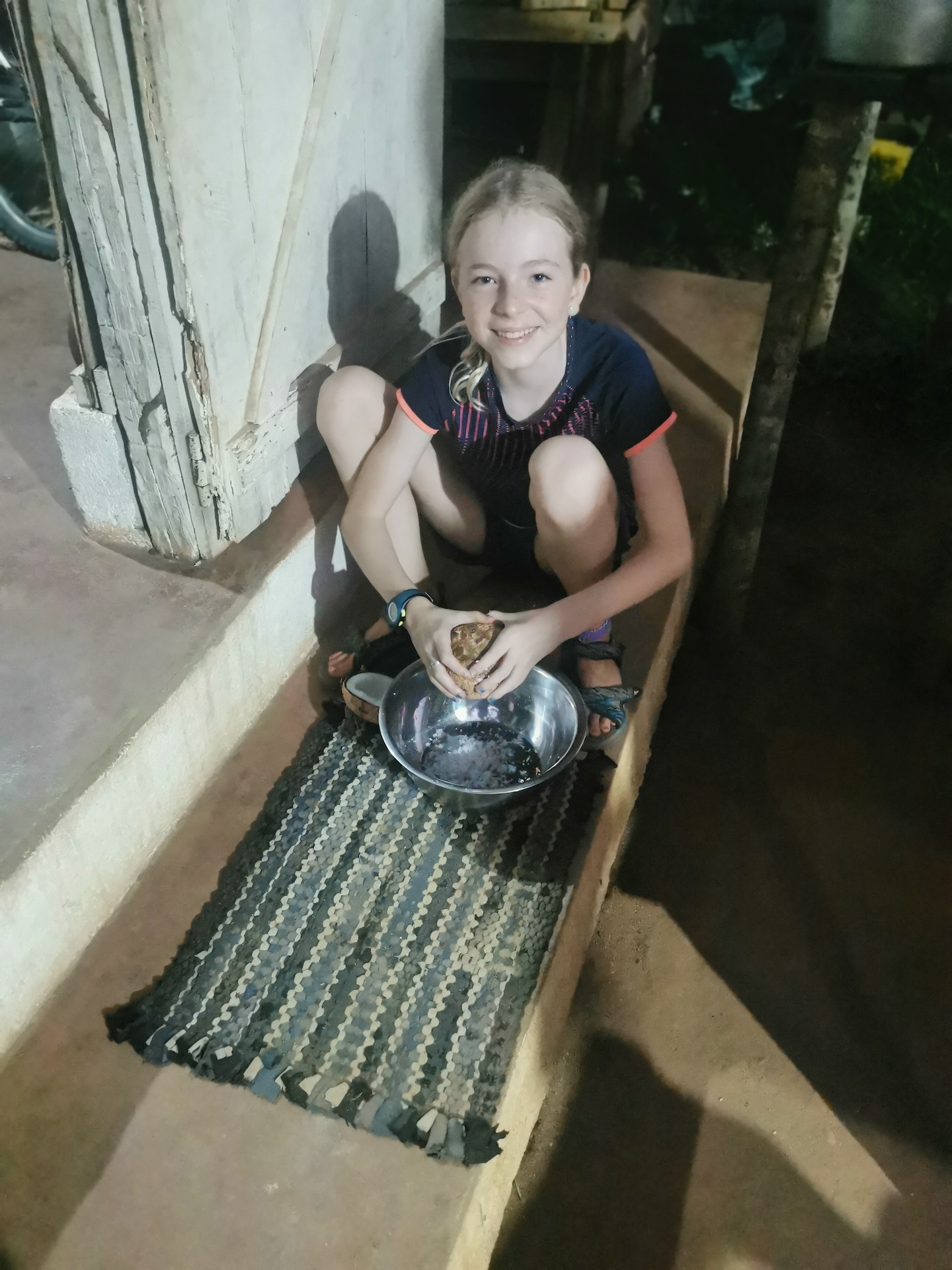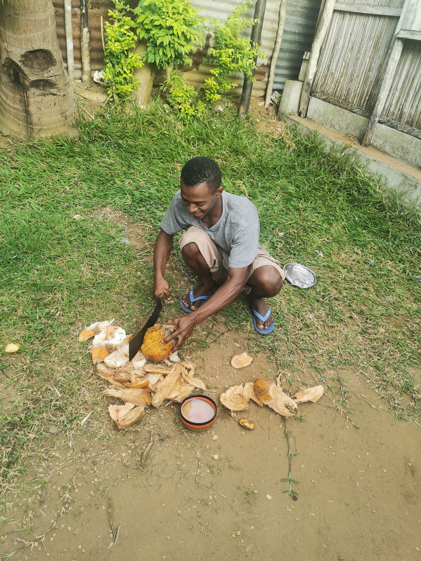 Le jour suivant voit se répéter le programme habituel: école, jeux, etc. Durant ces journées de routine, il n’est pas rare de voir des amis de la famille Ramangalahy passer pour venir discuter avec Nathalia ou Hervé. Aujourd’hui, le propriétaire de la maison vient récolter quelques noix de coco de son arbre 🌴. Il nous en laisse deux-trois que nous sommes ravis de déguster. Une fois qu’il nous l’a ouverte à la machette (plus efficace que le « coup de main » polynésien 🤪), nous nous retrouvons mis à contribution pour la préparer, en utilisant la même manière de faire qu’en Polynésie: râper la chair de coco sur un outil tenu entre les jambes.