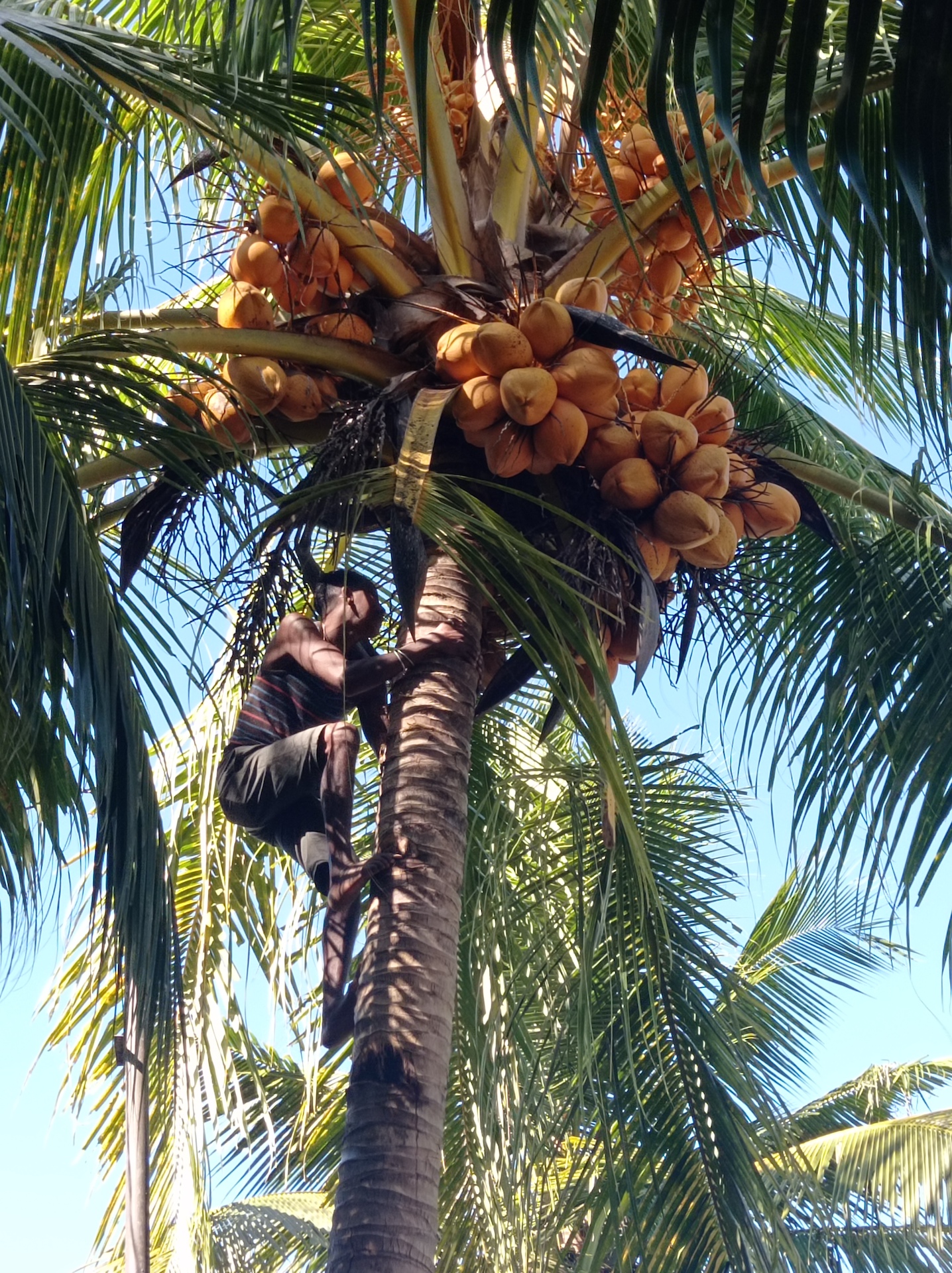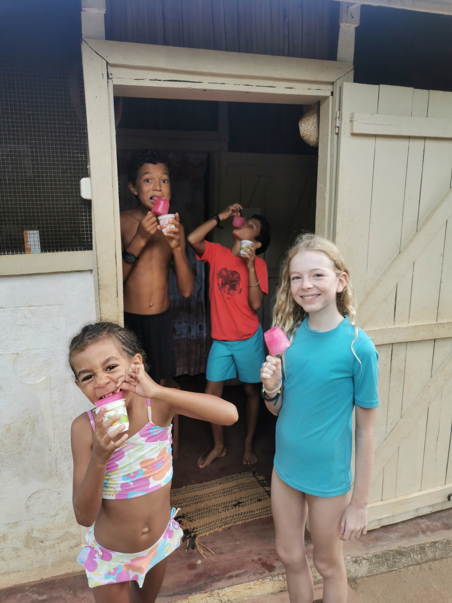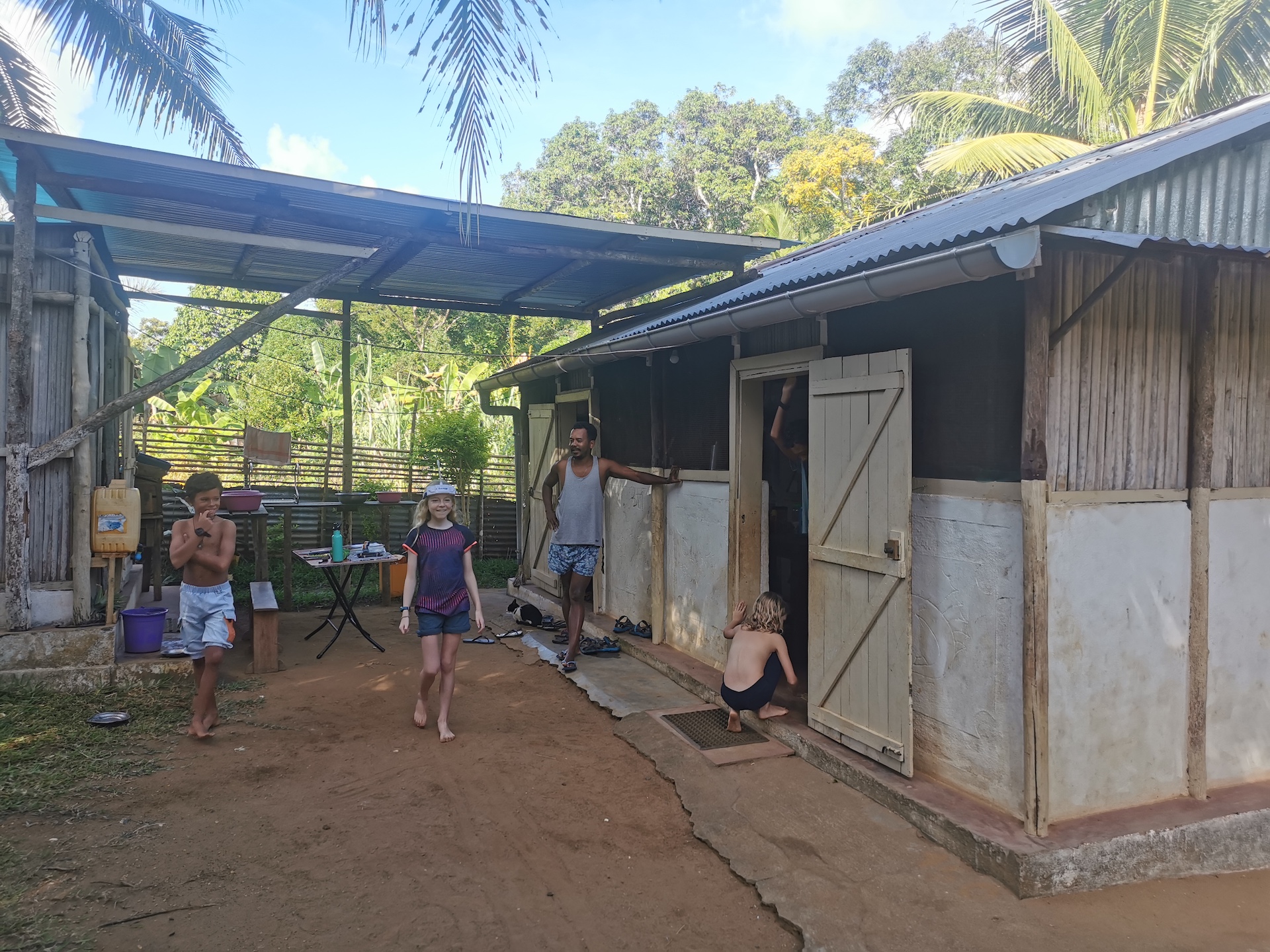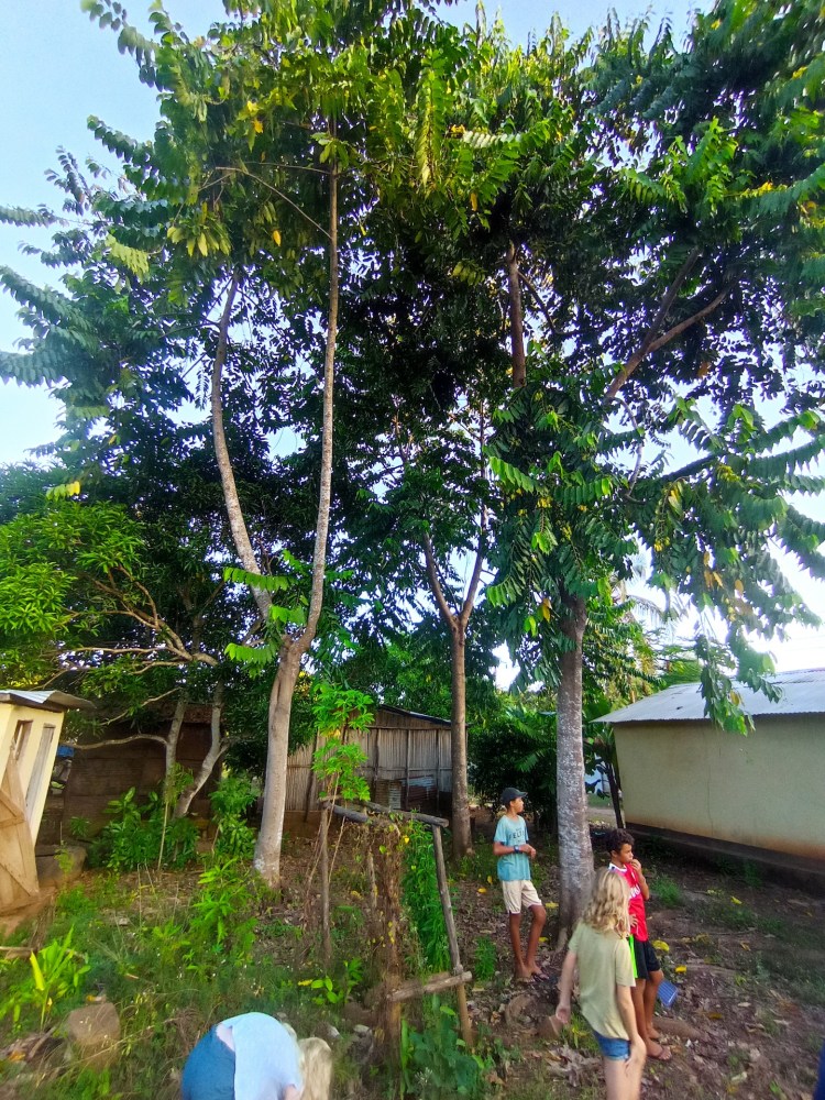Le jour suivant voit se répéter le programme habituel: école, jeux, etc. Durant ces journées de routine, il n’est pas rare de voir des amis de la famille Ramangalahy passer pour venir discuter avec Nathalia ou Hervé. Aujourd’hui, le propriétaire de la maison vient récolter quelques noix de coco de son arbre 🌴. Il nous en laisse deux-trois que nous sommes ravis de déguster. Une fois qu’il nous l’a ouverte à la machette (plus efficace que le « coup de main » polynésien 🤪), nous nous retrouvons mis à contribution pour la préparer, en utilisant la même manière de faire qu’en Polynésie: râper la chair de coco sur un outil tenu entre les jambes.