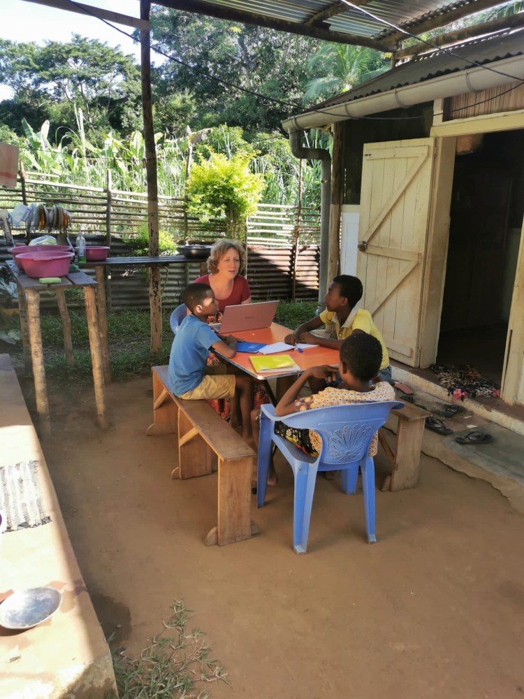 Chaque semaine, Nathalia propose aussi un cours de français intensif à certains jeunes du village. Elle suit des groupes d’âges différents et aujourd’hui, c’est au tour de trois jeunes garçons en fin de scolarité primaire qui doivent passer leurs examens sous peu. Pour rappel, après l’école primaire, les cours sont tous dispensés en français et non plus dans la langue locale. Nous sommes effarés de voir que la plupart des enfants (non seulement du village mais d’une grande partie du pays) ont un niveau très, très basique en français alors qu’ils vont passer au collège dans quelques mois et donc avoir 100% des cours dispensés en français. Cela nous semble très injuste car l’accès aux études supérieures est du coup très limité pour une grande partie des jeunes malgaches! Si un enfant va dans une école privée, ses chances augmentent, mais cela coûte cher et la grande majorité ne peut pas se le permettre.