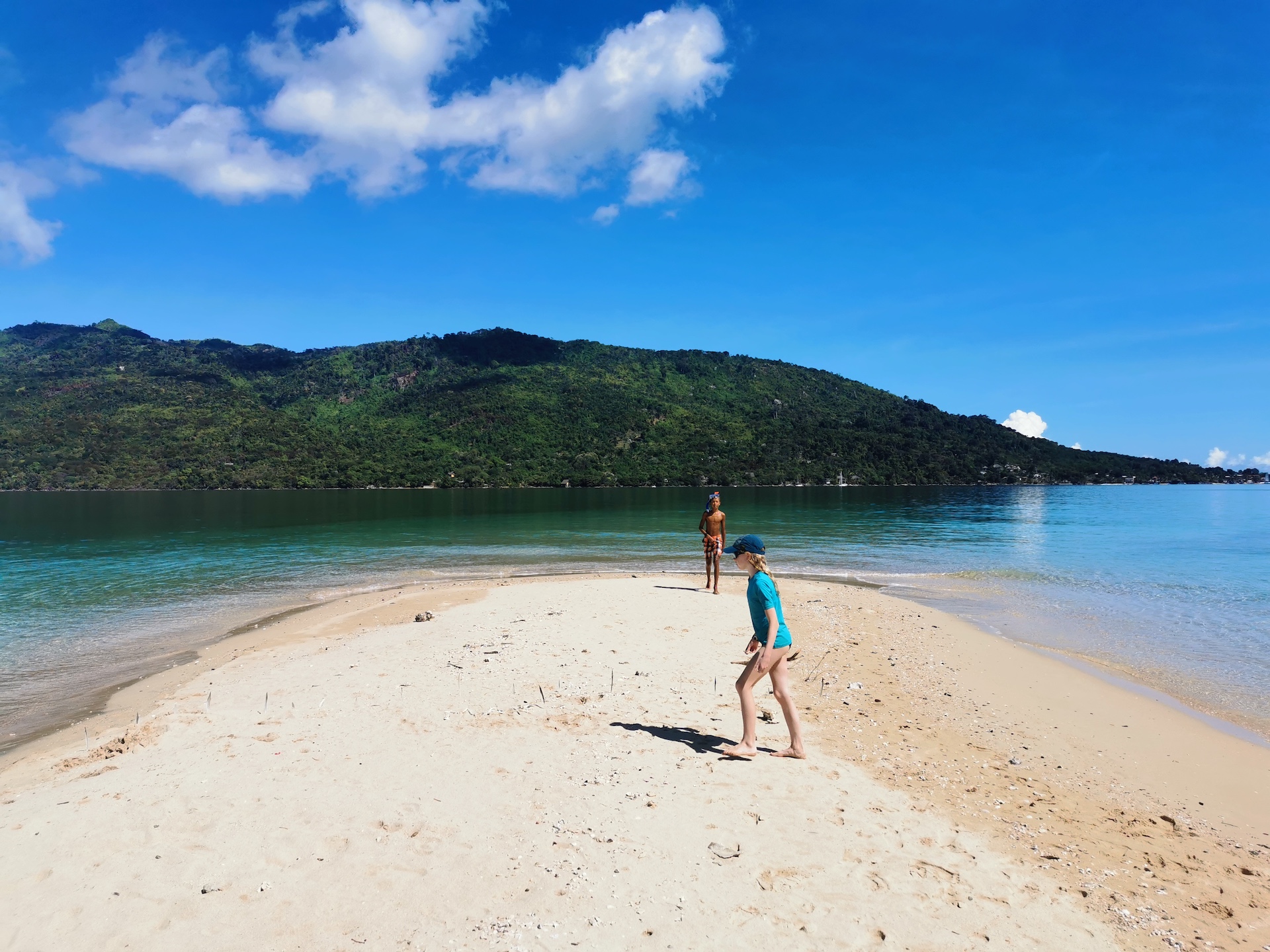 Mais avant de nous y rendre, nous commençons par accoster sur un petit banc de sable au milieu de nulle part. Nous avons vraiment l’impression d’être des naufragés sur une île déserte. L’eau y est magnifique et transparente.
