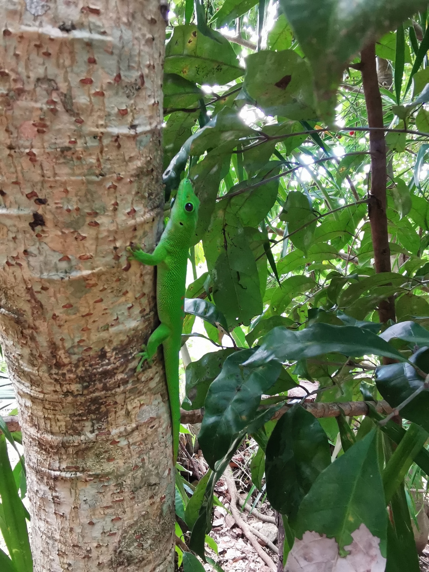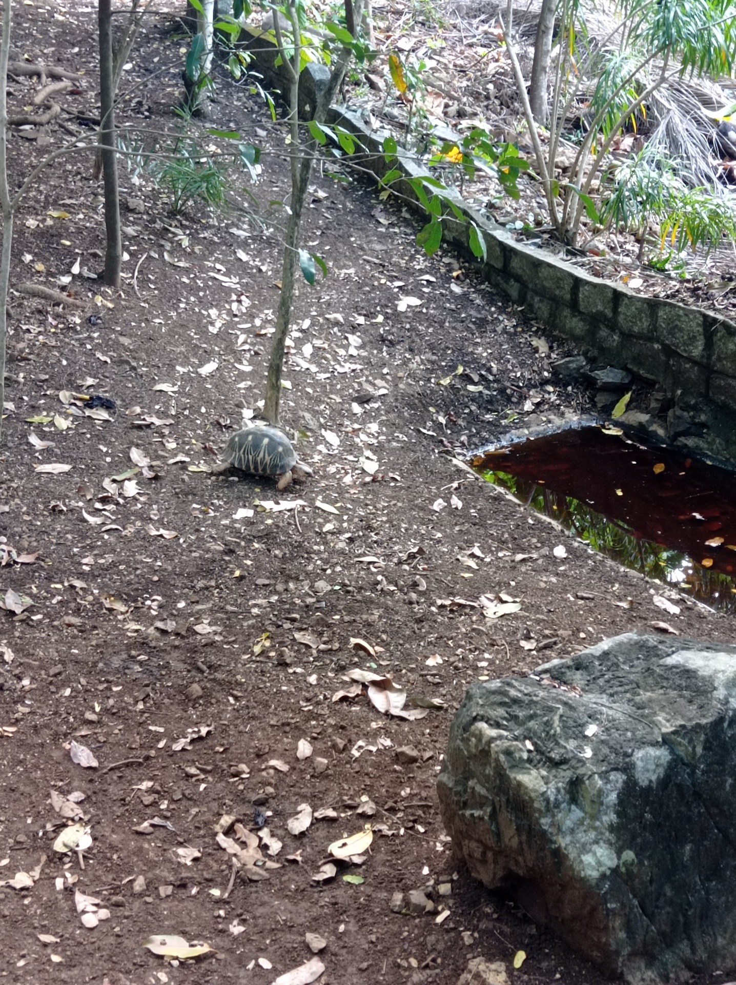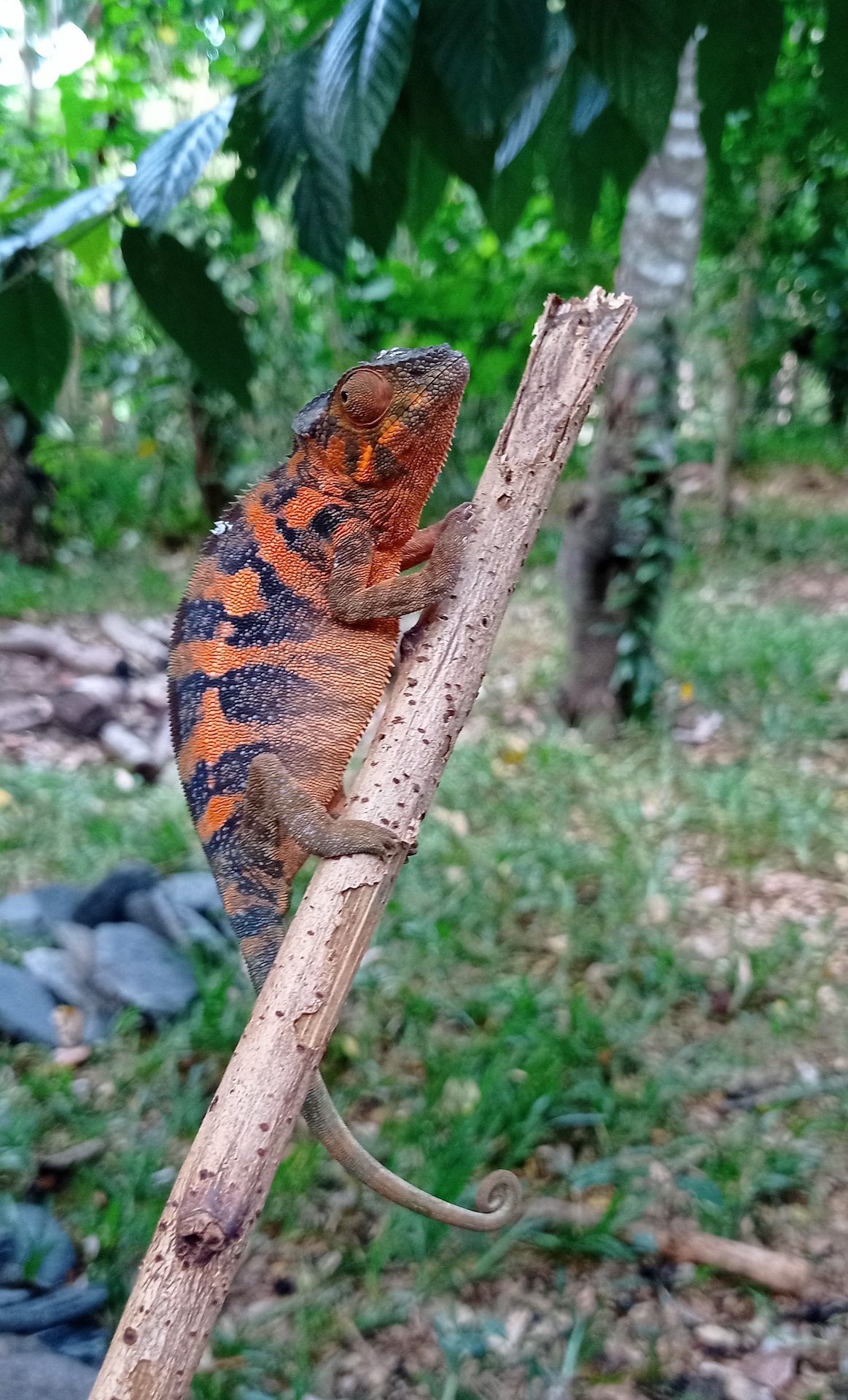 Si les lémuriens sont libres d’aller à leur guise, où ils veulent, ce n’est pas le cas des prochains animaux que nous rencontrons. Il s’agit de quelques tortues terrestres, de différentes tailles, conservées dans des sortes d’enclos entourés d’un muret en pierres 🐢. Certaines sont très, très grandes et elles ressemblent beaucoup à celles que nous avions découvertes aux Galapagos! Bon, nous n’avons retrouvé qu’une photo de ces tortues et c’est une toute petite qui est dessus 😜. Nos guides nous montrent encore une fosse dans laquelle se trouvent deux boas 🐍(un peu glauque…), quelques lézards et un joli caméléon orangé. Notre guide nous explique que leur langue peut être très longue, parfois plus longue que leur queue et qu’elle possède une sorte de petite ventouse au bout pour attraper les proies!
