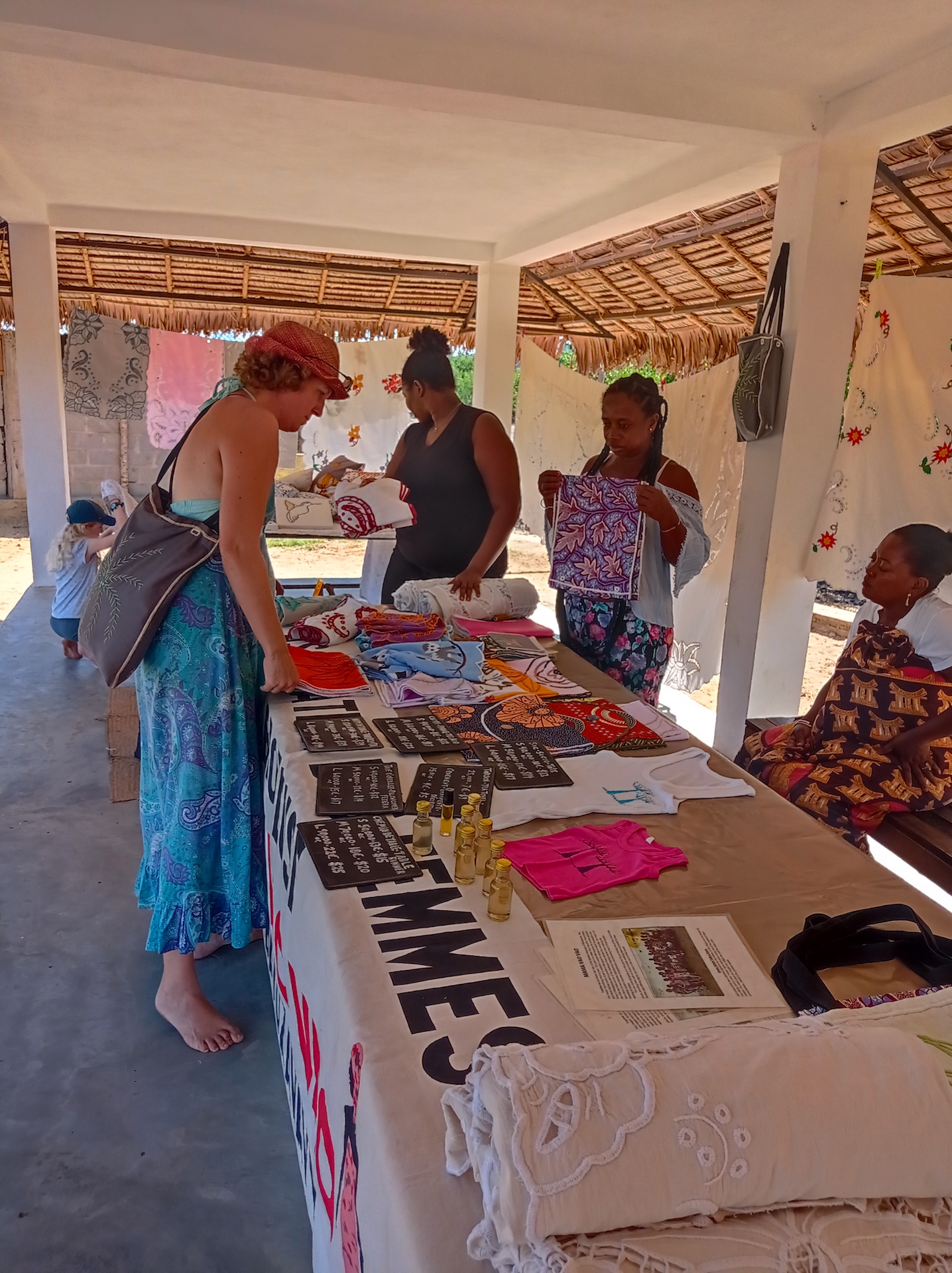 Avant de quitter le village pour partir sur la côte ouest de Nosy Be, nous passons encore visiter les femmes de l’association Mama Vao Vao. En sakalava, Vao Vao signifie « quelque chose de frais ou de nouveau ». Il s’agit d’une association qui aide les femmes et les filles malgaches de la région à vendre de manière profitable de magnifiques pièces d’artisanat dessinées et cousues de leurs mains. Cette association permet de leur apporter un espace sécurisé où travailler. La prostitution et le trafic sexuel d’enfants sont malheureusement deux problèmes auxquels les femmes de Nosy Be sont confrontées chaque jour. Tout le monde pense à la Thaïlande lorsqu’on parle du tourisme sexuel, mais il faut savoir que Nosy Be est apparemment également connue pour cela 😔… L’objectif de cette association est donc de préserver les femmes de la prostitution et d’aider celles qui souhaitent en sortir. Grâce à leurs confections et leurs ventes, elles reçoivent un salaire décent qui les aide à subvenir aux besoins de leurs familles. Elle retrouvent aussi leur dignité et elles sont valorisées par le fruit de leur travail.