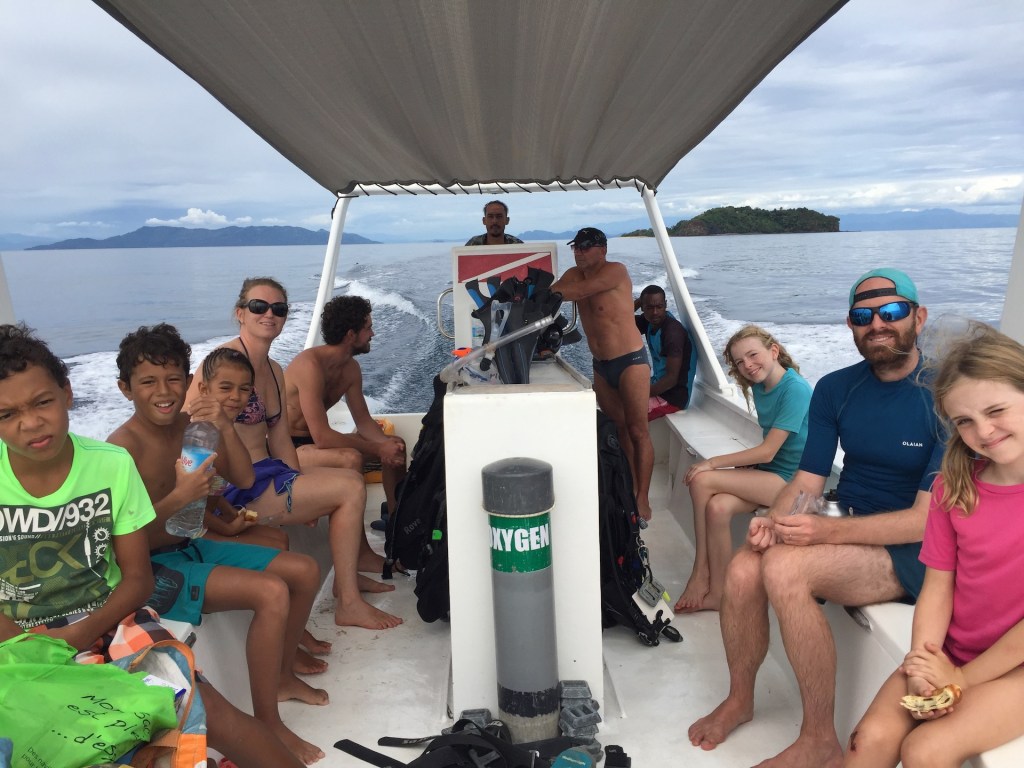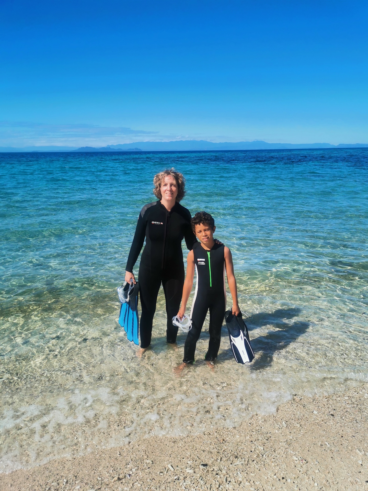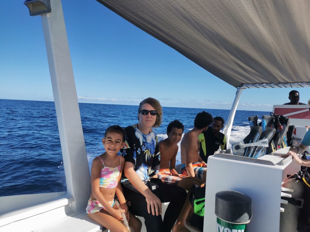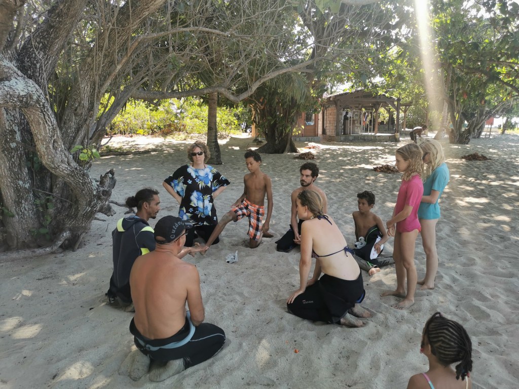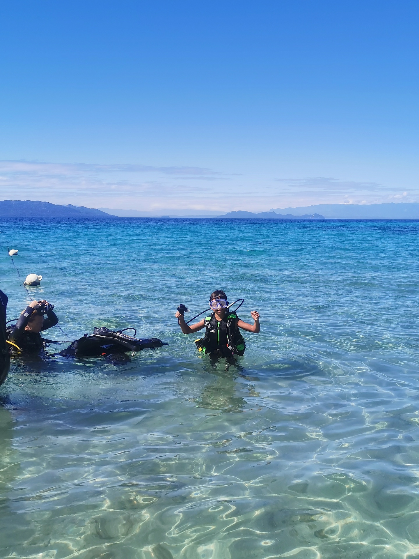 Arrivés sur une île magnifique et quasiment déserte, nous commençons par payer nos droits d’entrée puis le petit groupe suit une formation théorique pour la plongée qui va suivre. Un rappel bienvenu pour Gabrielle, qui appréhende un peu de ne plus se rappeler tout ce qu’il faut! A la base, ils avaient décidé que Gabrielle n’aurait pas de « budy » attribué et qu’elle dépendrait de celui attribué à Nathalia. Toutefois, Nathalia étant en « baptême » de plongée, le moniteur doit constamment la tenir… ce qui compliquerait les choses si Gabrielle venait à avoir un problème sous l’eau 😅! Pour finir, ils ont trouvé un troisième moniteur qui plongera avec eux. Rija et Andry plongeront l’un à la suite de l’autre, donc ils peuvent se partager le même moniteur.