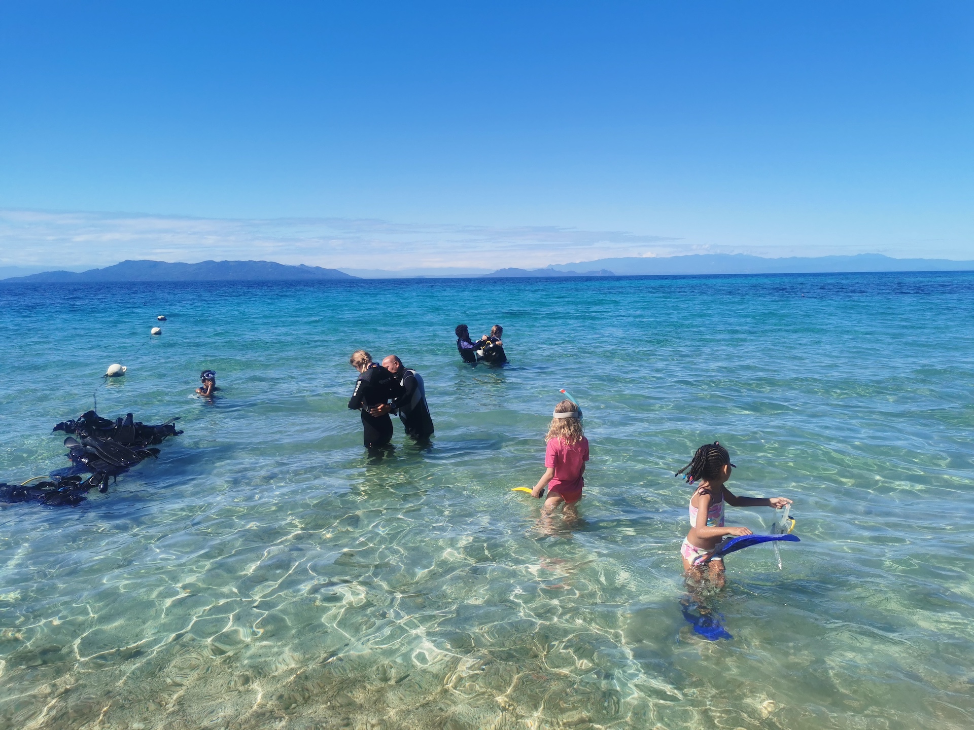 Une fois les règles et les gestes de base expliqués, ainsi que le déroulement de la plongée, tout le monde va s’équiper avec son matériel. Combinaison, bonbonne, etc. pour les plongeurs, masque, tuba et palmes pour les snorkelers 🤿.