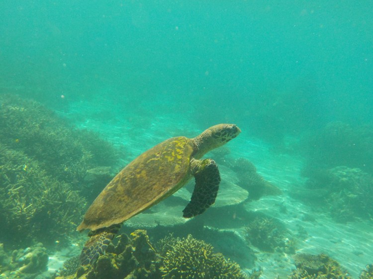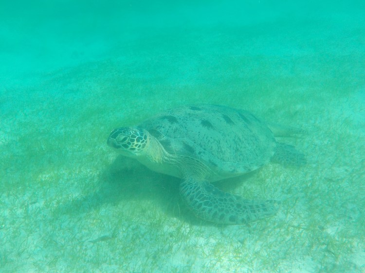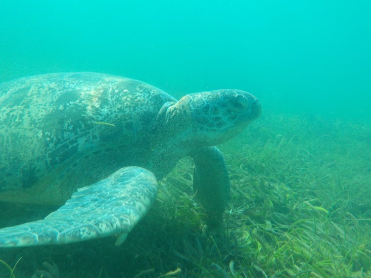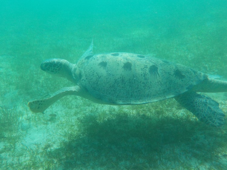 Arrivés proches de l’île, nous nous mettons à l’eau pour aller nager avec des tortues marines. Nous en avons déjà vu plusieurs lors de notre sortie à Nosy Tanikely mais, cette fois-ci, celles que nous découvrons sont encore plus grosses et imposantes 🤩. Ce sont de loin les plus grandes que nous ayons vues depuis le début de notre voyage (à part leurs cousines terrestres des Galapagos 🐢)! C’est réellement très impressionnant de nager à côté de ces mastodontes, qui nous ignorent royalement tandis qu’elles continuent de vaquer à leurs occupations (principalement manger…).