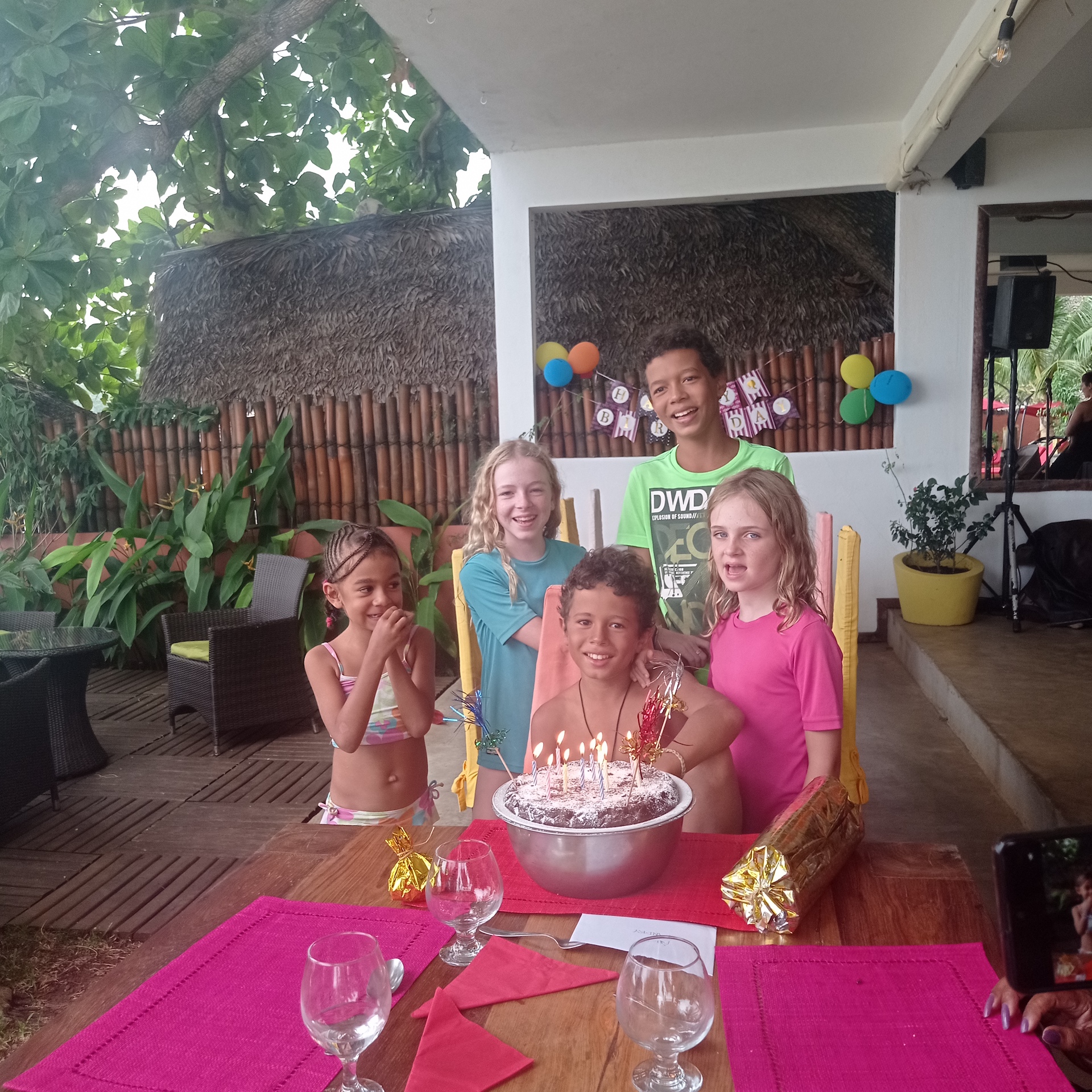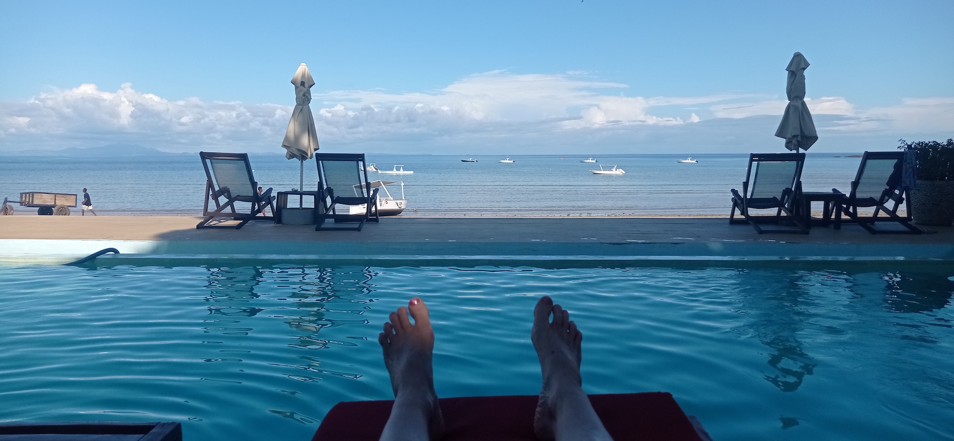 Après cette inoubliable matinée sous-marine, nous rentrons en début d’après-midi à Ambondrona. Nos ventres commençant sérieusement à gronder, nous prenons le dîner dans l’hôtel Nosy Lodge qui se trouve juste à côté de notre auberge de jeunesse. C’est un très bel hôtel avec piscine 🤩. C’est l’occasion de manger un bon repas d’anniversaire et surtout un délicieux gâteau préparé par Nathalia pour fêter comme il se doit le jubilaire 🎂! Nous pouvons également profiter de la piscine et de ses transats, même si l’eau est plutôt très fraîche! Comme les touristes sont encore rares, nous n’avons pas vraiment de concurrence pour les transats ou la baignade 😎.